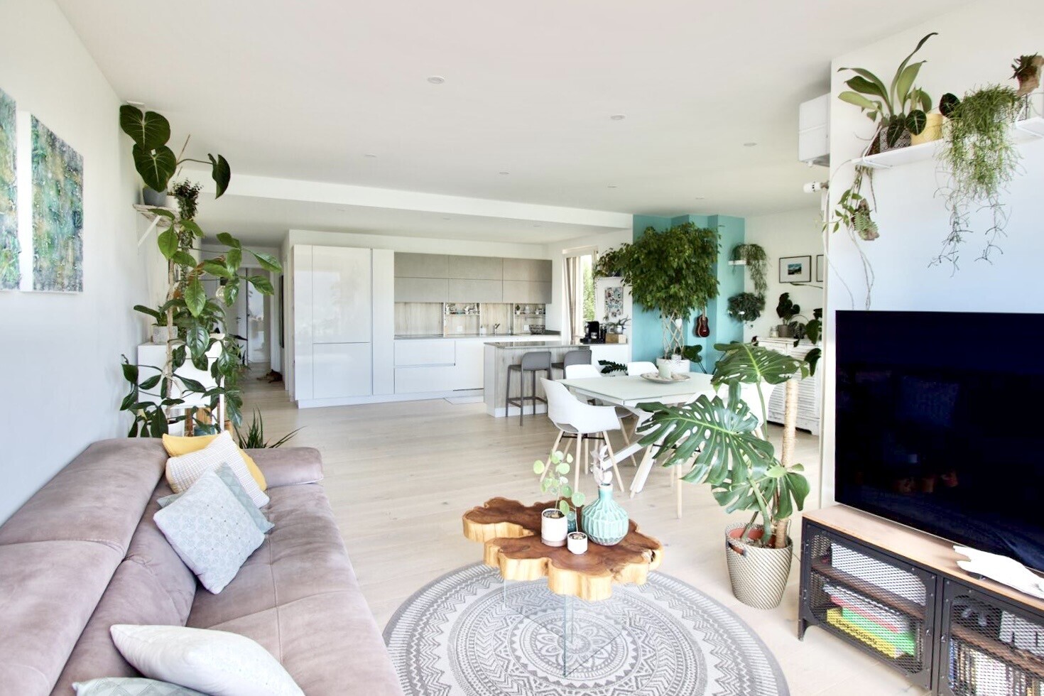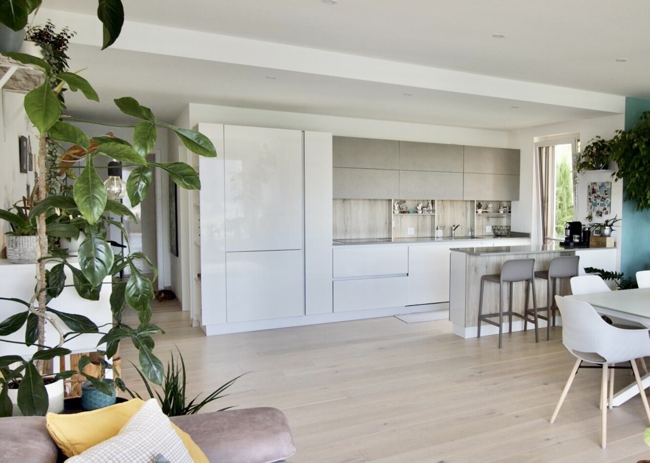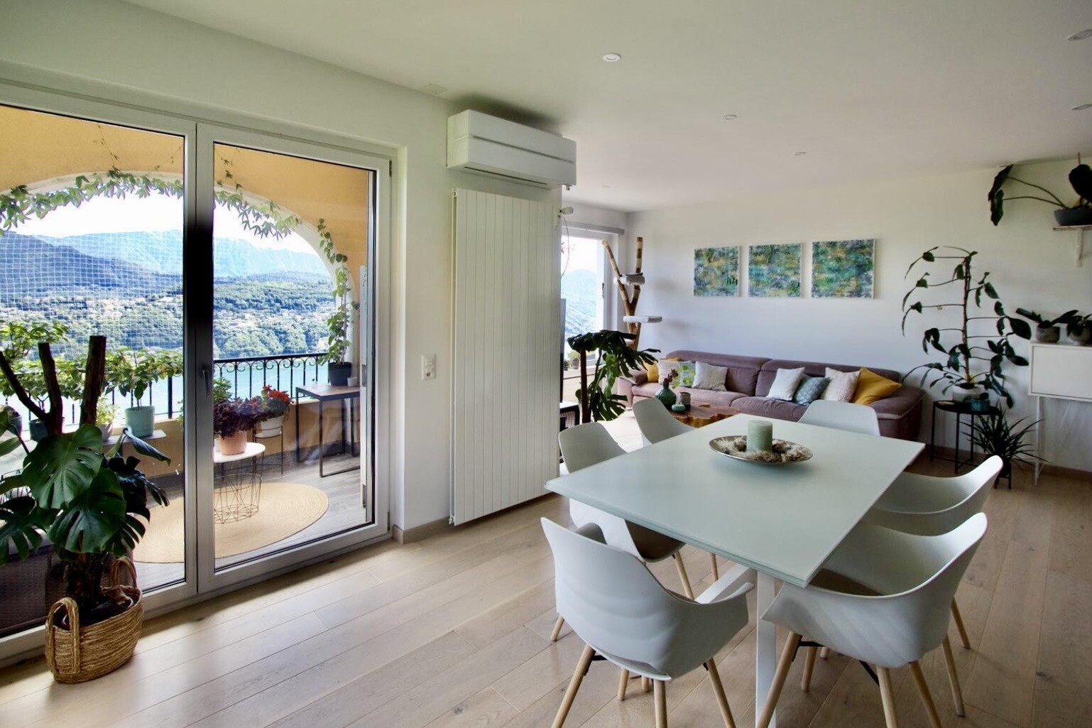 Segue un luminoso soggiorno/sala da pranzo dotato di aria condizionata, con cucina a vista completamente accessoriata (forno, piano cottura a induzione, lavastoviglie, frigorifero e congelatore) e pratico banco bar che offre un ampio piano di lavoro, con uscita diretta sulla terrazza con splendida vista aperta sui monti e sul lago.