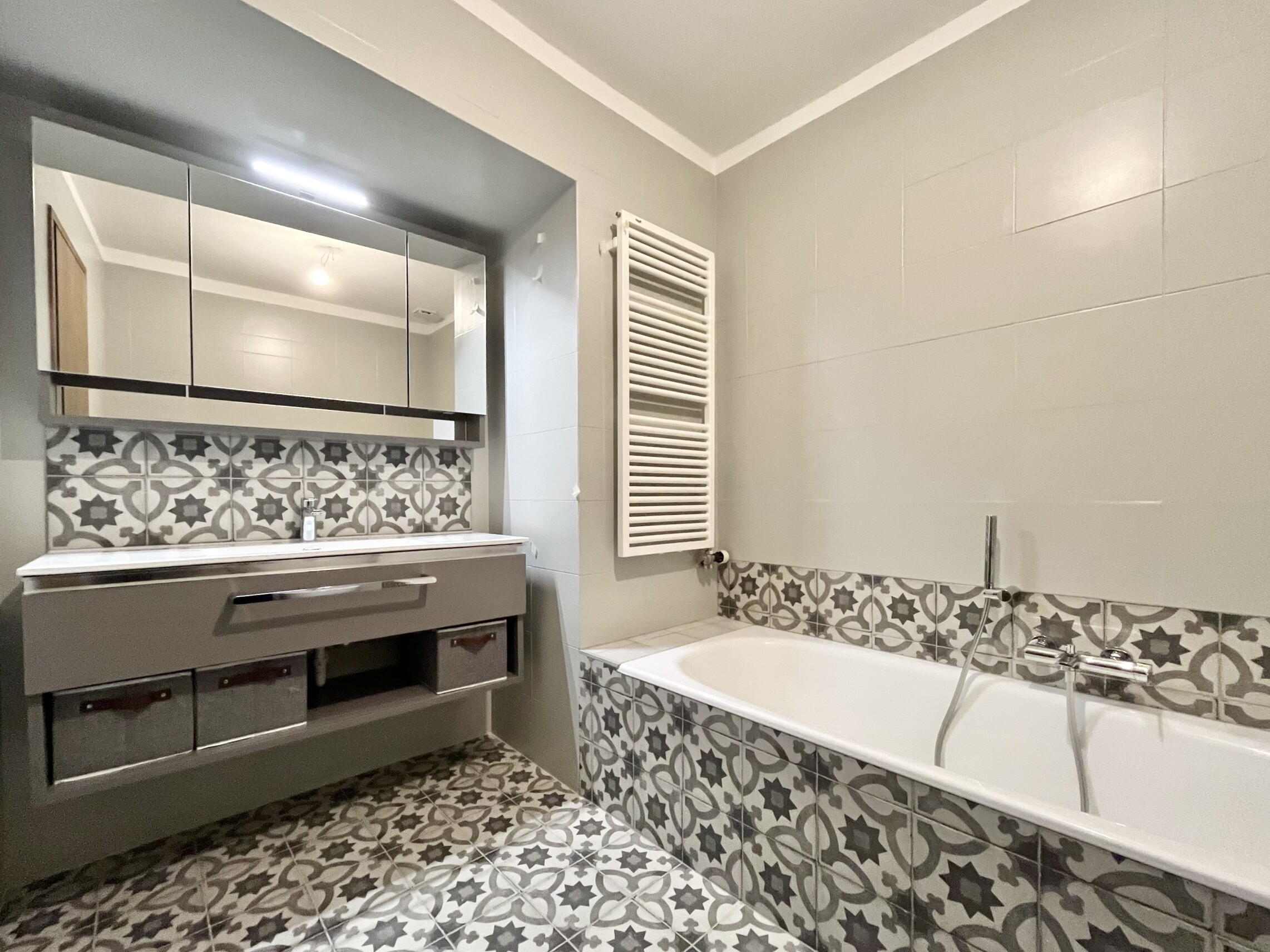 I due bagni sono moderni e ben rifiniti con piastrelle di design: bagno padronale con vasca, WC, lavabo e bidet e il secondo bagno con doccia.