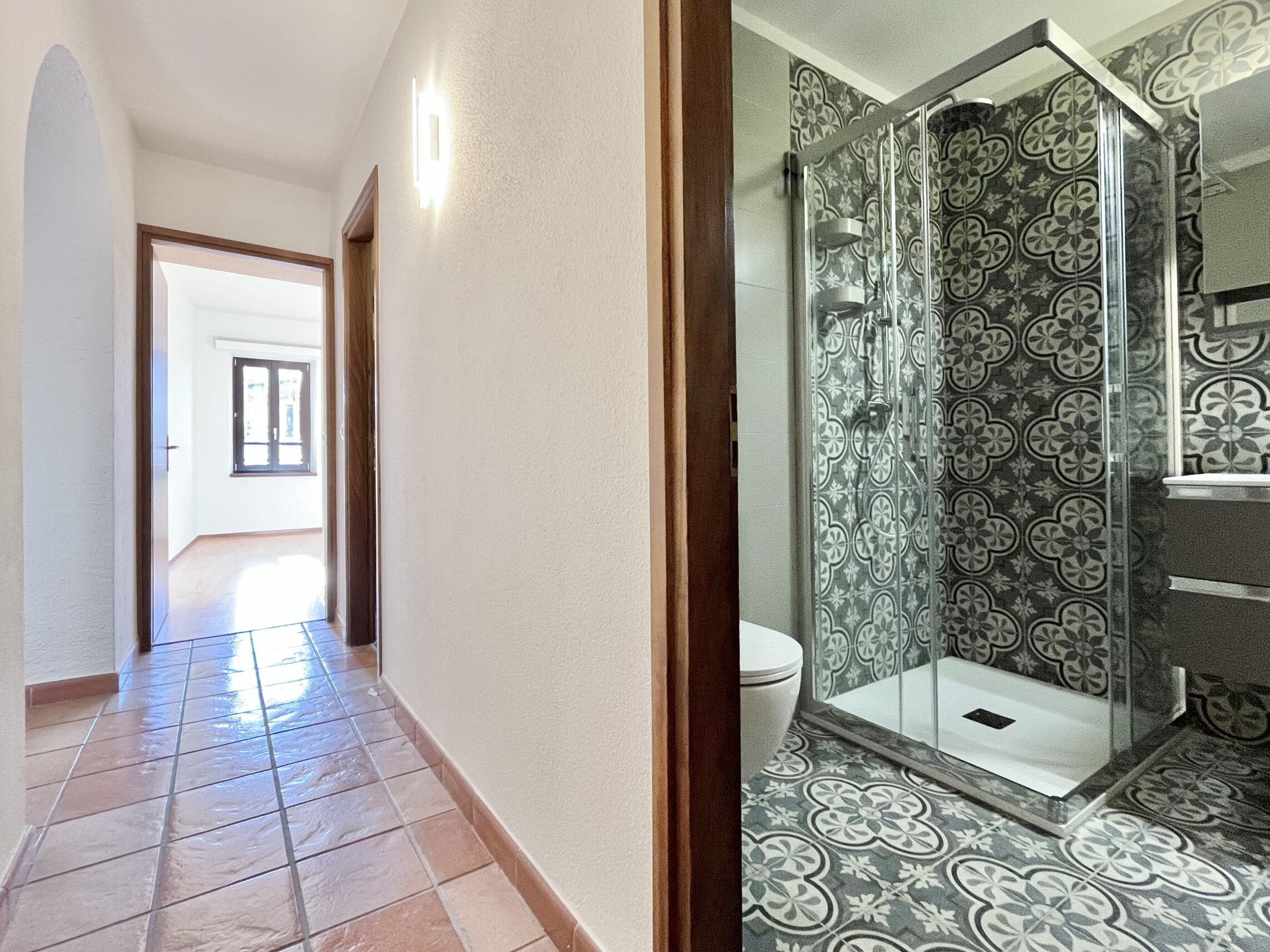 Dall'ingresso saliamo qualche gradino fino al primo piano, dove il corridoio termina in un comodo atrio con armadi a muro e un ripostiglio.