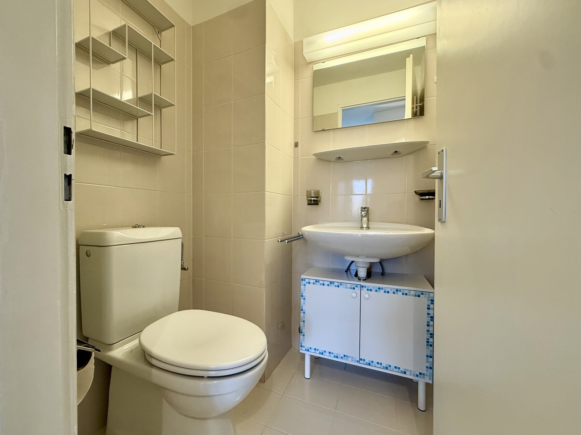 Ingresso su atrio con disimpegno e armadi a muro, bel soggiorno di 18 mq, con accesso al primo balcone, cucina separata e ben attrezzata con accesso al secondo balcone; bagno per ospiti con wc sospeso.