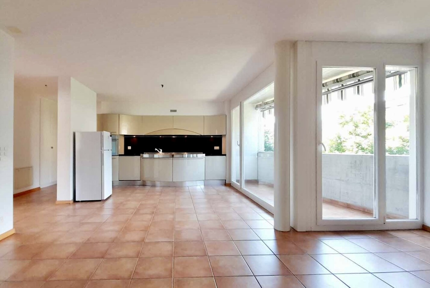 Atrio d'ingresso con armadi a muro sulla zona living, composta da una cucina aperta e molto ampia dotata di piano di cottura, lavastoviglie, forno e frigorifero, ed un luminoso soggiorno con uscita sul terrazzo.