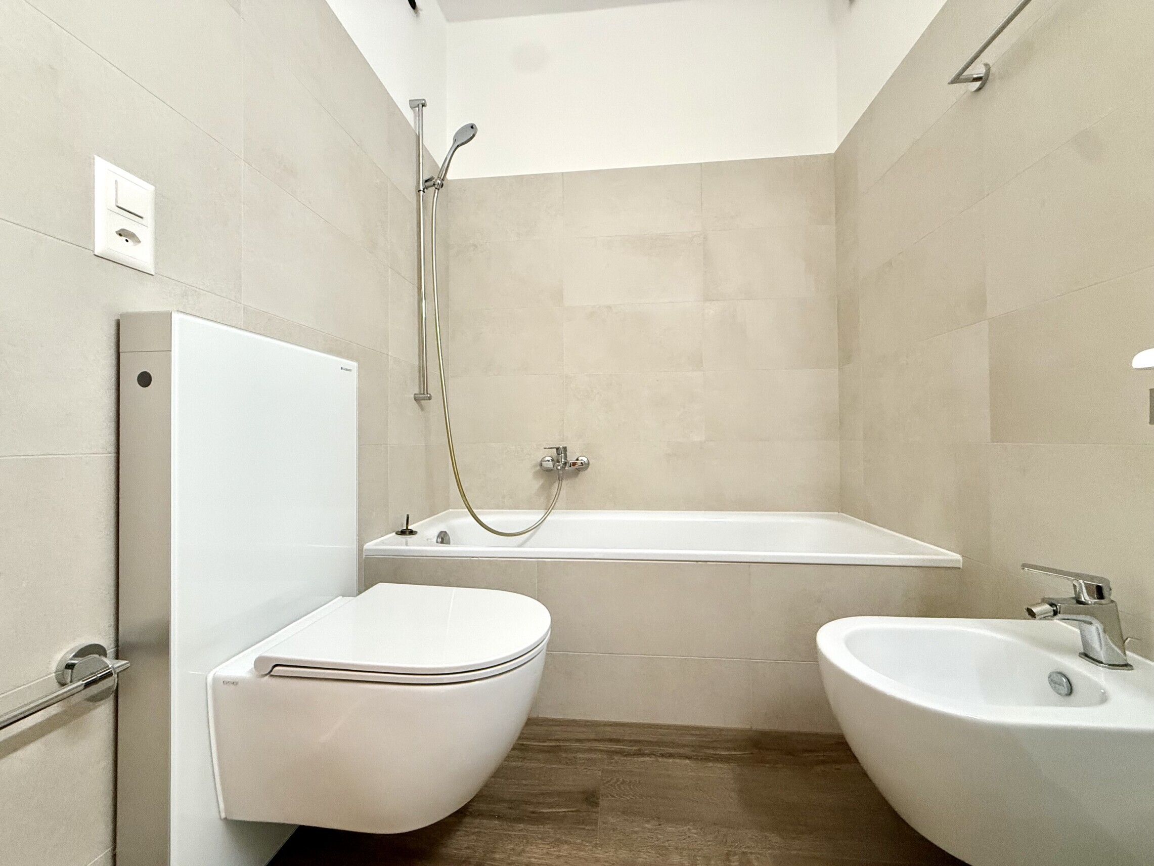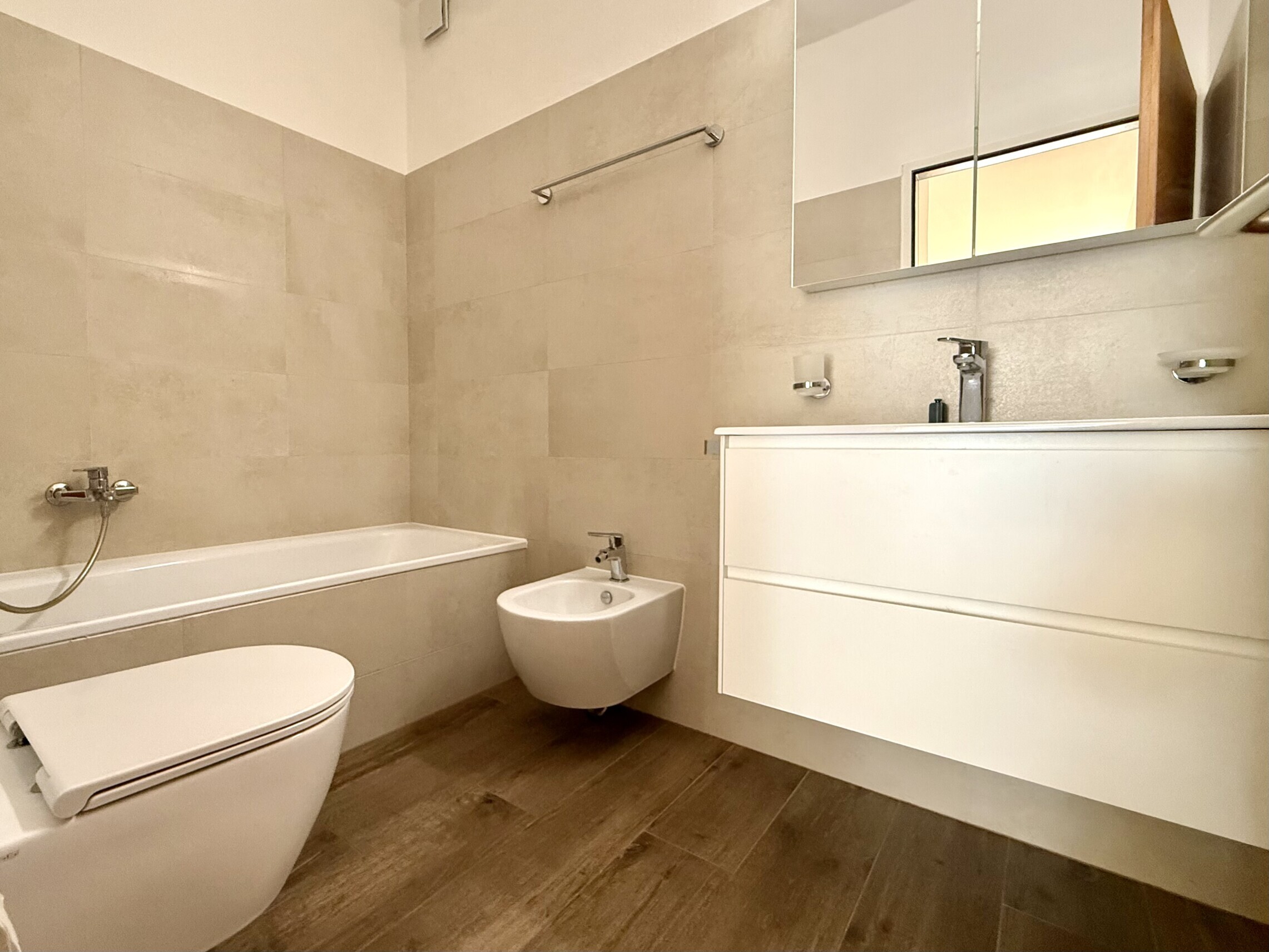 - Zona notte con due ampie camere da letto ben illuminate e con armadi a muro in legno molto ben tenuti e bagno principale con vasca e sanitari sospesi.