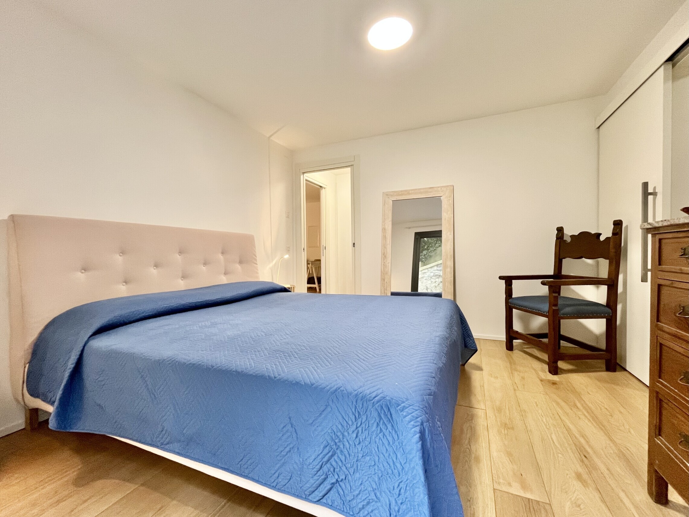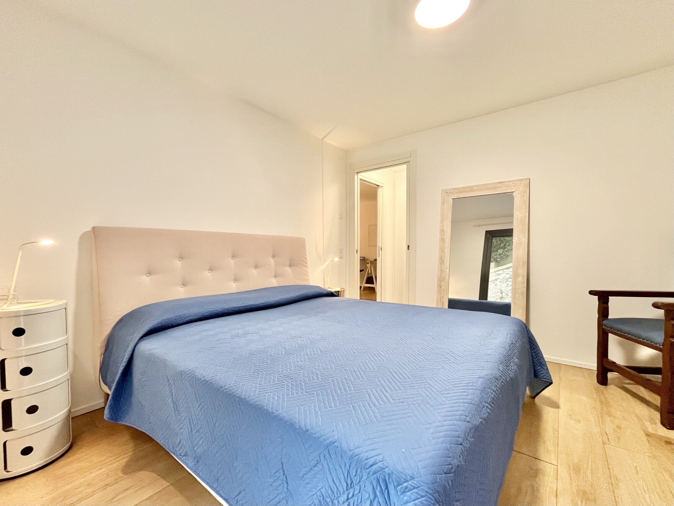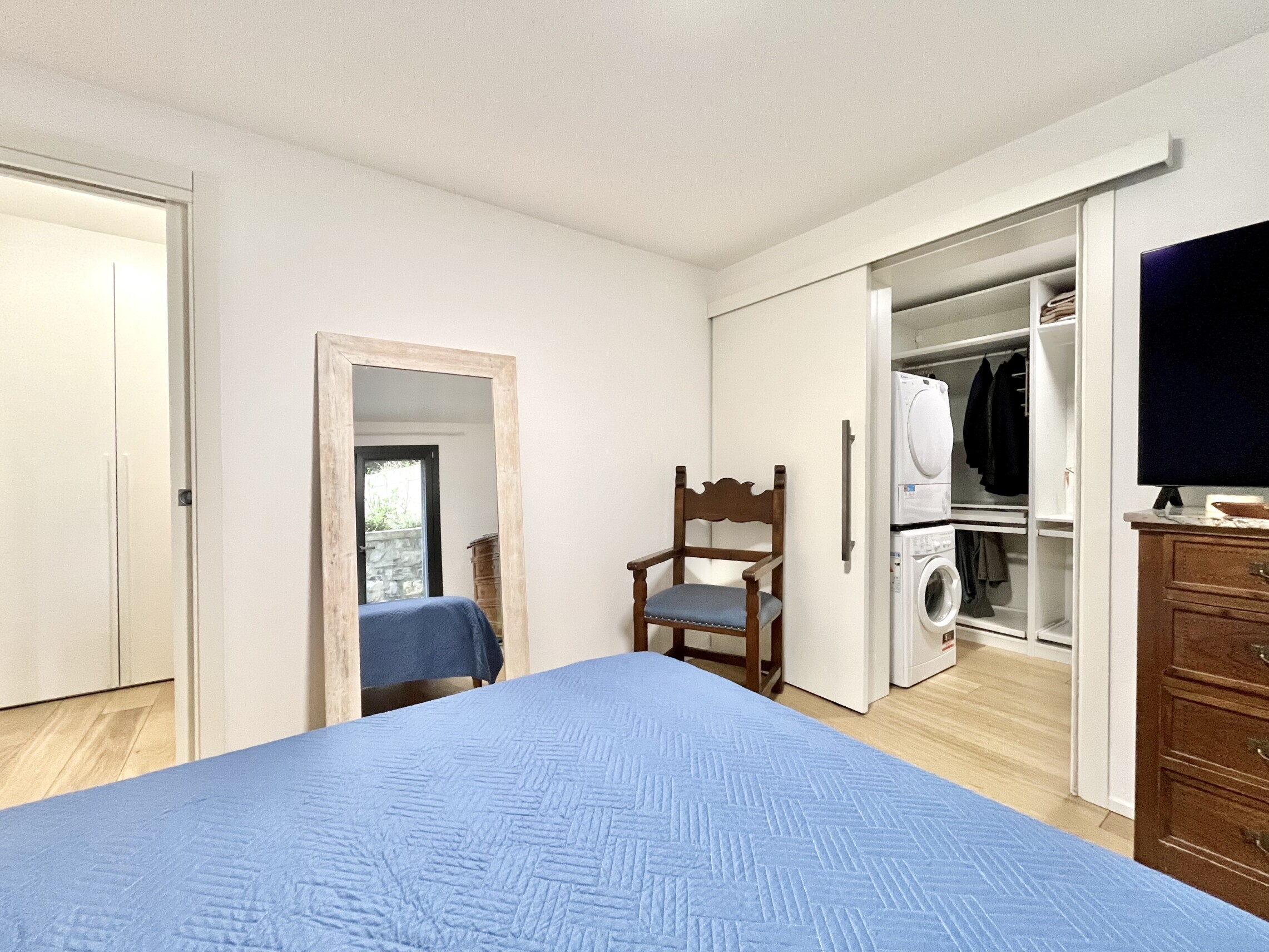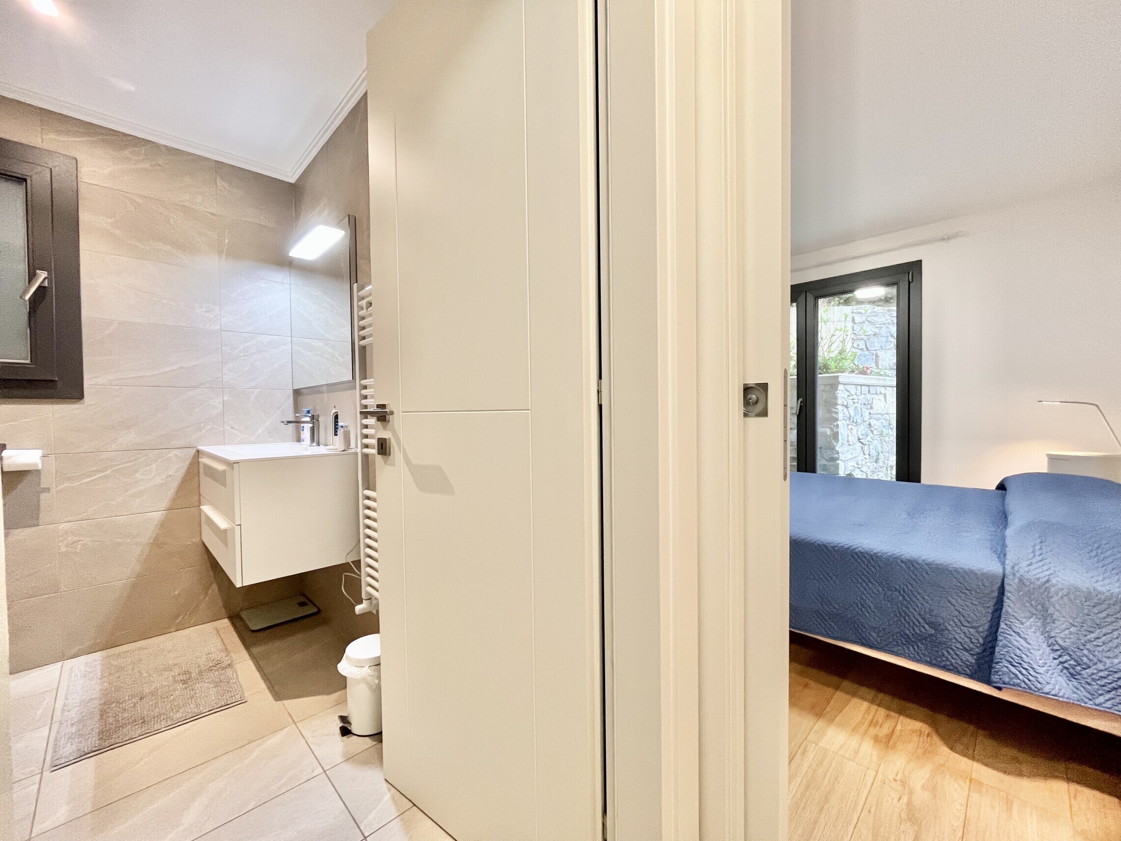 La zona notte è separata con atrio con armadio a muro, seguito dal bagno finestrato con lavabo, grande doccia, wc e bidet. La camera da letto ha accesso diretto al giardino ed è dotata di una cabina armadio molto spaziosa, che include anche una colonna lavasciuga.