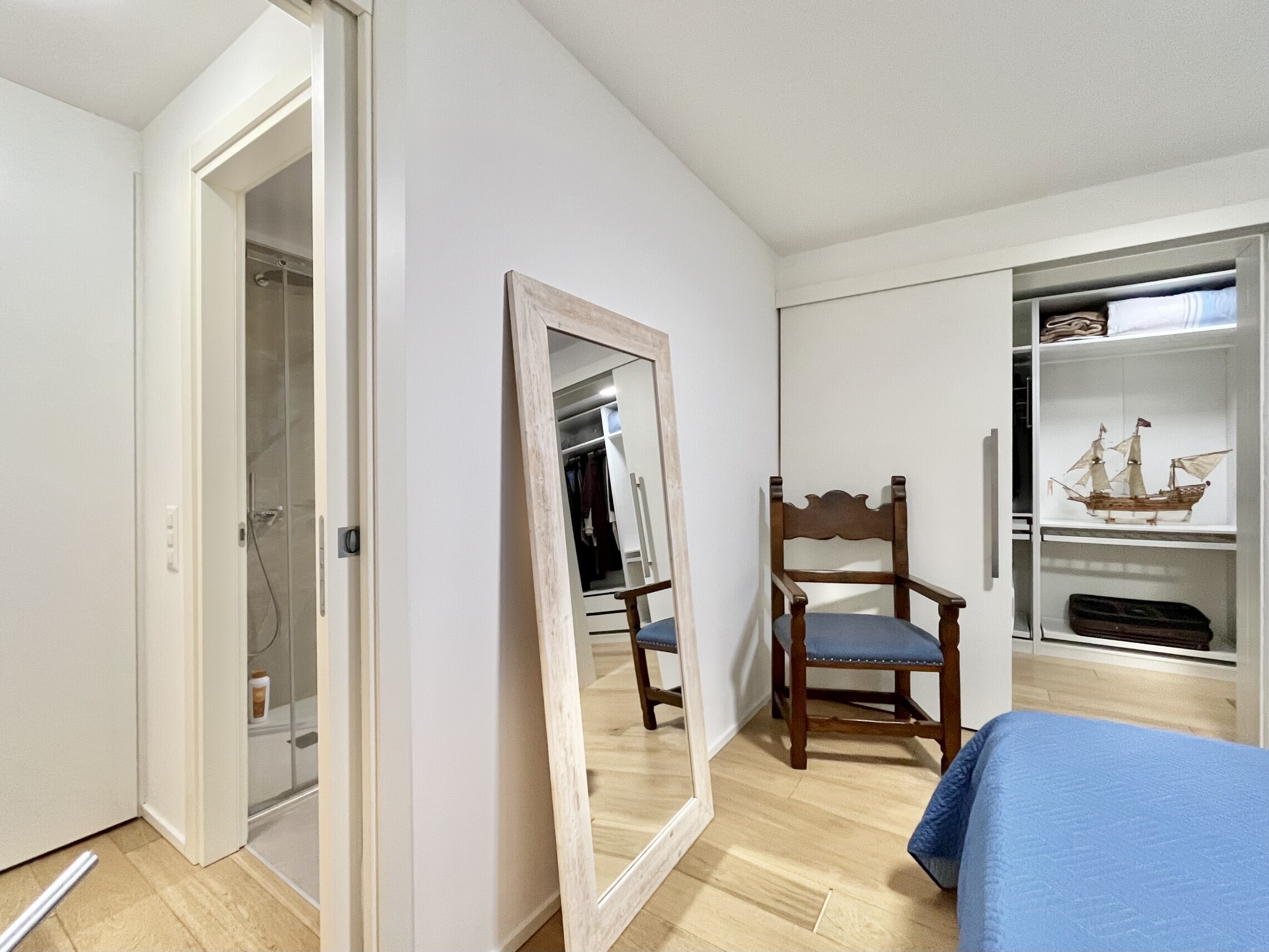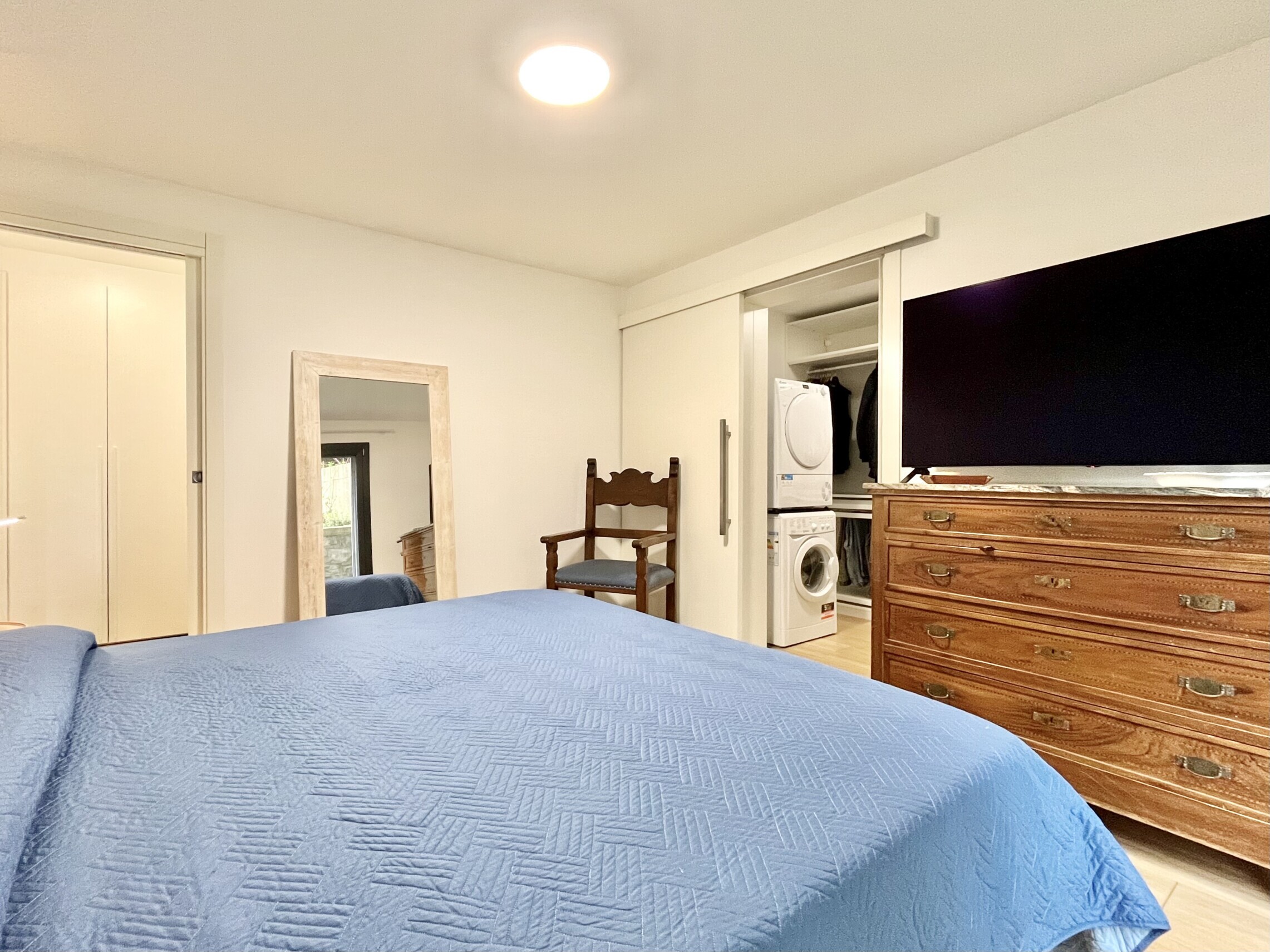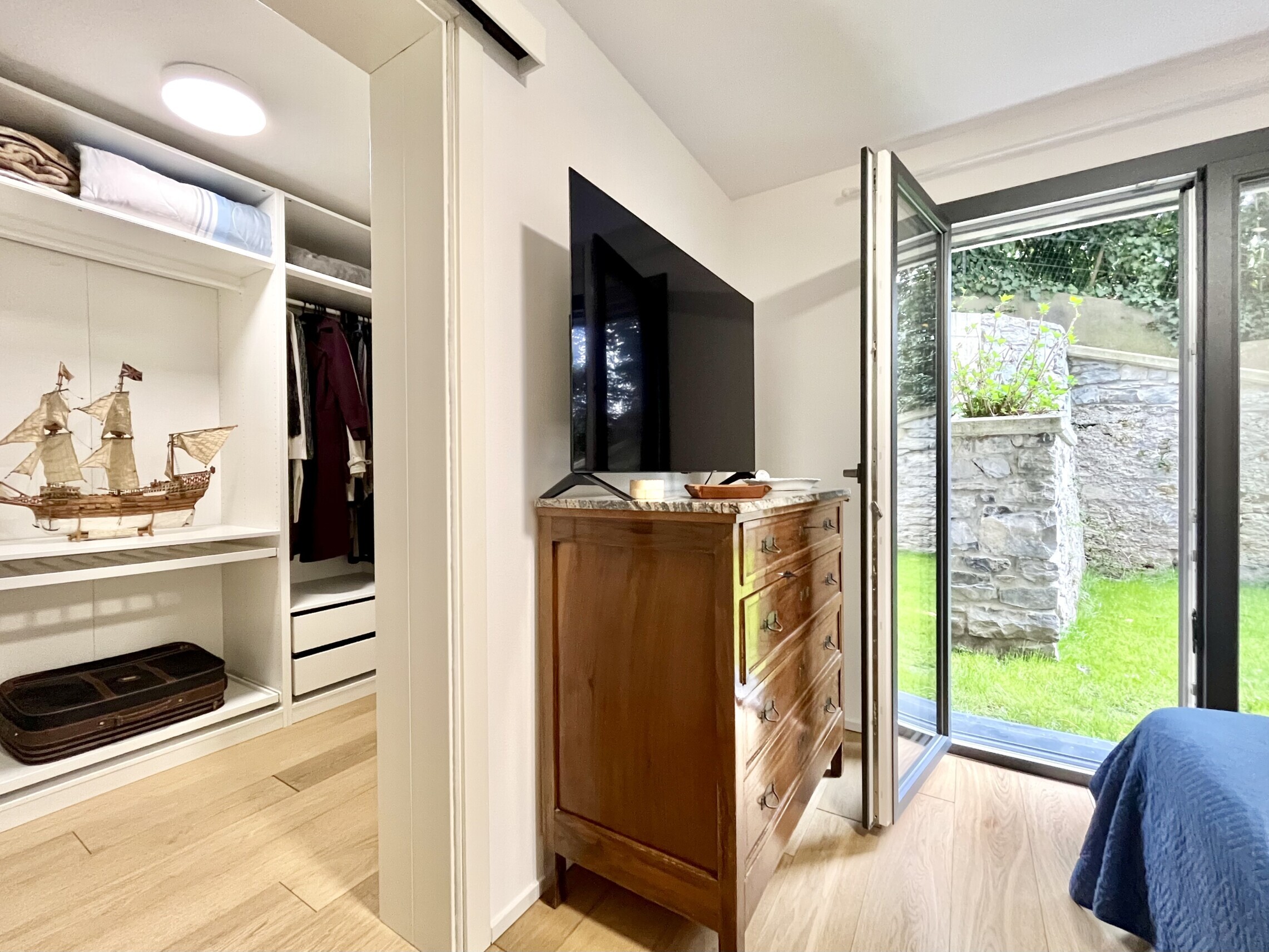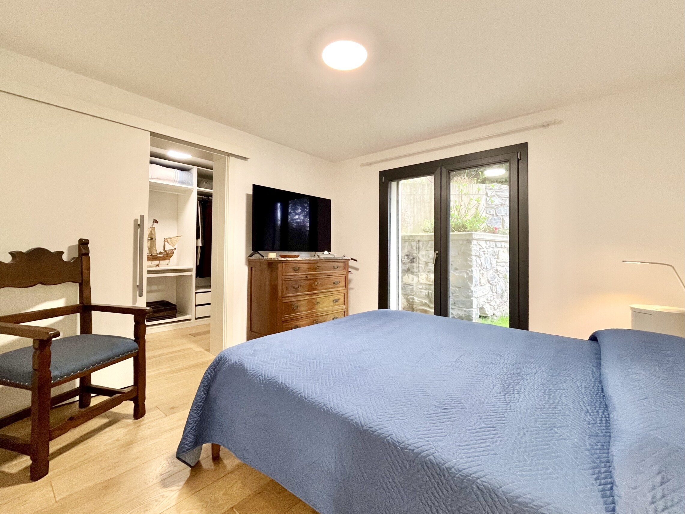 La zona notte è separata con atrio con armadio a muro, seguito dal bagno finestrato con lavabo, grande doccia, wc e bidet. La camera da letto ha accesso diretto al giardino ed è dotata di una cabina armadio molto spaziosa, che include anche una colonna lavasciuga.