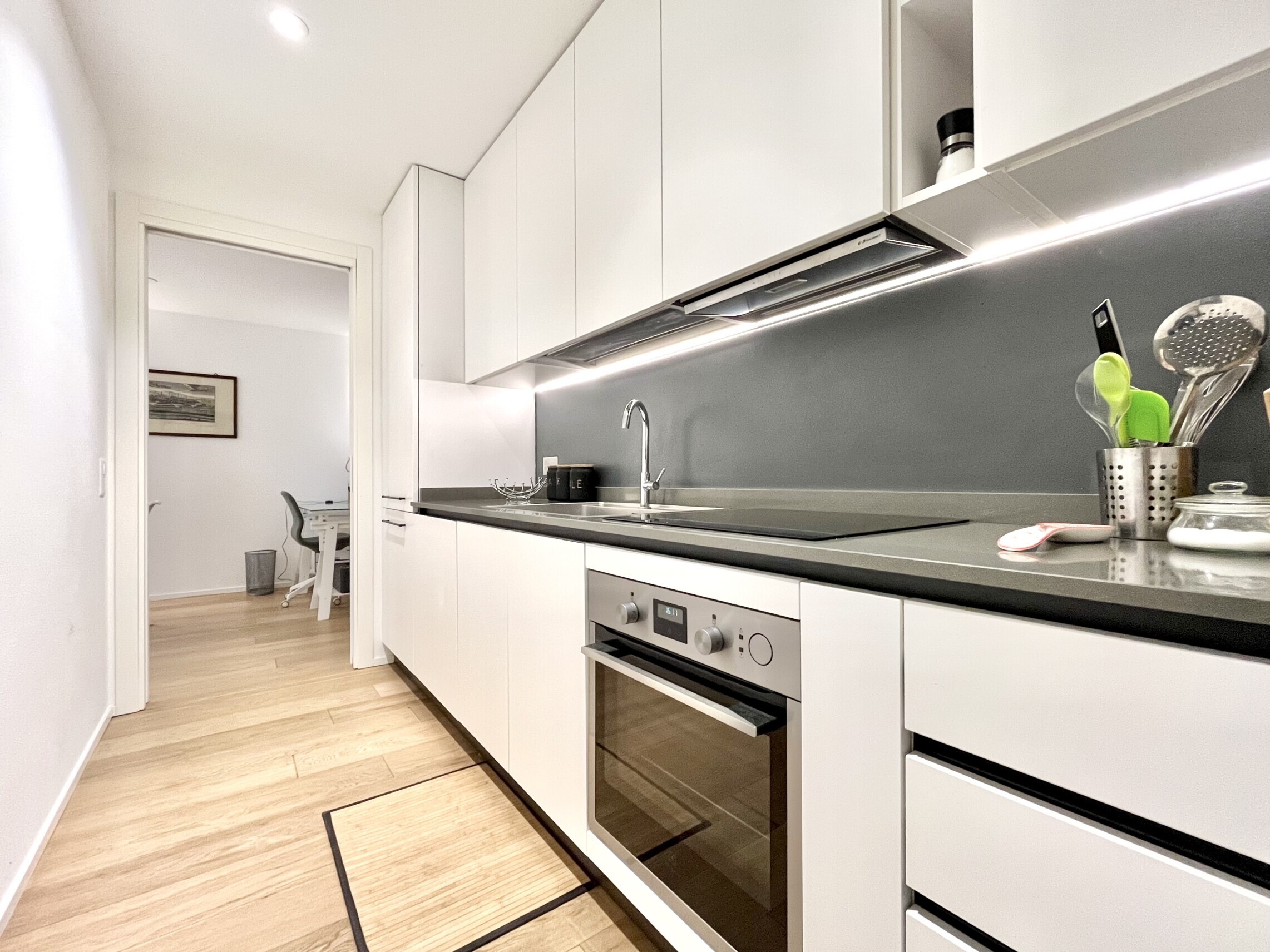 Ingresso diretta nella zona giorno composta di soggiorno / sala da pranzo con uscita diretta sul giardino con una terrazza coperta, cucina separata moderna accessoriata con forno e fornelli ad induzione, lavastoviglie, frigo e congelatore.