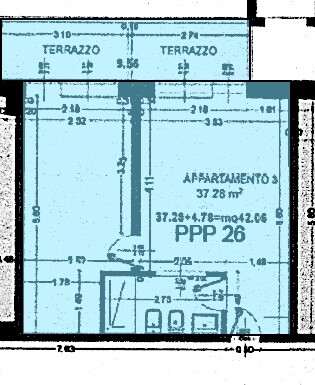 Ingresso diretto nella zona giorno con cucina a vista dotata di piano di cottura, forno, lavastoviglie e frigorifero, aperta sul salottino con uscita diretta sulla prima terrazza. Completano l'appartamento un bagno con box doccia, WC, lavabo e bidet, e una camera da letto matrimoniale con accesso alla seconda terrazza.
