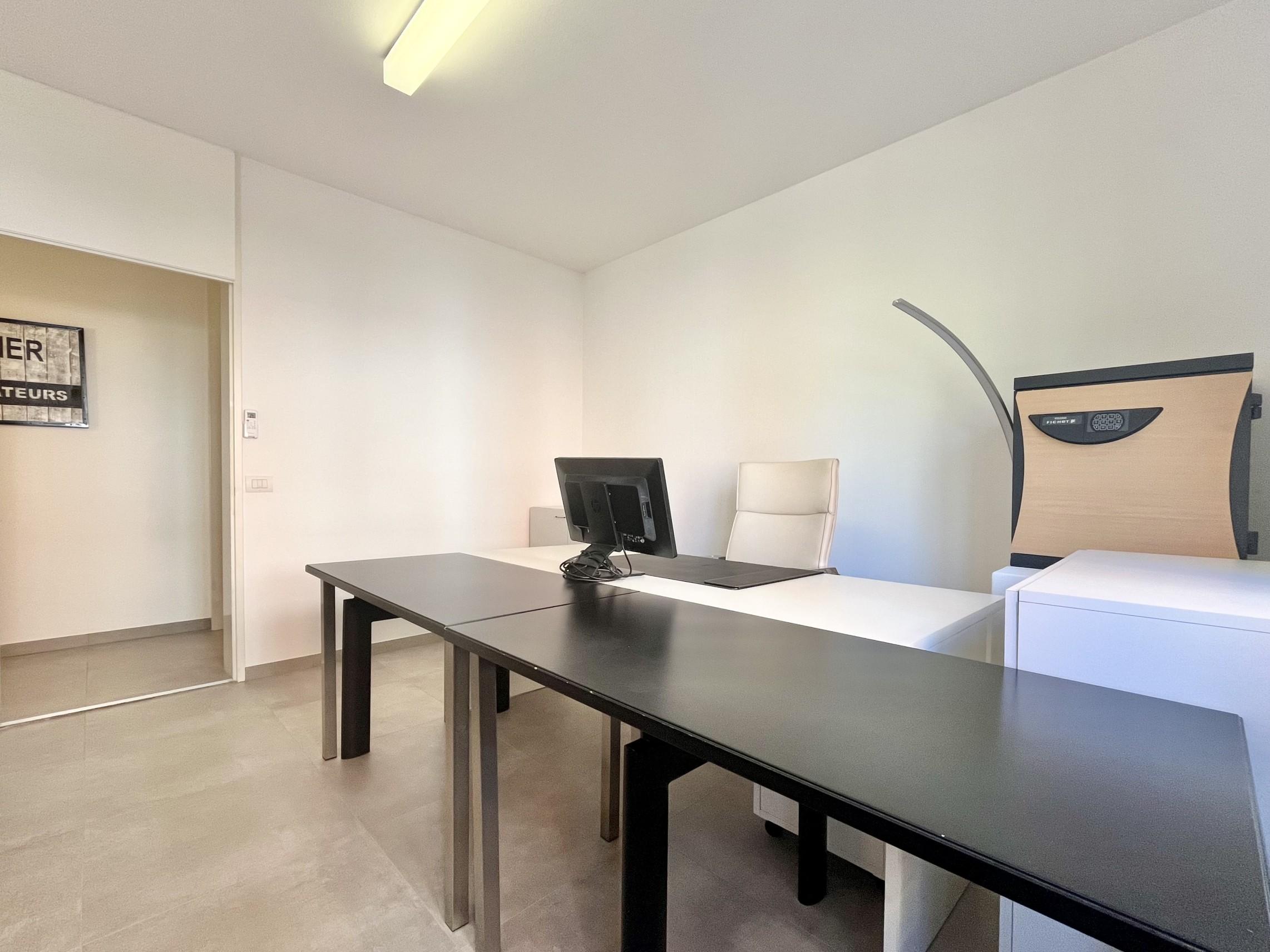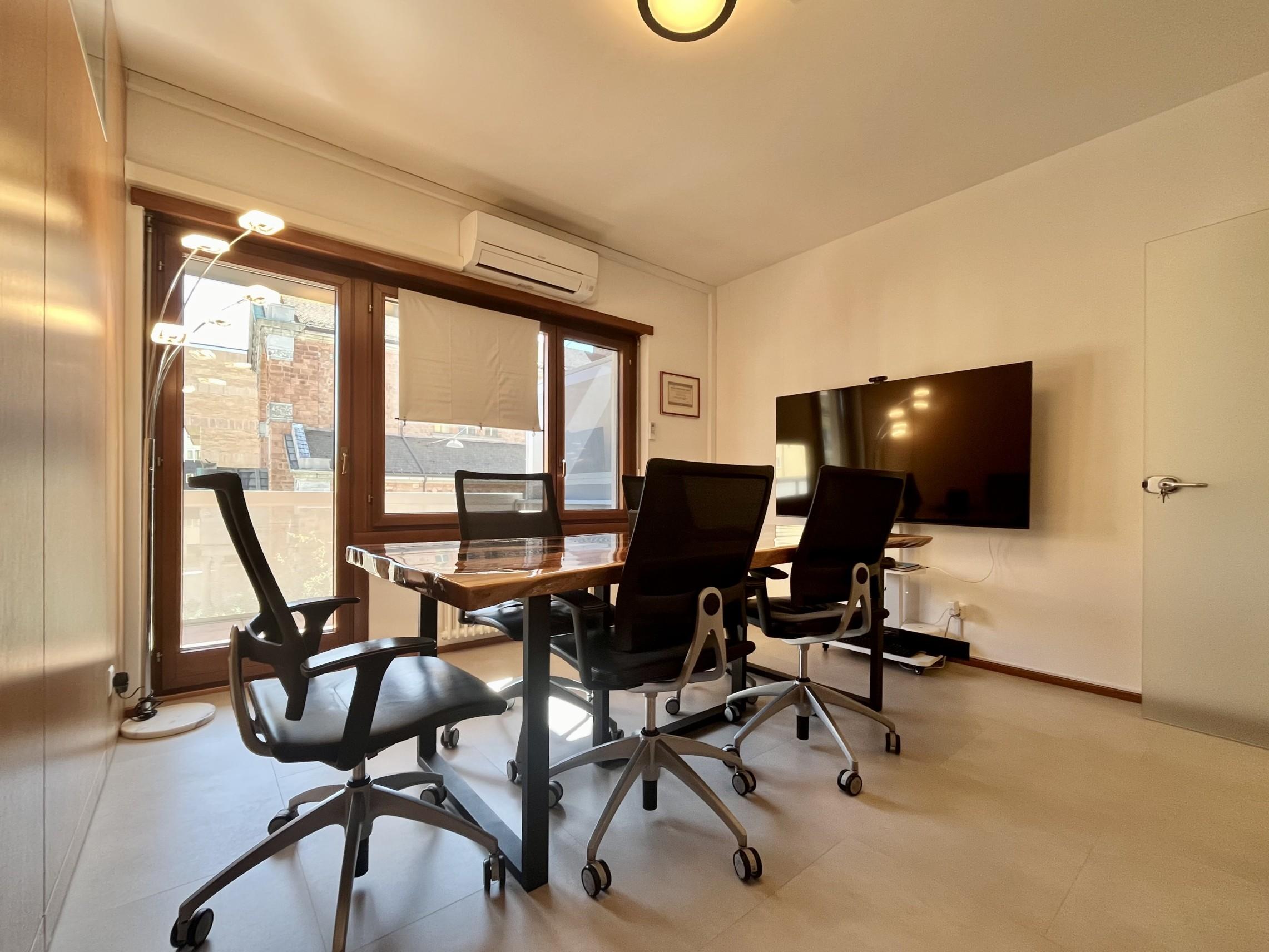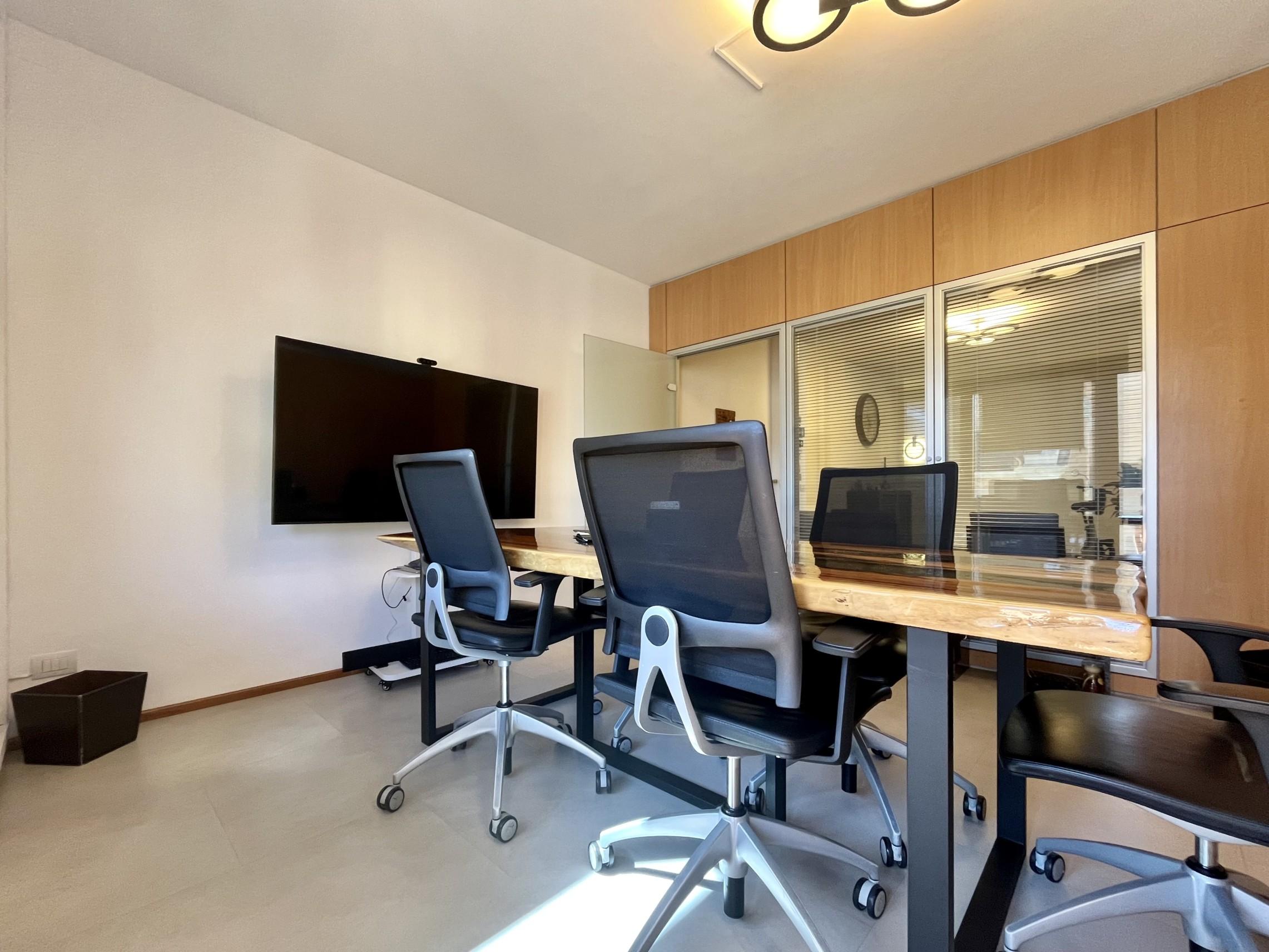 Ingresso con disimpegno che conduce alla sala d'aspetto, una sala riunioni con grande schermo ideale per fare presentazioni/videoconferenze ed un servizio per i dipendenti, ad uso comune per tutti i gli uffici, con lavabo, bidet e box doccia.
