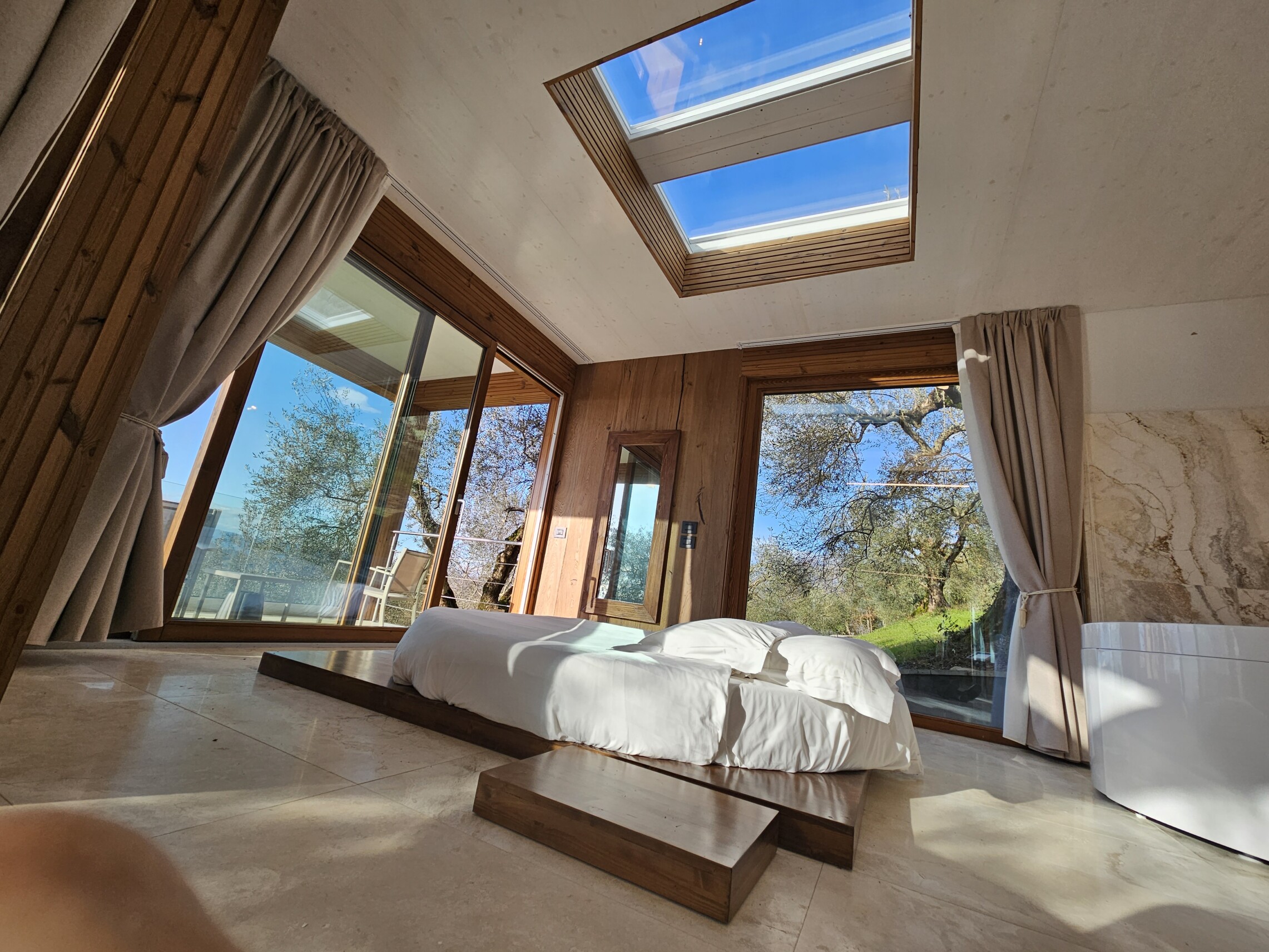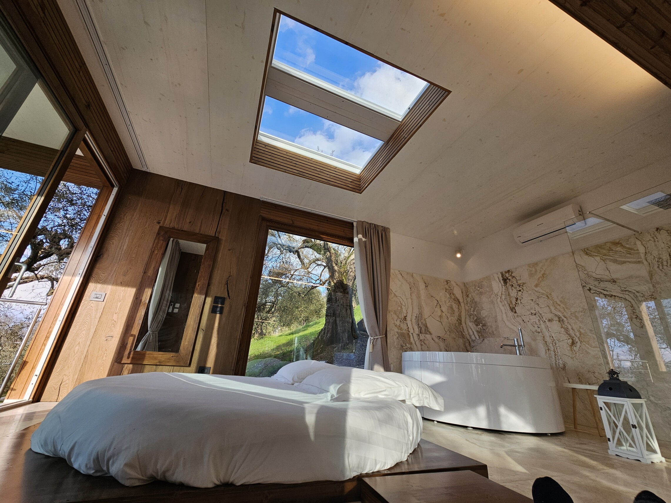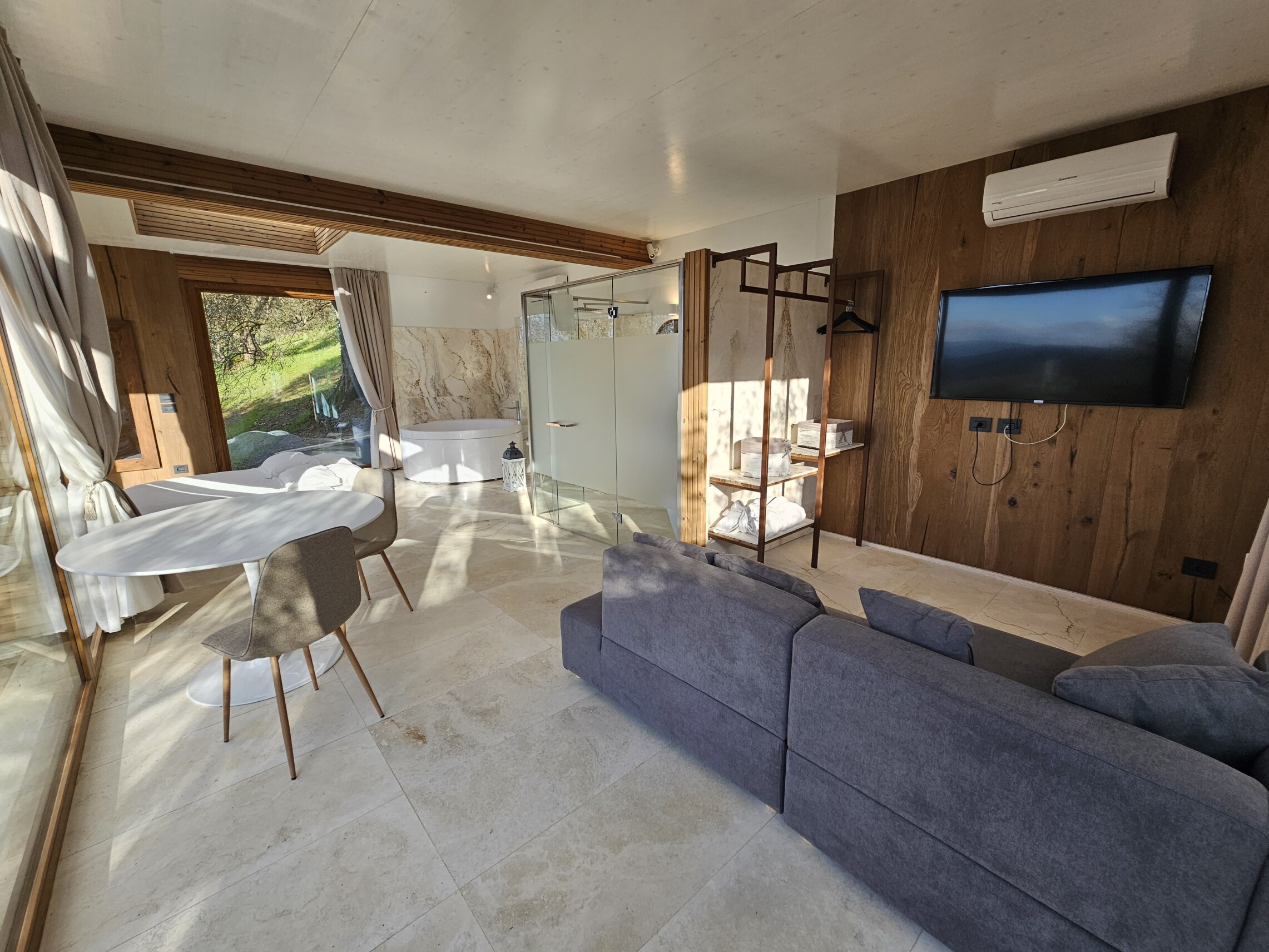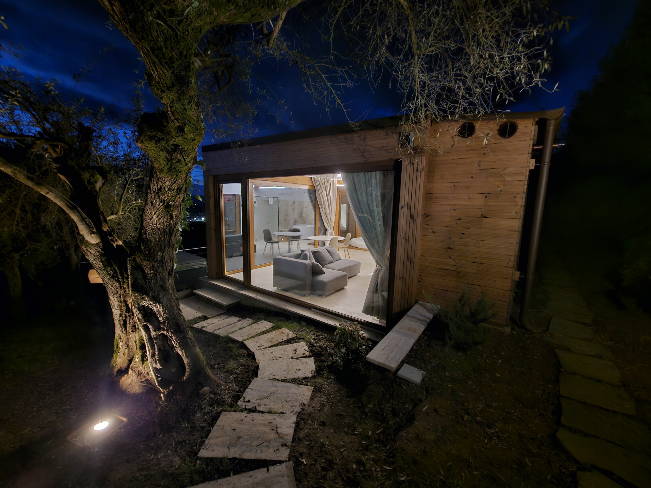 Le Eco Suite sono costruite con materiali ecologici e di prima qualità, su un unico livello al piano terra, dotate di zona notte, zona giorno e bagno, con pergolato coperto dalla quale godersi il magnifico panorama. La superficie interna calpestabile é di circa 50 mq, pergolato e terreno esclusi.