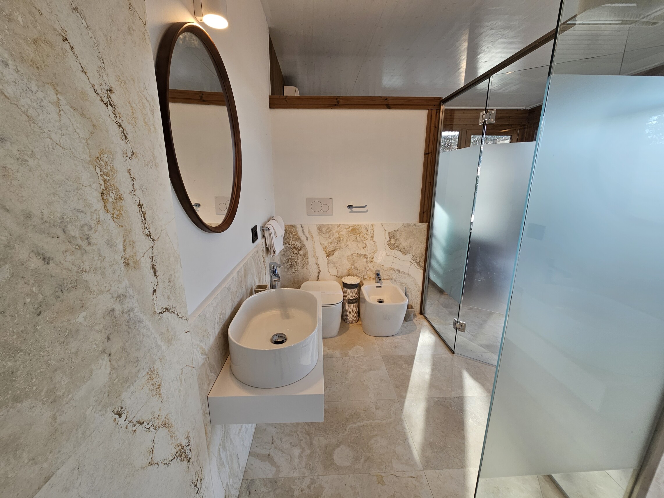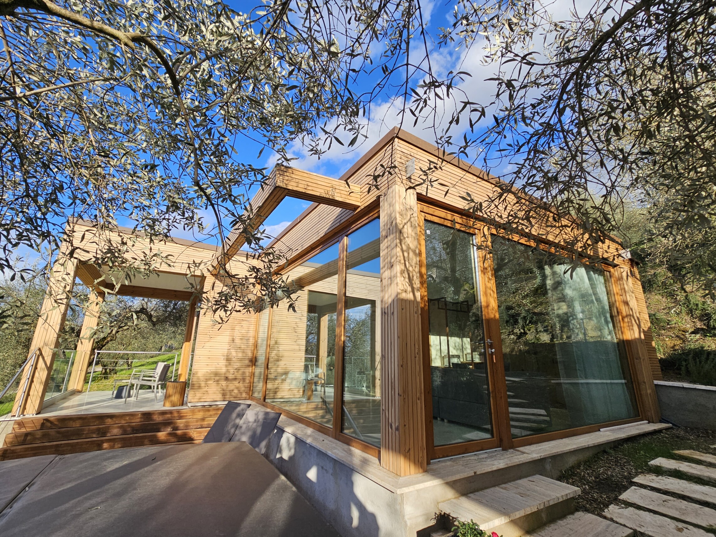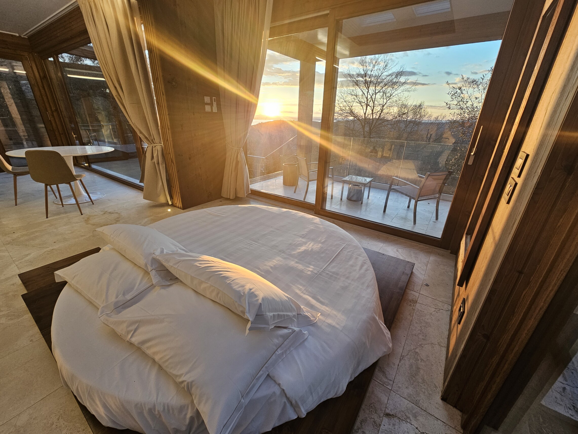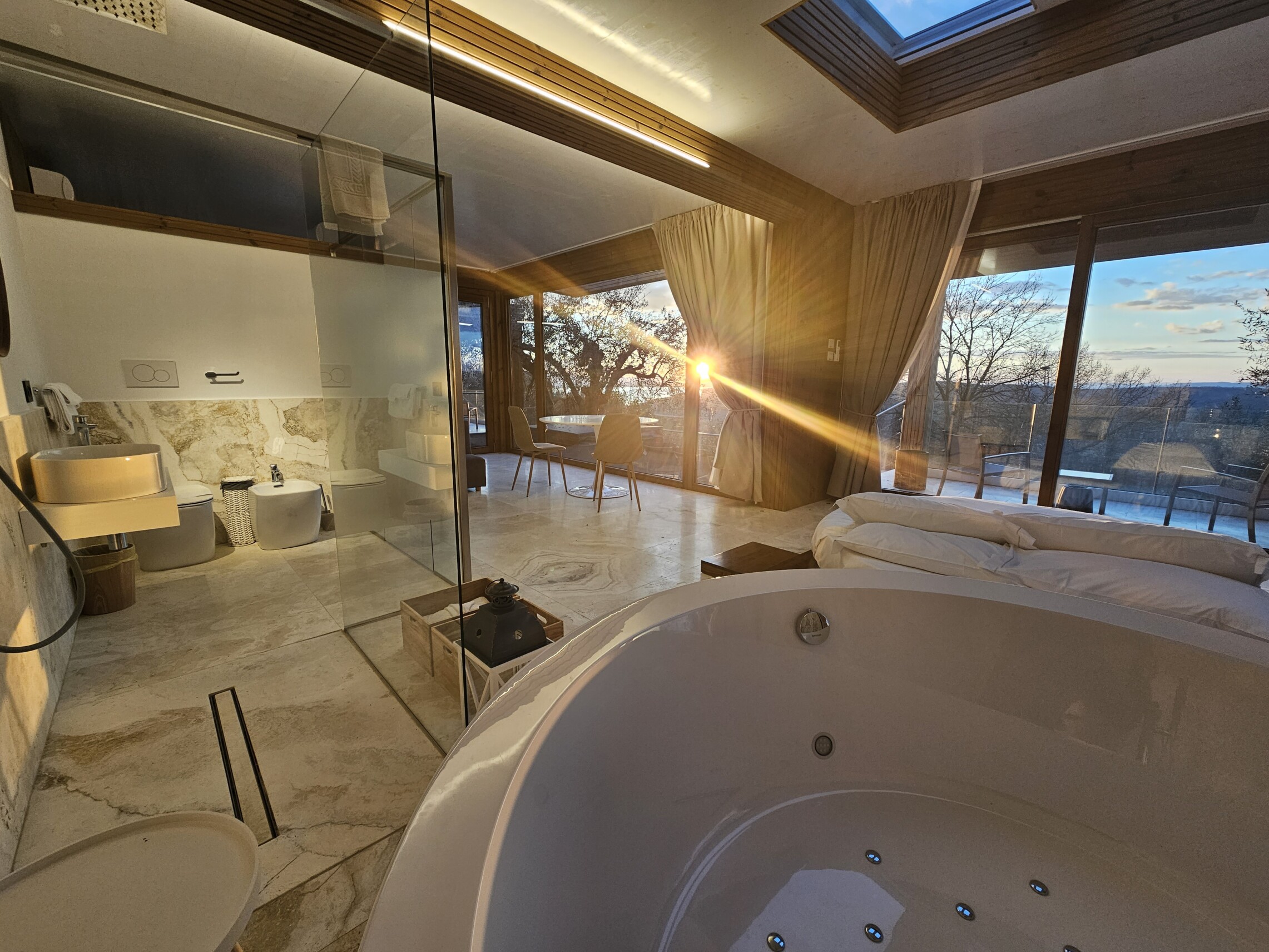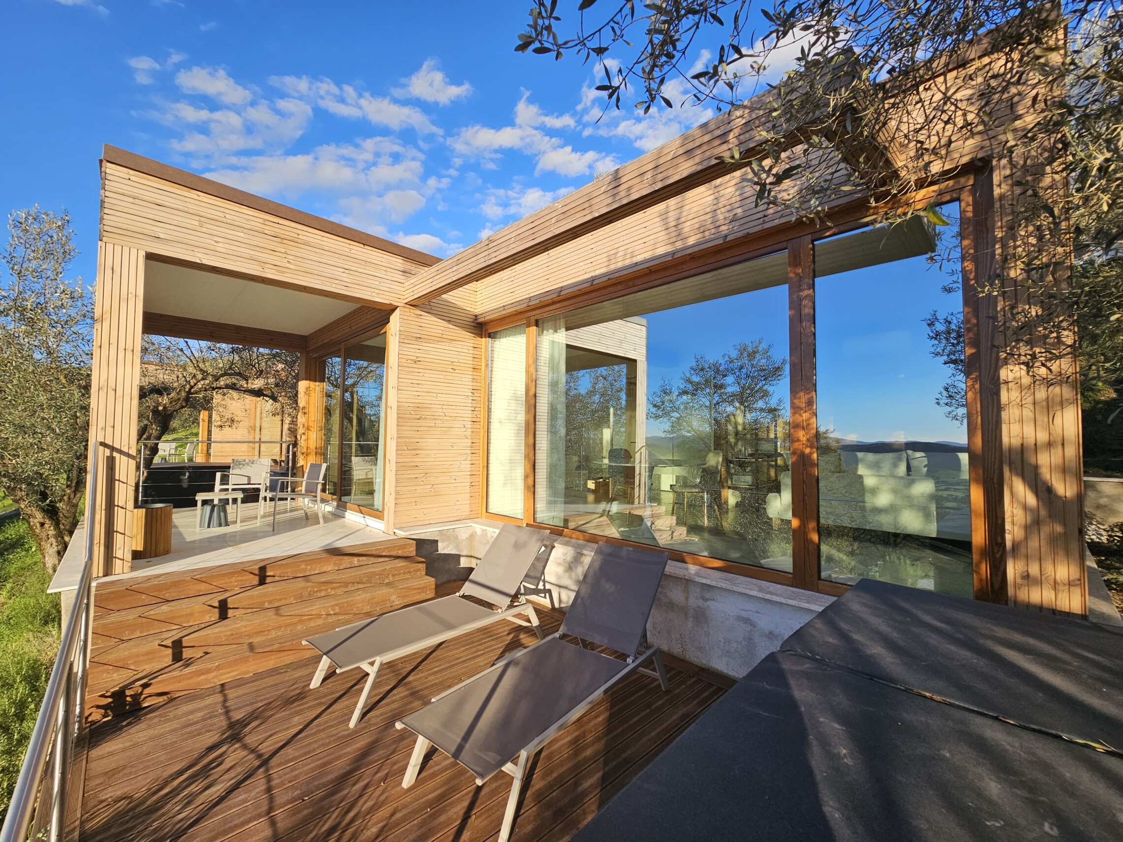 Le Eco Suite sono costruite con materiali ecologici e di prima qualità, su un unico livello al piano terra, dotate di zona notte, zona giorno e bagno, con pergolato coperto dalla quale godersi il magnifico panorama. La superficie interna calpestabile é di circa 50 mq, pergolato e terreno esclusi.