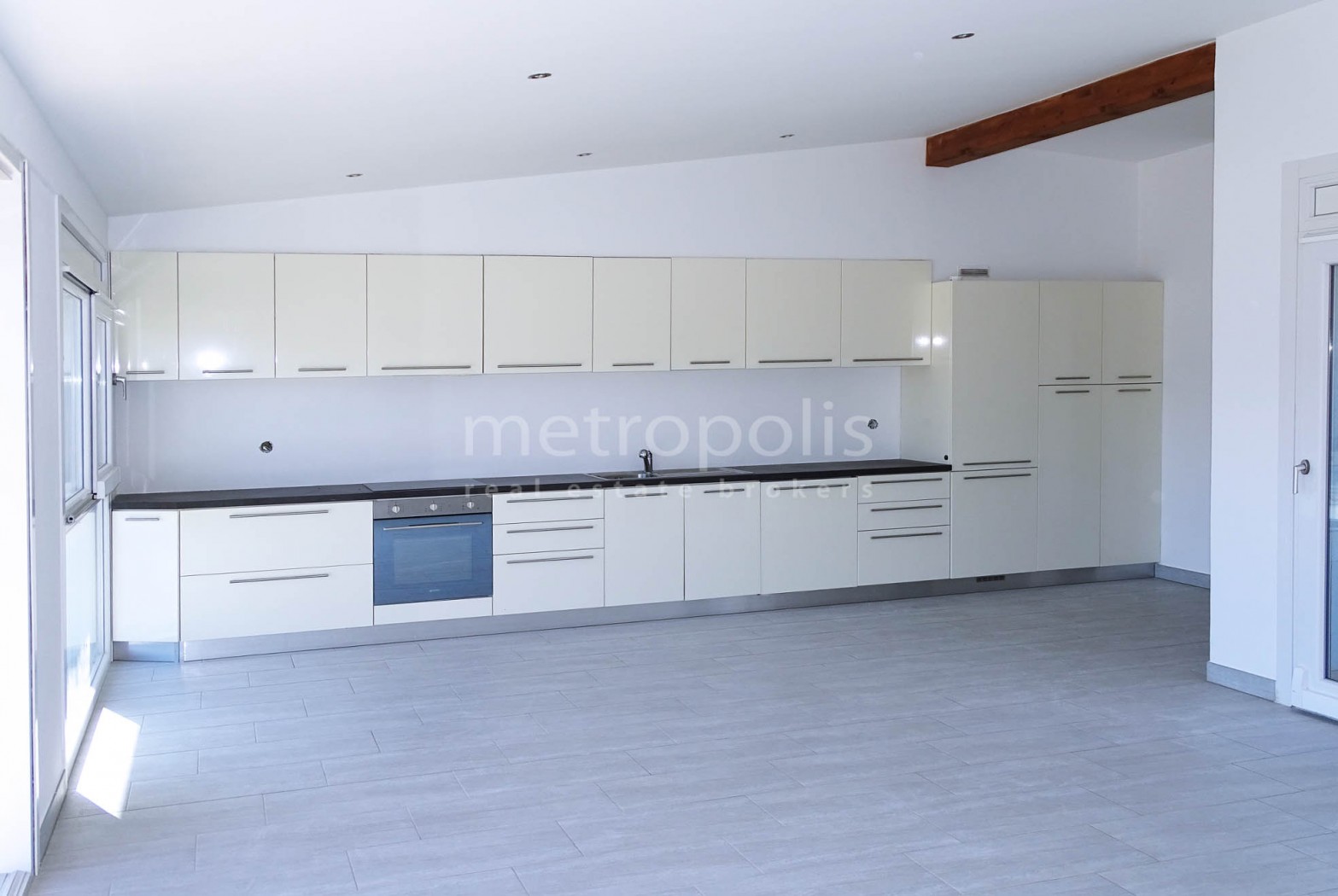 L'appartamento è composto da ingresso, atrio, grande zona living con cucina moderna color crème, un primo servizio WC con doccia, in seguito un bagno con vasca idromassaggio e 3 spaziose camere, due delle quali hanno l'accesso diretto al piccolo giardino.