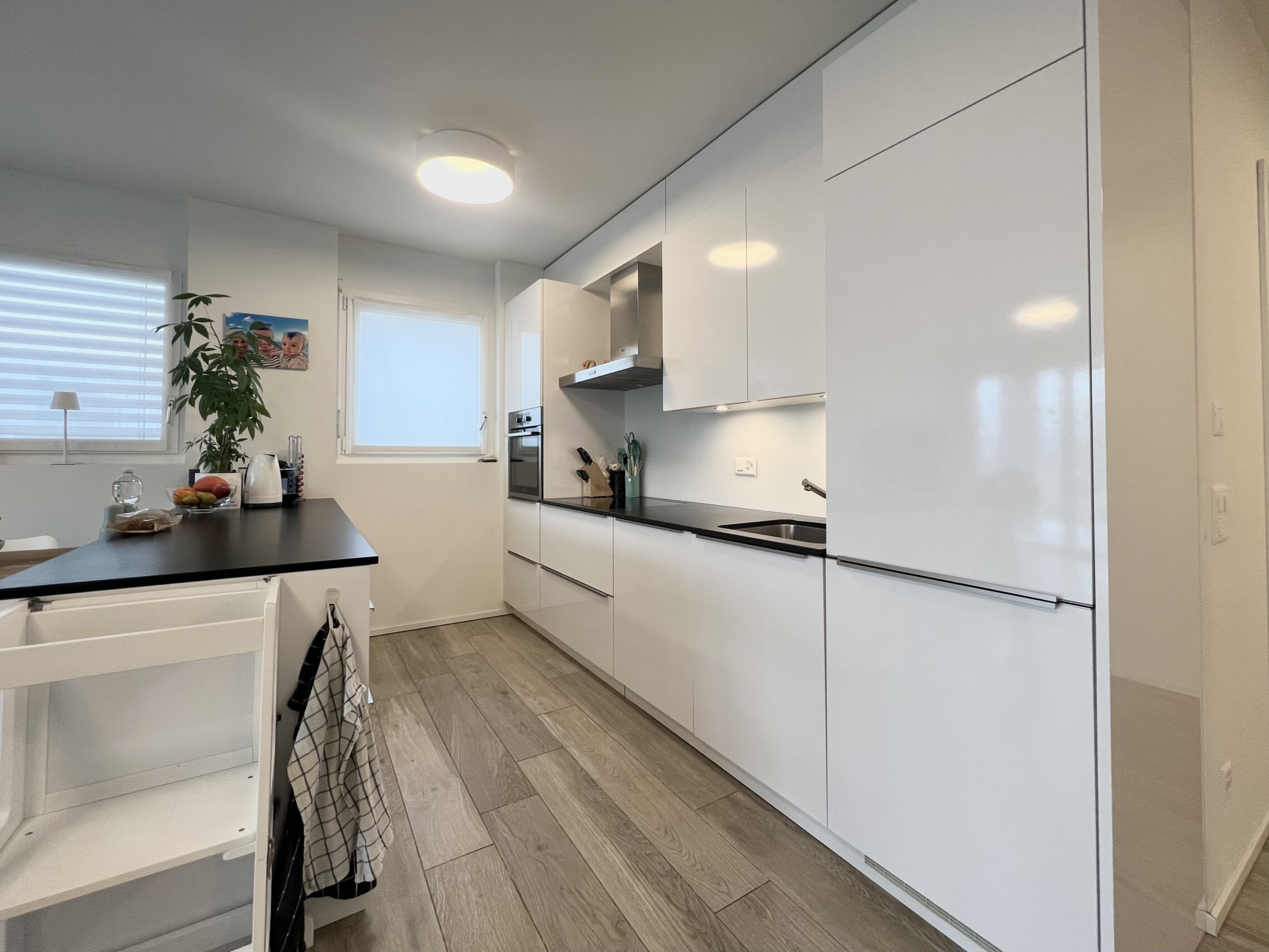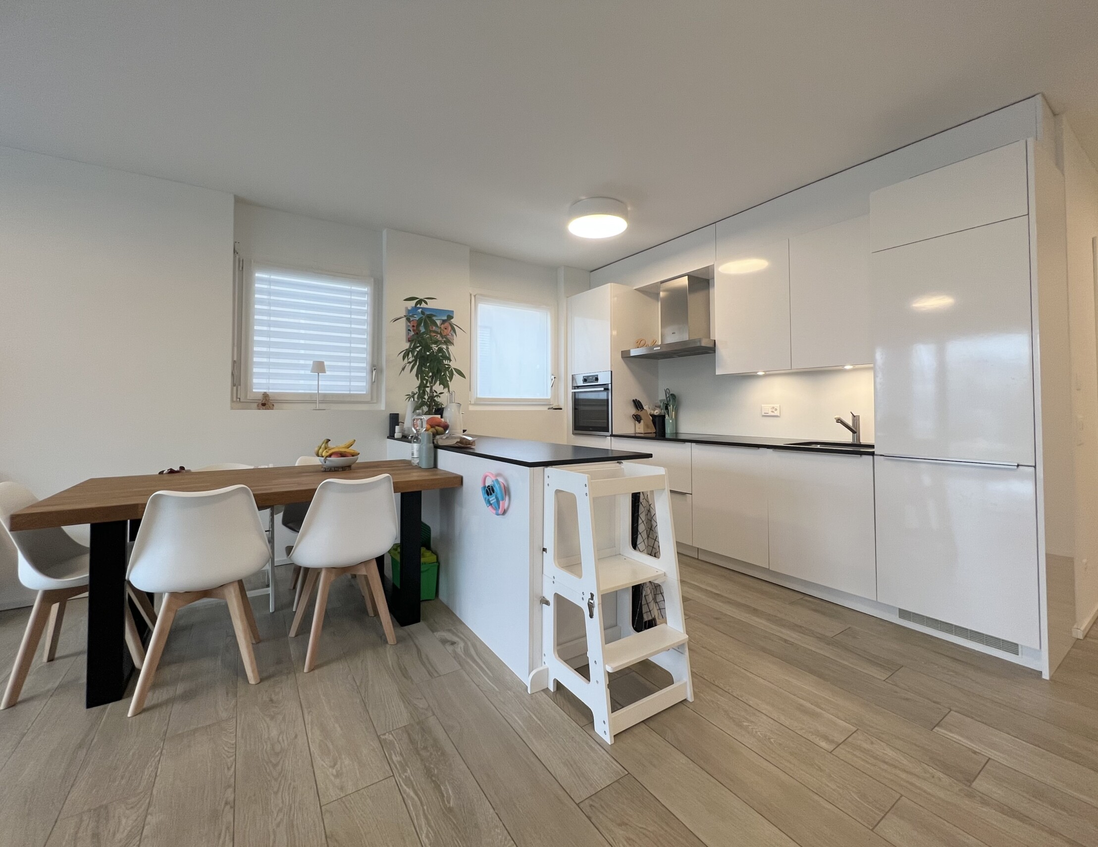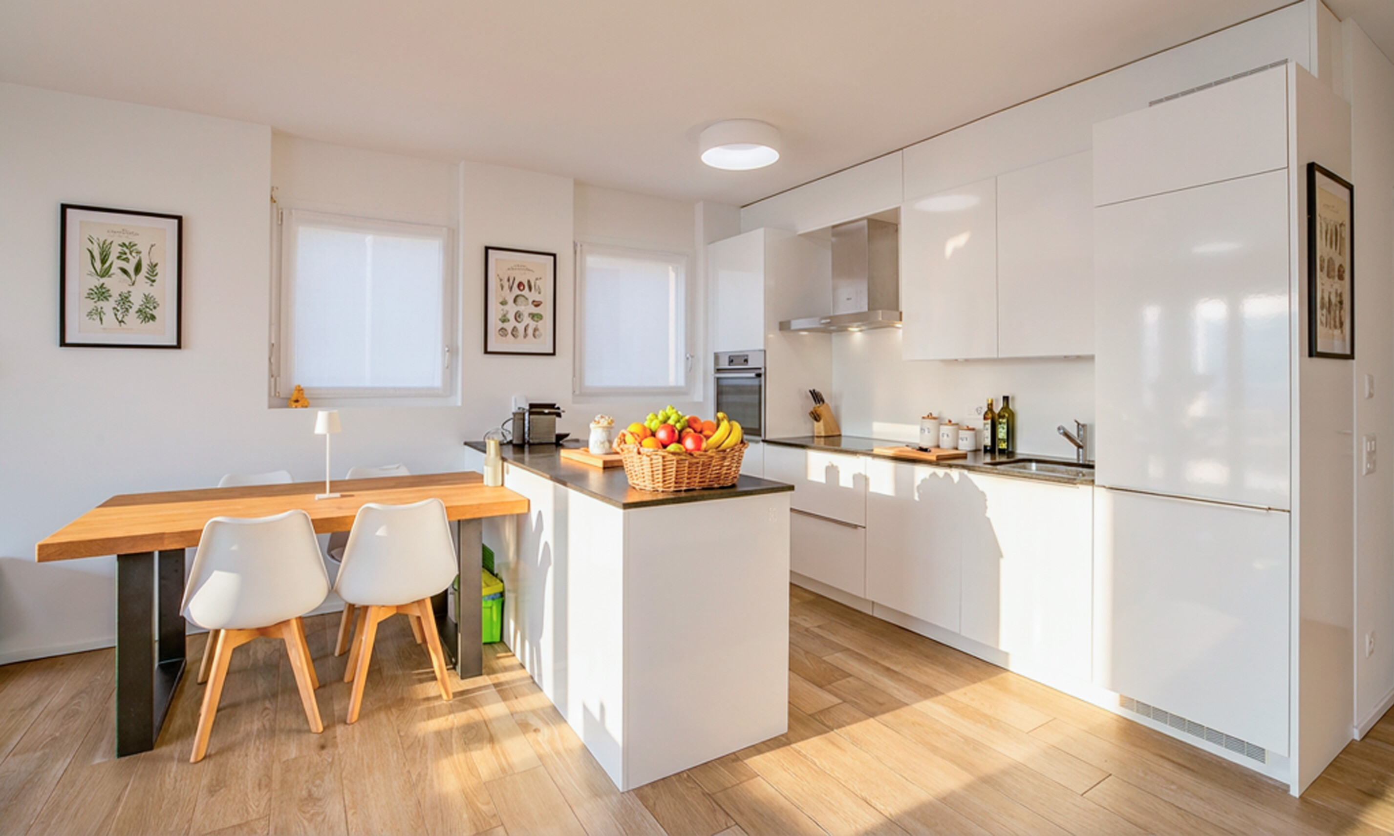 La zona giorno, si distingue per la luminosità e l'ottima distribuzione degli spazi. Grandi vetrate mettono in comunicazione diretta il living con la terrazza coperta e il giardino, creando una piacevole continuità tra interno ed esterno. La cucina a vista, moderna e funzionale, è dotata di isola centrale ed è completa di elettrodomestici di qualità.