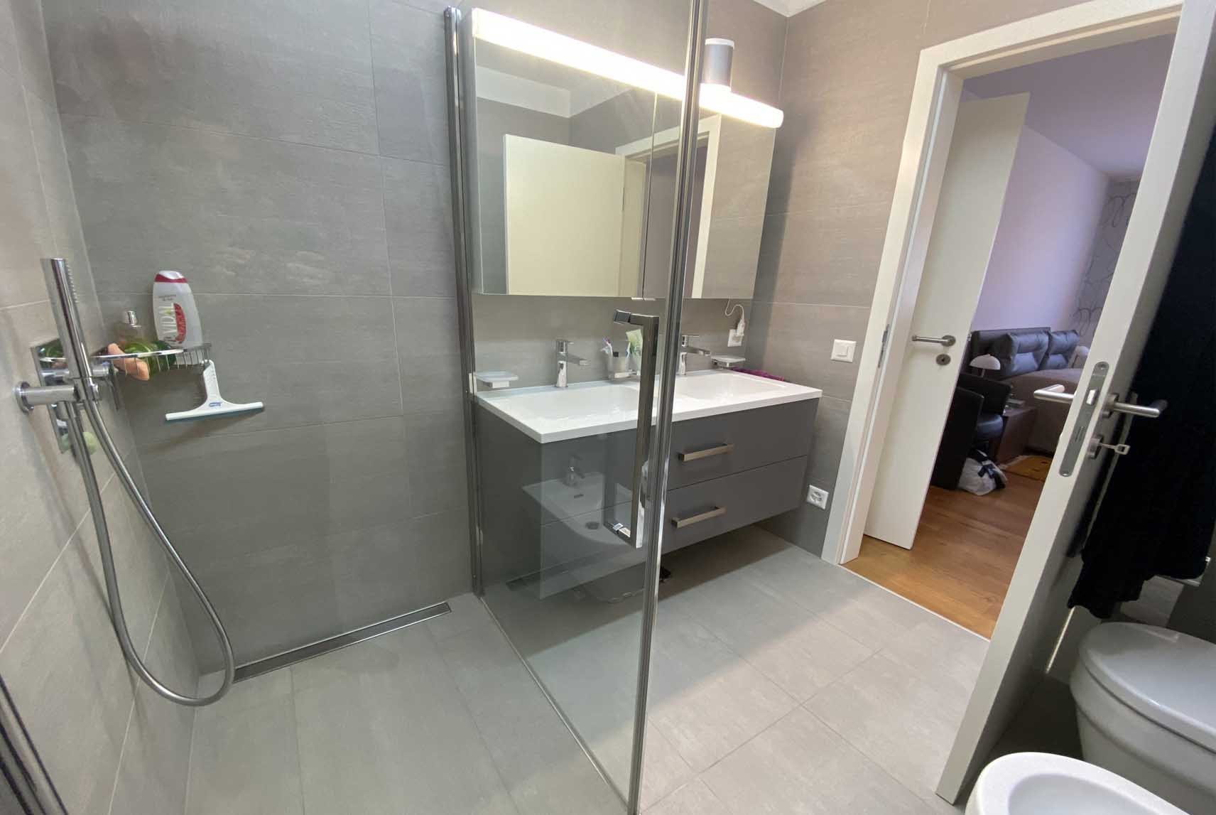 Primo bagno con elegante box doccia, camera da letto di generose dimensioni con libreria su misura ed ampie finestre da cui poter godere della vista aperta, camera master matrimoniale spaziosa e luminosa, con arredamento su misura e bagno privato con grande box doccia, sanitari e doppio lavabo.
