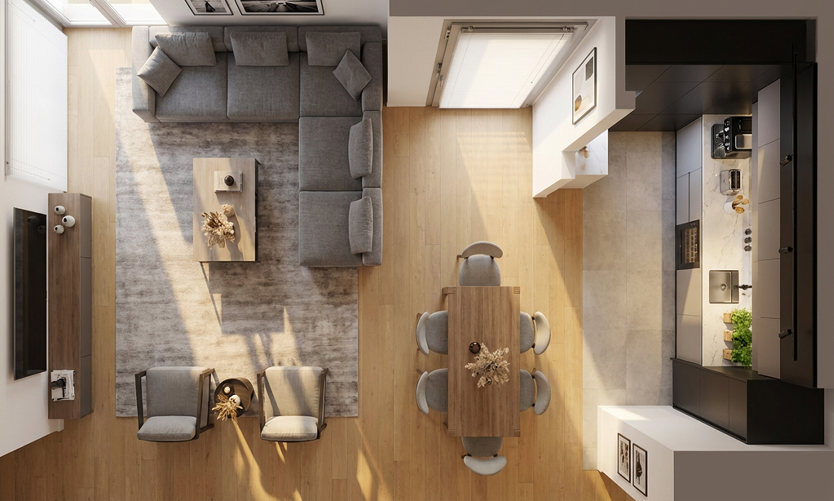 La zona giorno di quasi 25 mq è caratterizzata da un'ampia sala living ideale per momenti di relax o per intrattenere gli ospiti, da una cucina open space moderna e funzionale, dotata di tutti gli elettrodomestici di ultima generazione, servita da una comoda loggia.