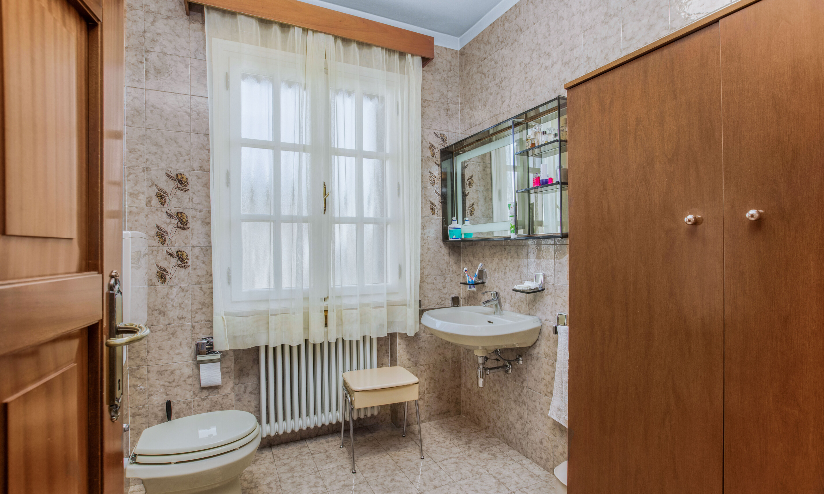 La zona notte, leggermente rialzata ma sullo stesso livello, comprende tre camere matrimoniali, tutte luminose e accoglienti, con pavimenti in parquet ben mantenuti. A completamento di quest'area si trovano due bagni finestrati: uno di servizio, ideale per gli ospiti o per l'uso quotidiano, e un secondo di generose dimensioni con vasca.