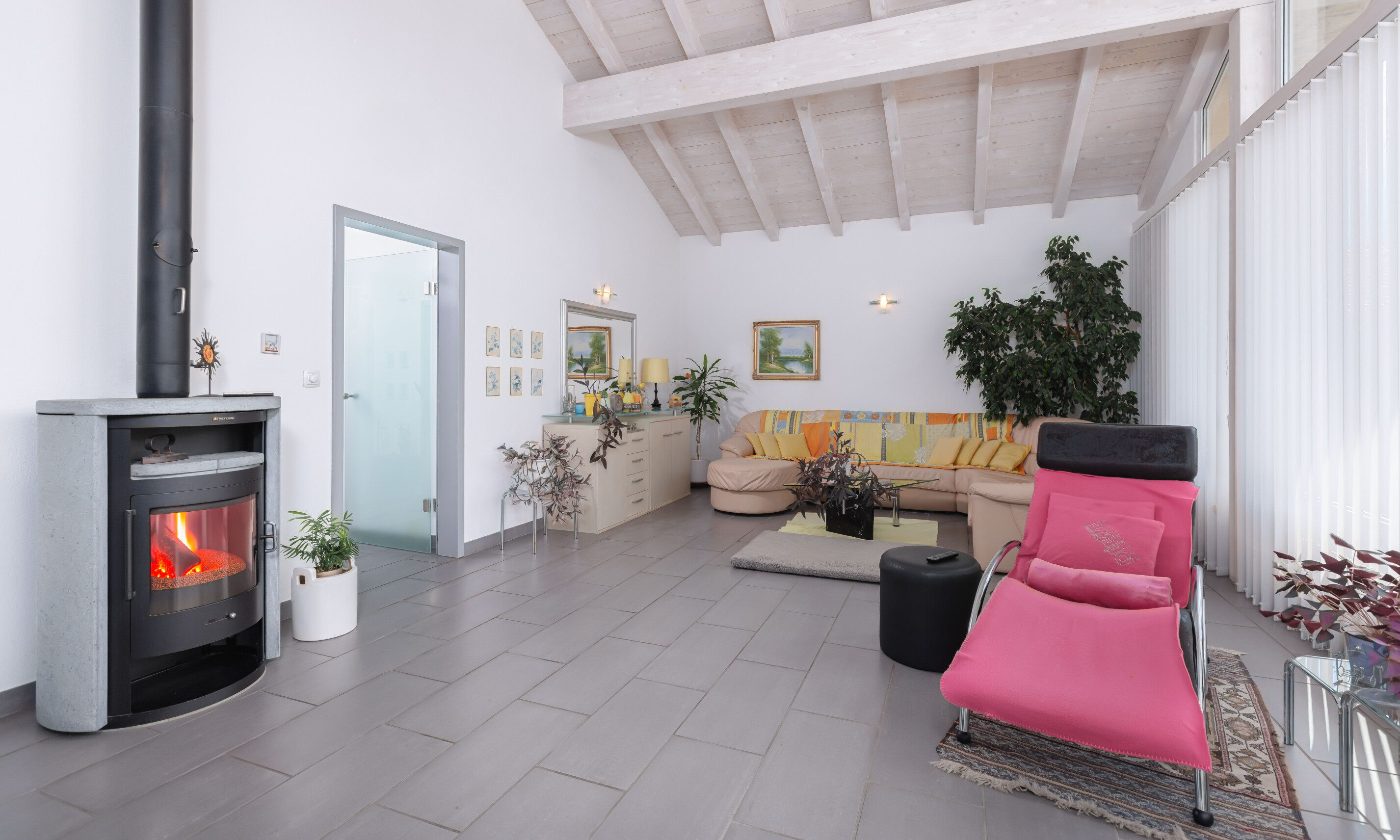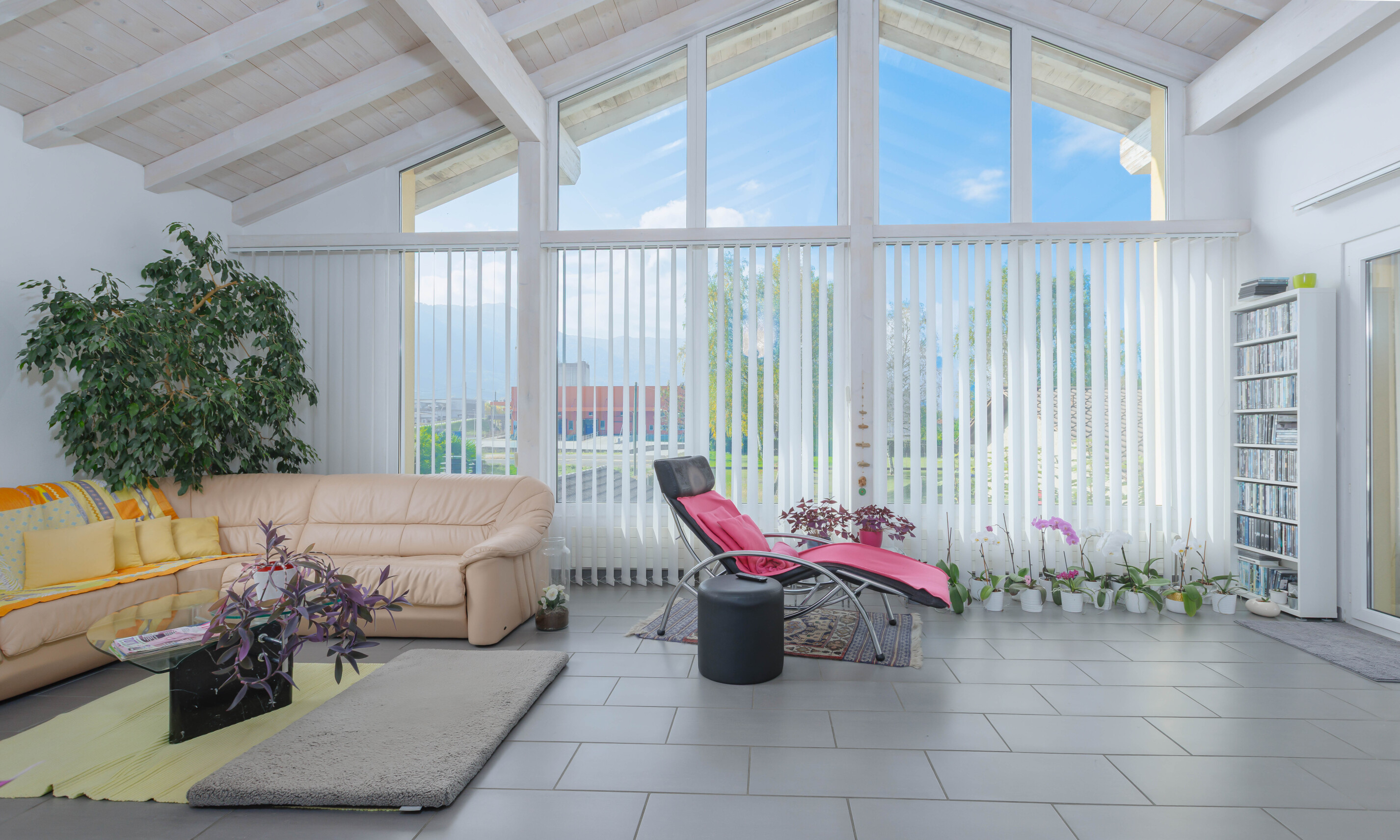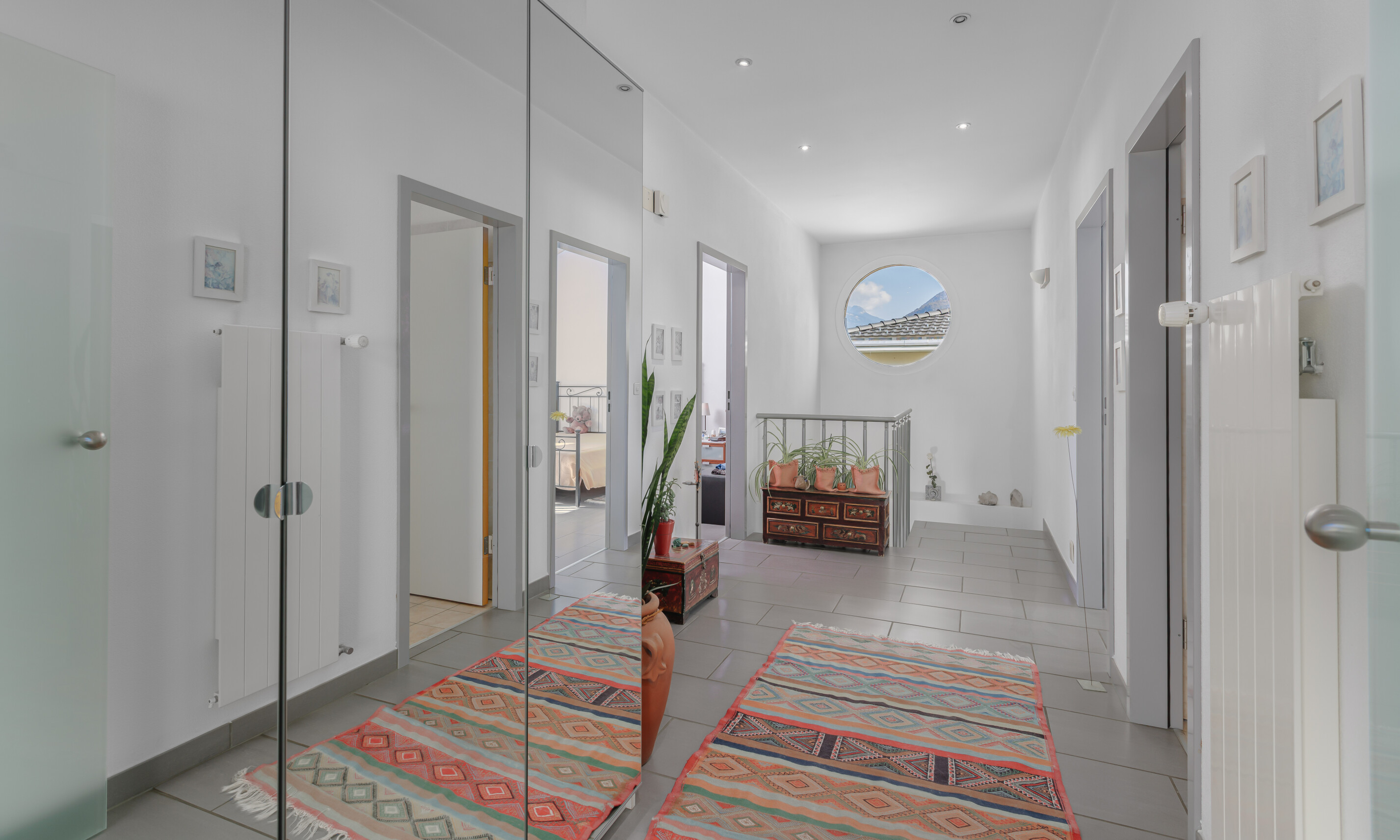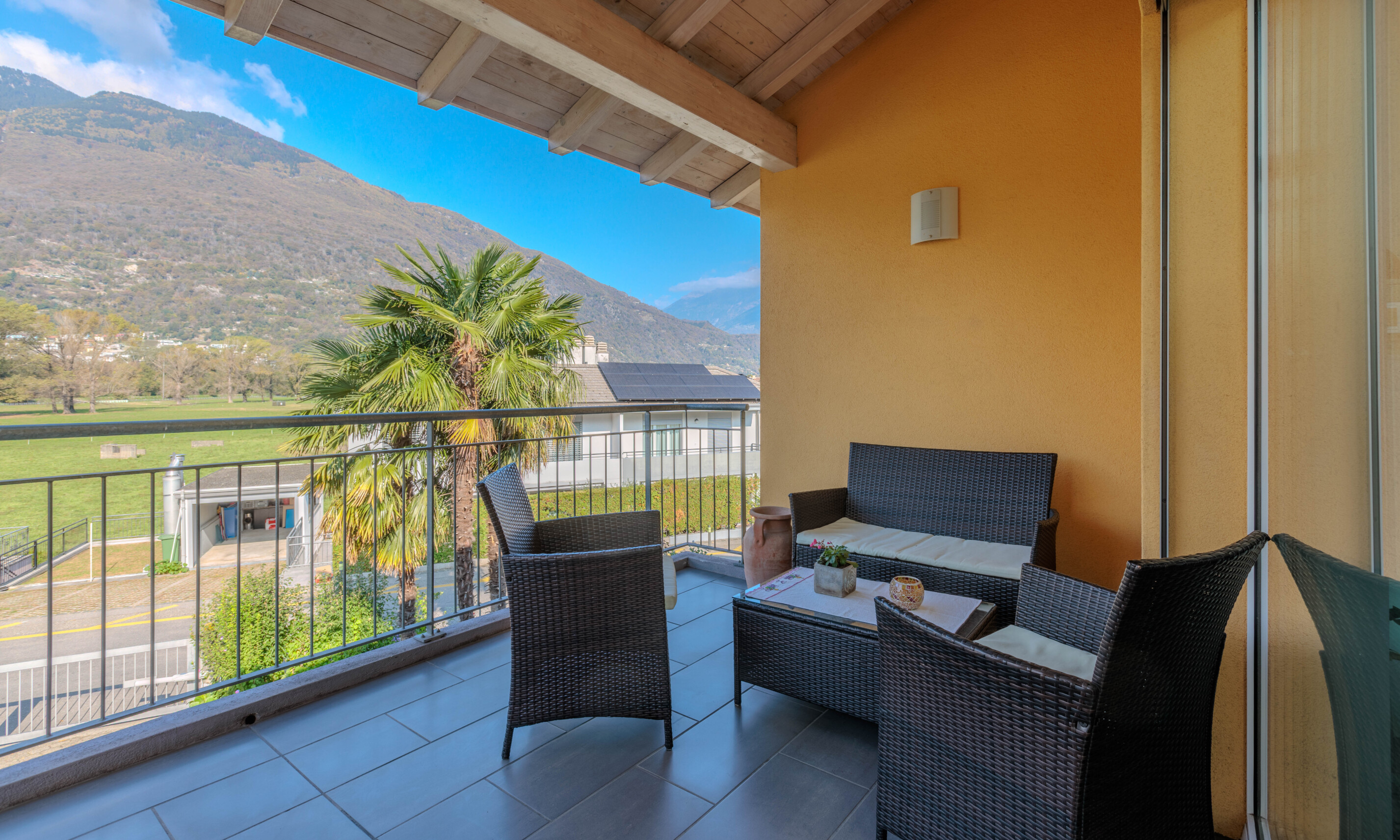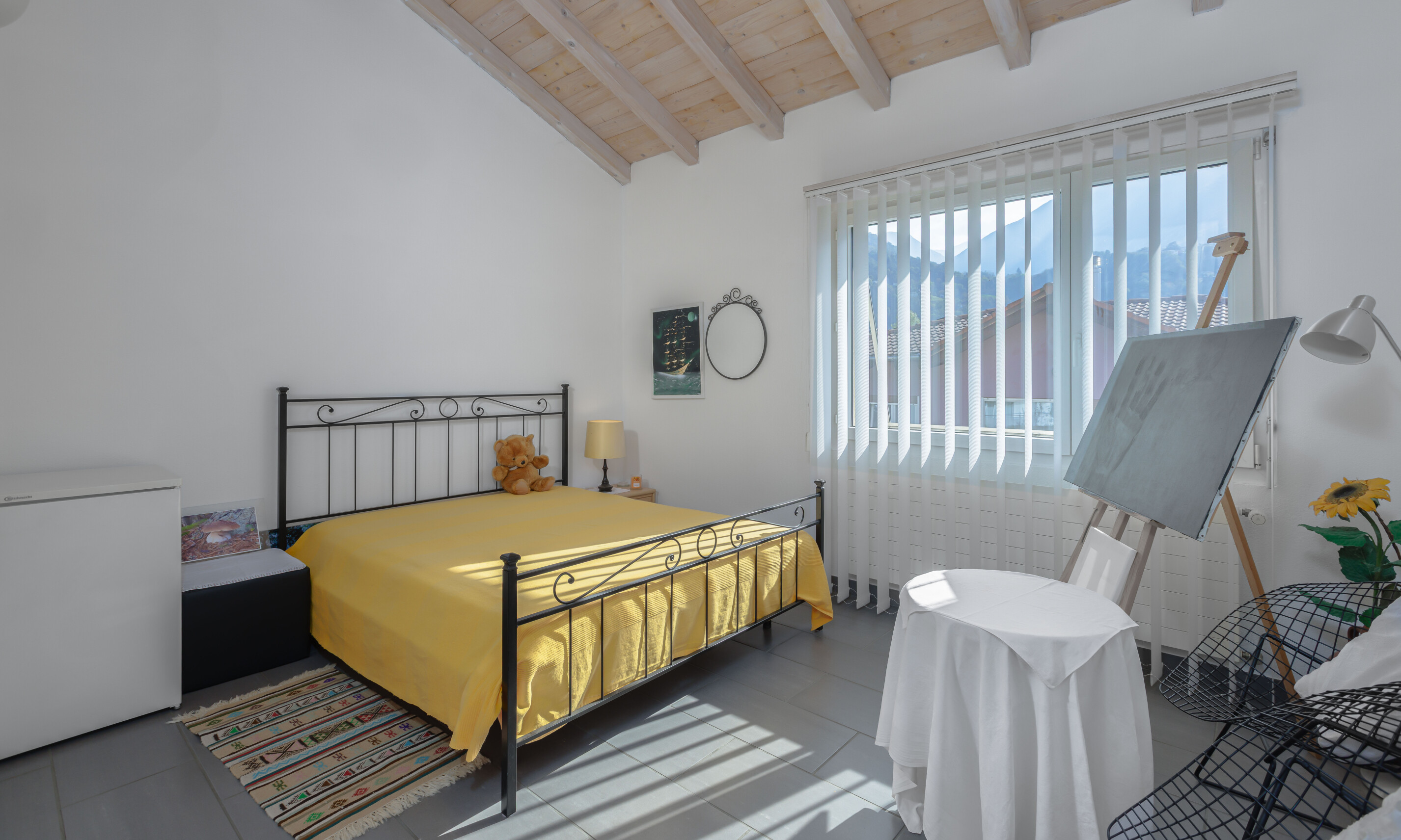 Al PRIMO PIANO, edificato nel 2003, abbiamo la zona notte con due ampie camere matrimoniali, una camera singola e un grande soggiorno con ampie vetrate e terrazza panoramica con vista sul castello di Bellinzona.
