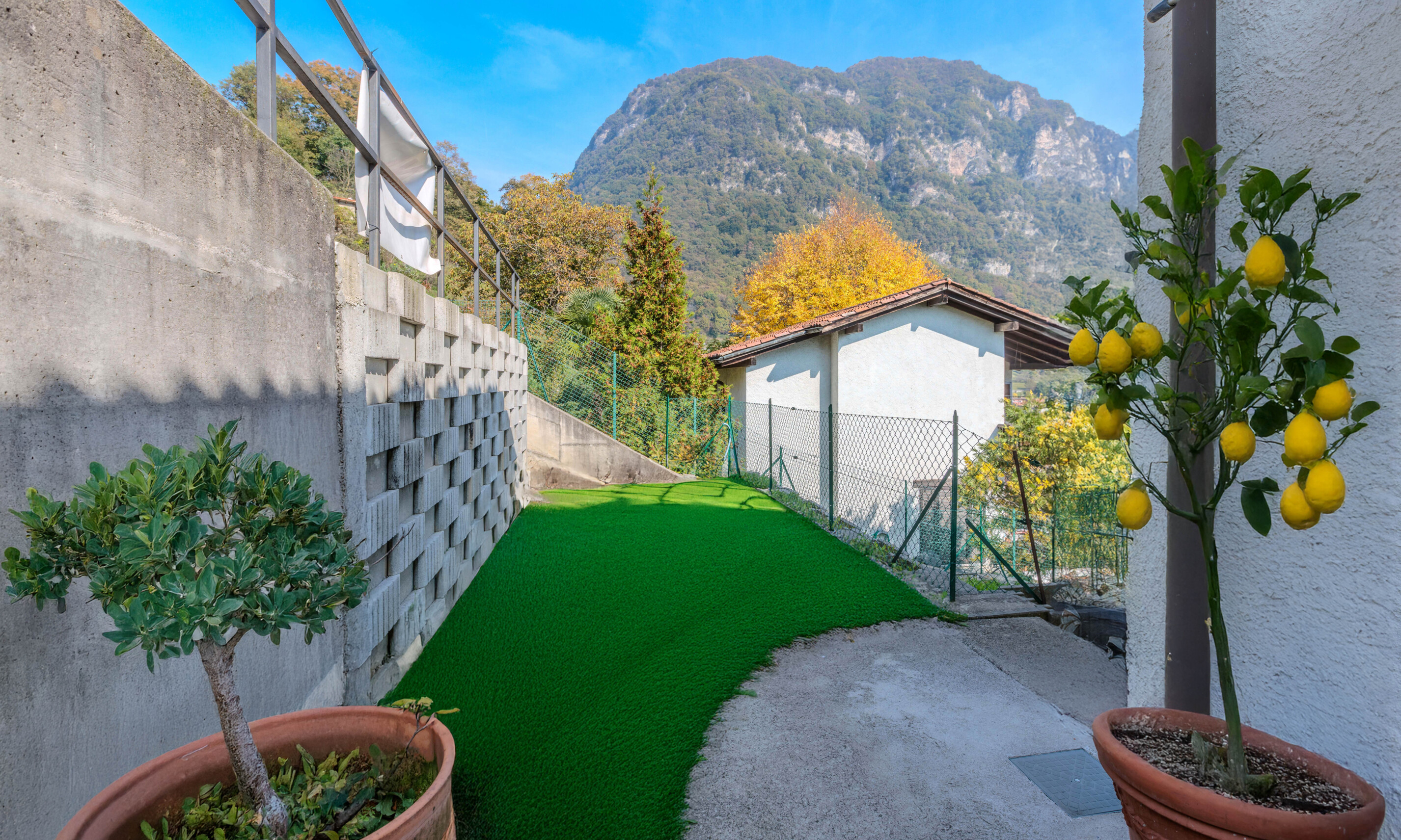 Scendendo al piano terra troviamo un bilocale con cucina abitabile attrezzata, bagno con vasca e una camera, oltre ad un ingresso indipendente e sul giardino.