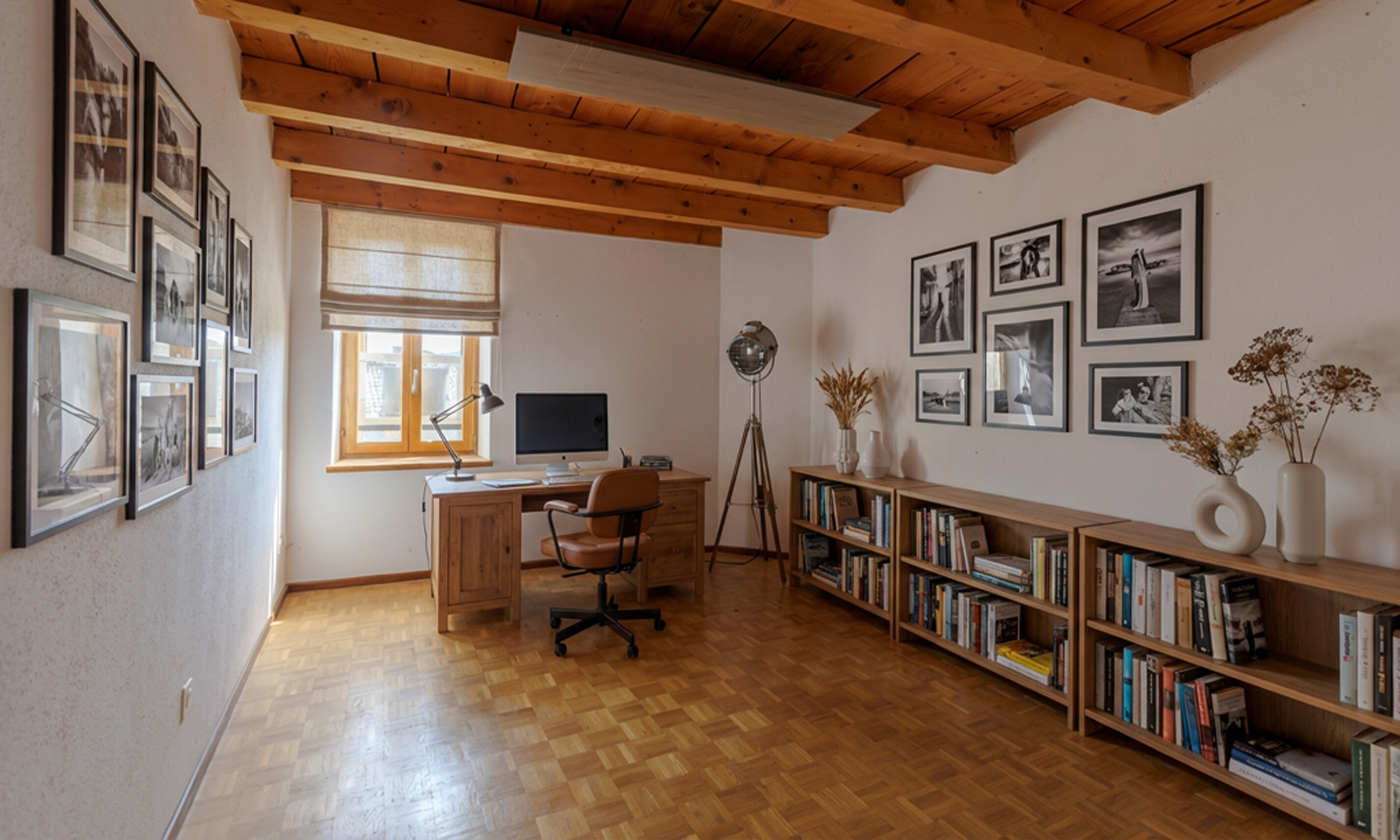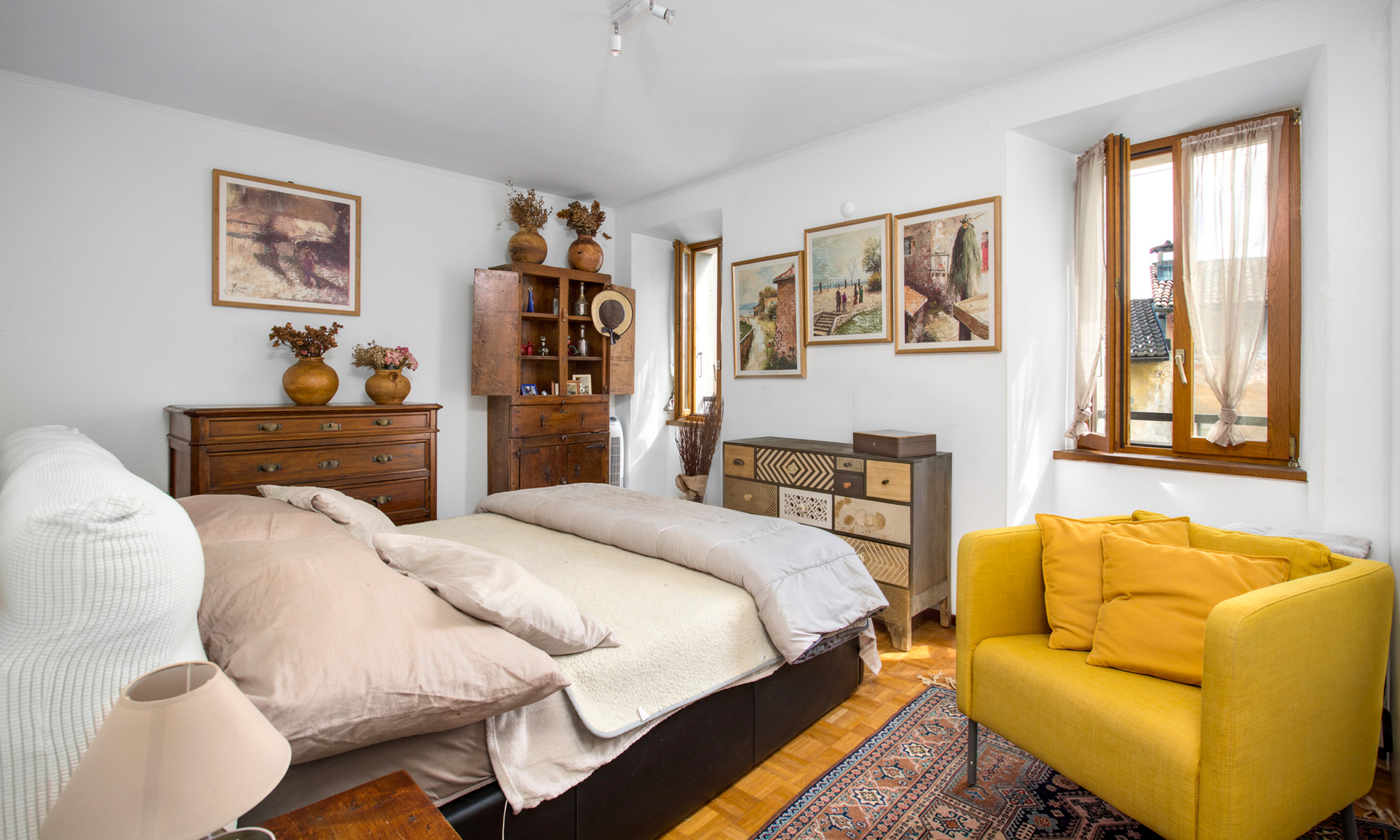 Al piano superiore si trovano 1 spaziosa camera singola (oggi adibita a ufficio) e 1 generosa camera padronale di 21 mq, servita da 1 bagno finestrato con vasca, bidet e zona lavanderia discretamente integrata in un mobile su misura.