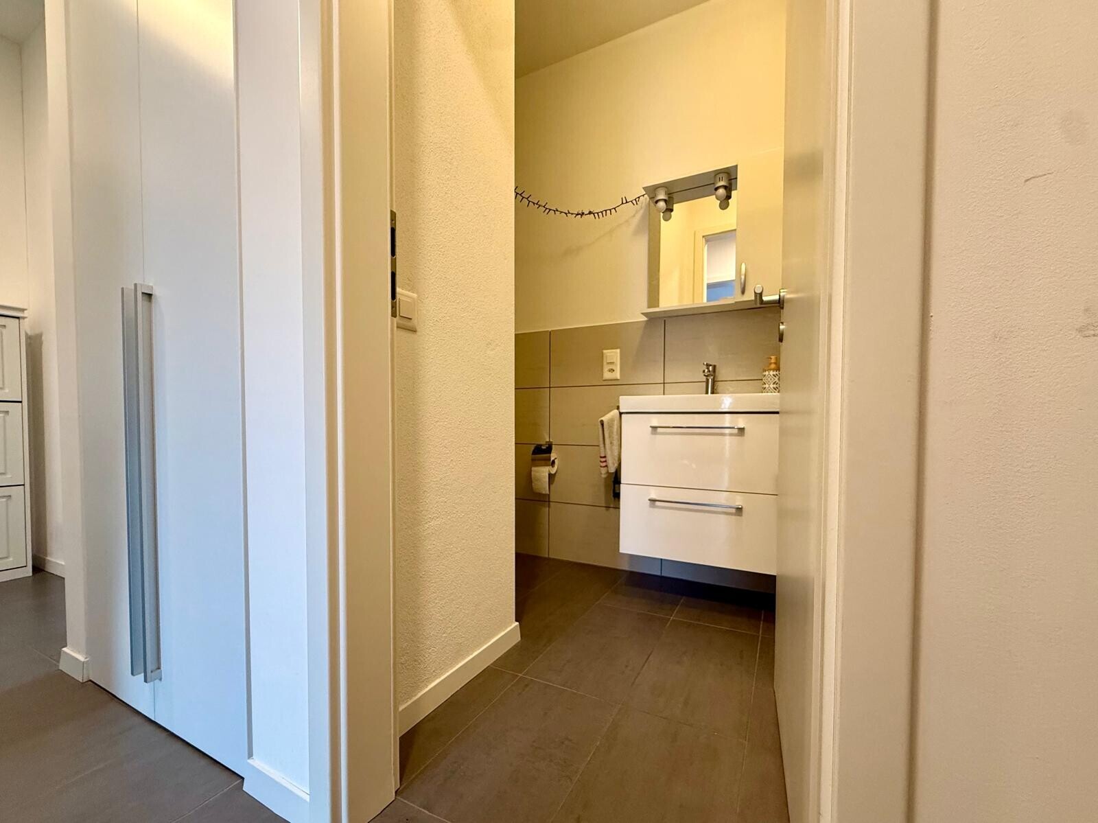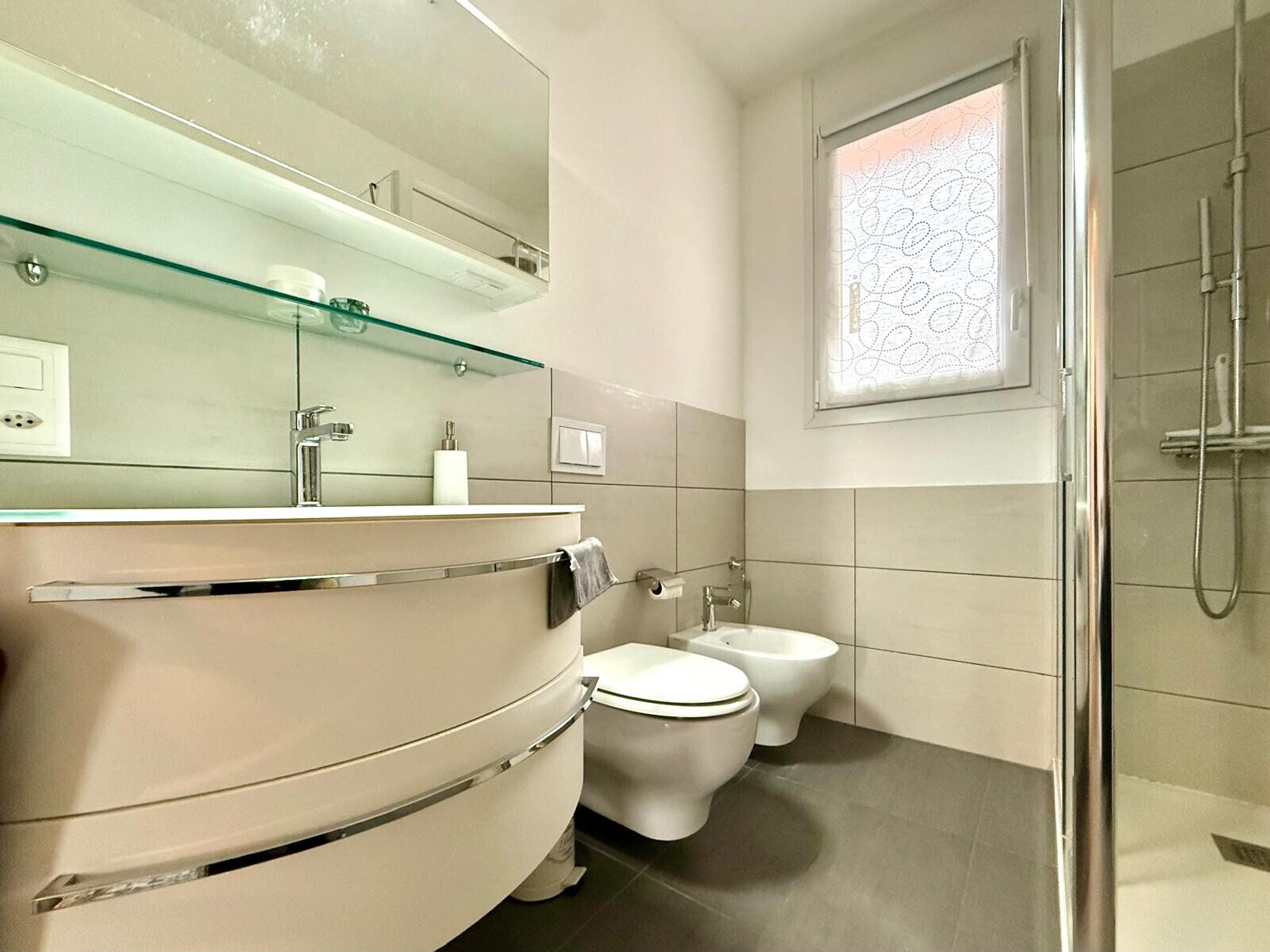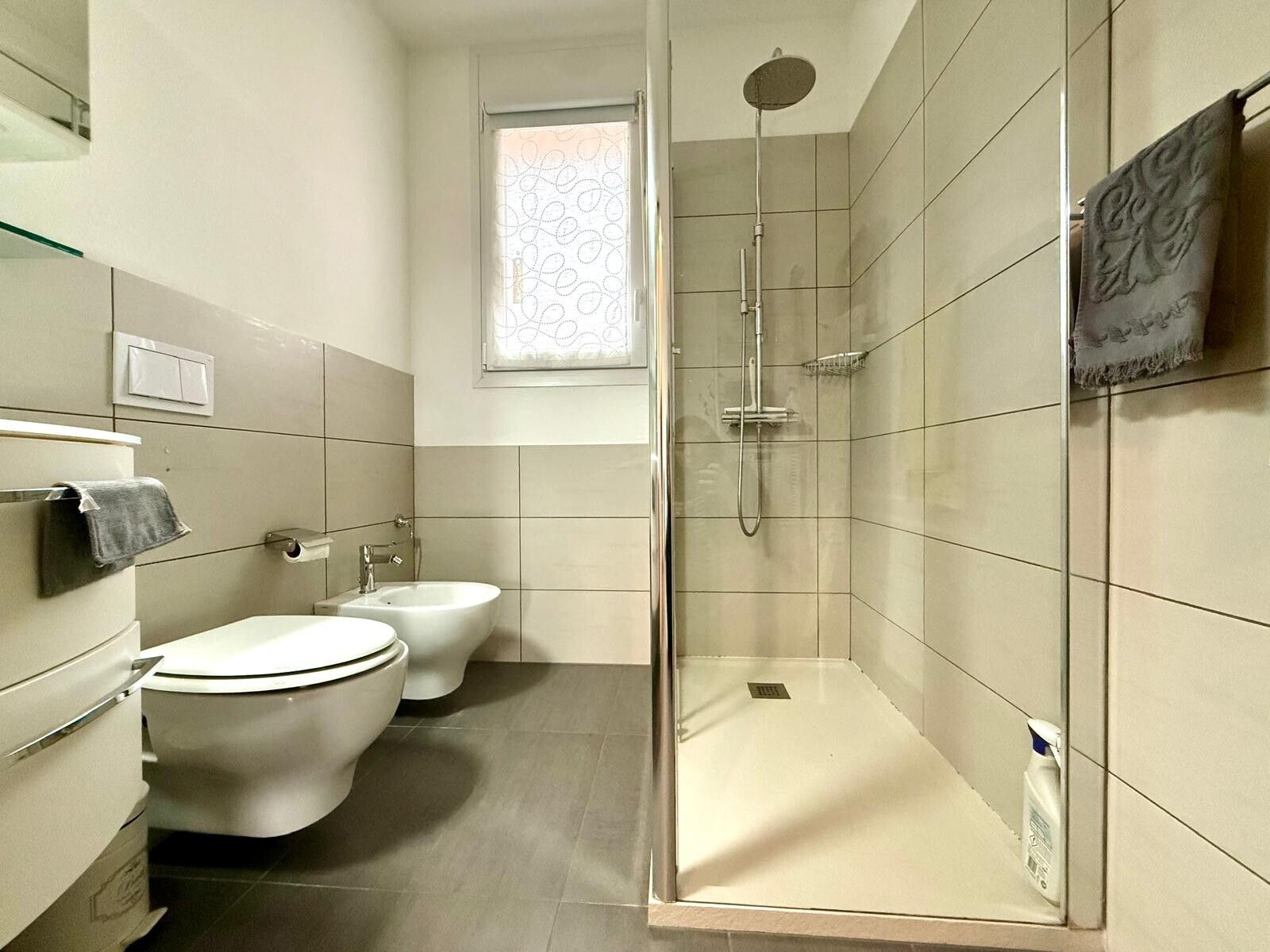 completano l'appartamento un ampio bagno finestrato con moderno box doccia e sanitari sospesi e un bagno per ospiti con colonna lavatrice/asciugatrice.