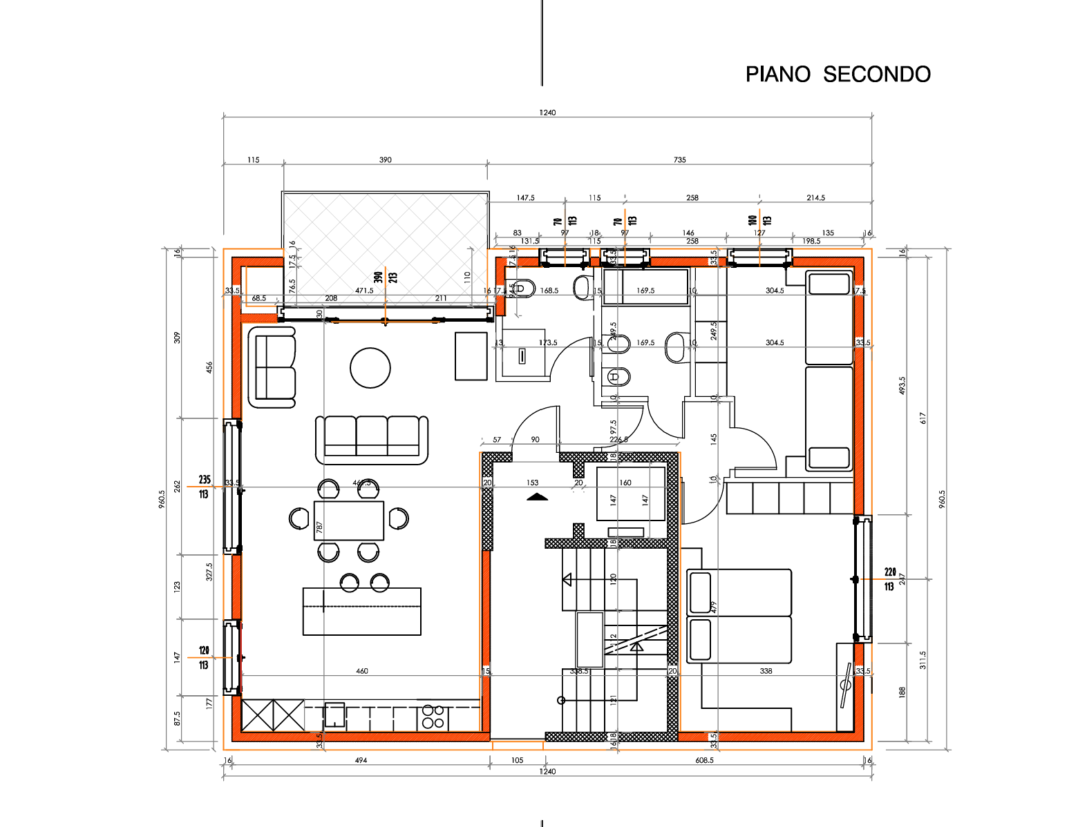 La zona notte comprende una spaziosa camera matrimoniale e una camera singola, servite da un secondo bagno finestrato con vasca, mobile lavabo e sanitari sospesi.