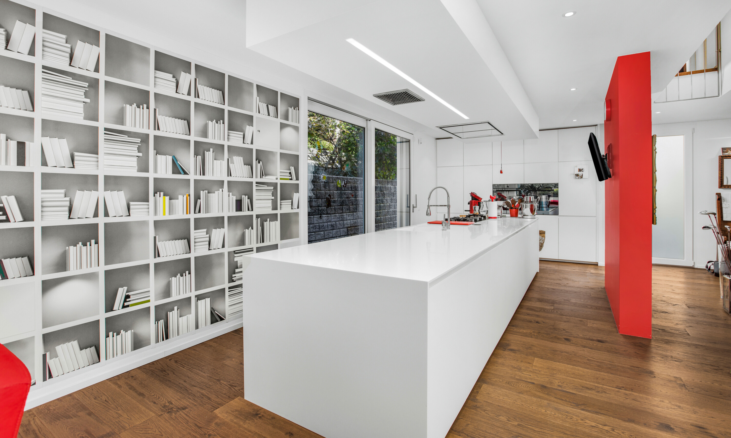 Un ingresso apre su un soggiorno con sala da pranzo, impreziosito da una spettacolare cucina open space con un'imponente isola centrale, progettata per offrire armadietti e spazi contenitivi in ogni lato; questa zona è un vero tempio dell'arte culinaria che farebbe invidia anche ai più grandi chef stellati: forno, steamer, scaldavivande, sistema per vacuum, maxi frigorifero e congelatore, piano cottura a gas, lavastoviglie e superfici in Corian di altissimo pregio.