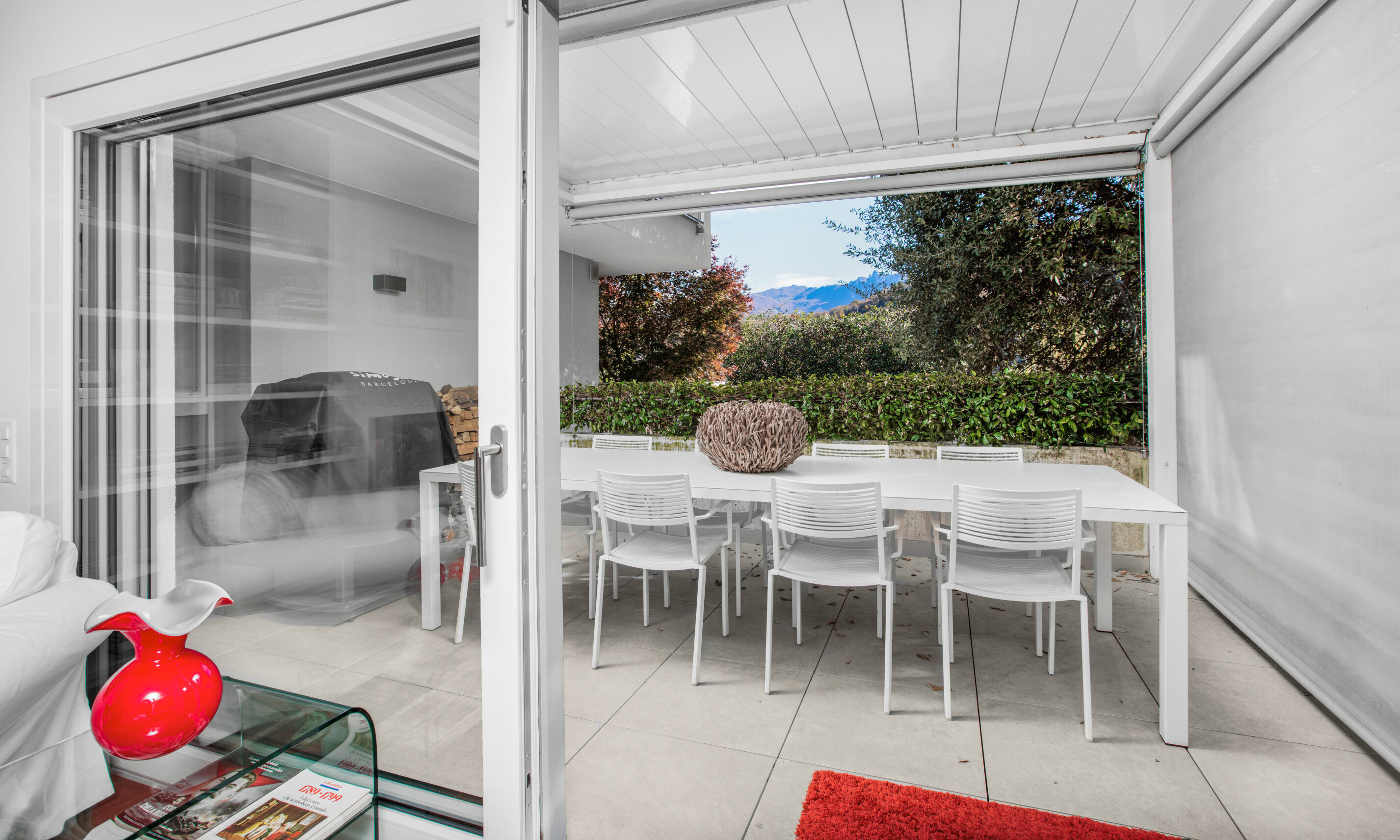 La zona living, con camino, si affaccia su una veranda accogliente con pergola bioclimatica, tende oscuranti, giardino curato e spazio dedicato all'orto.