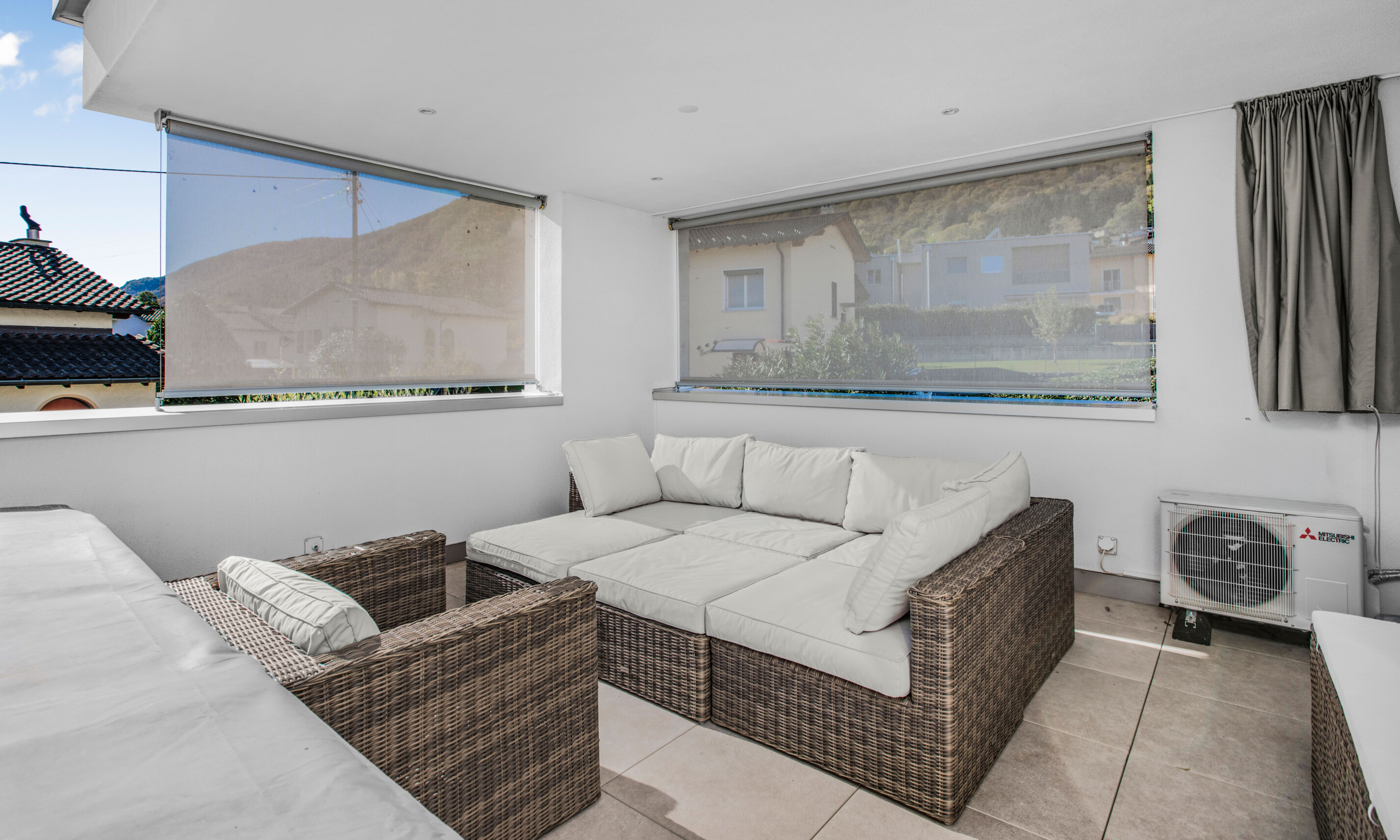 Al piano superiore, molto luminoso grazie ad un lucernario è stato disposto un ulteriore soggiorno con uscita su una grande veranda coperta con jacuzzi in rattan "Playa" by Laghetto perfetta per momenti di puro relax in totale privacy, circondati da verde e vista sui monti.