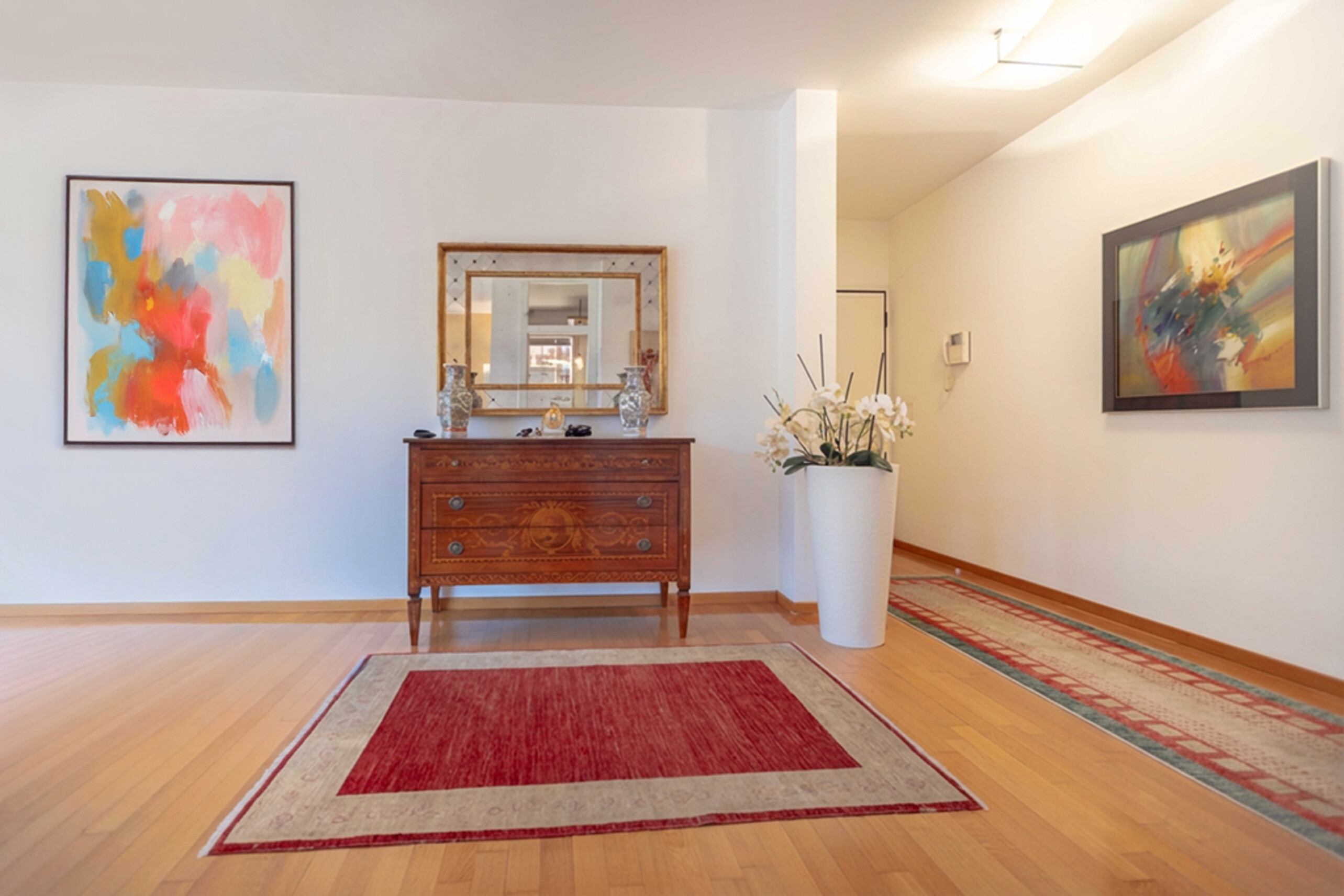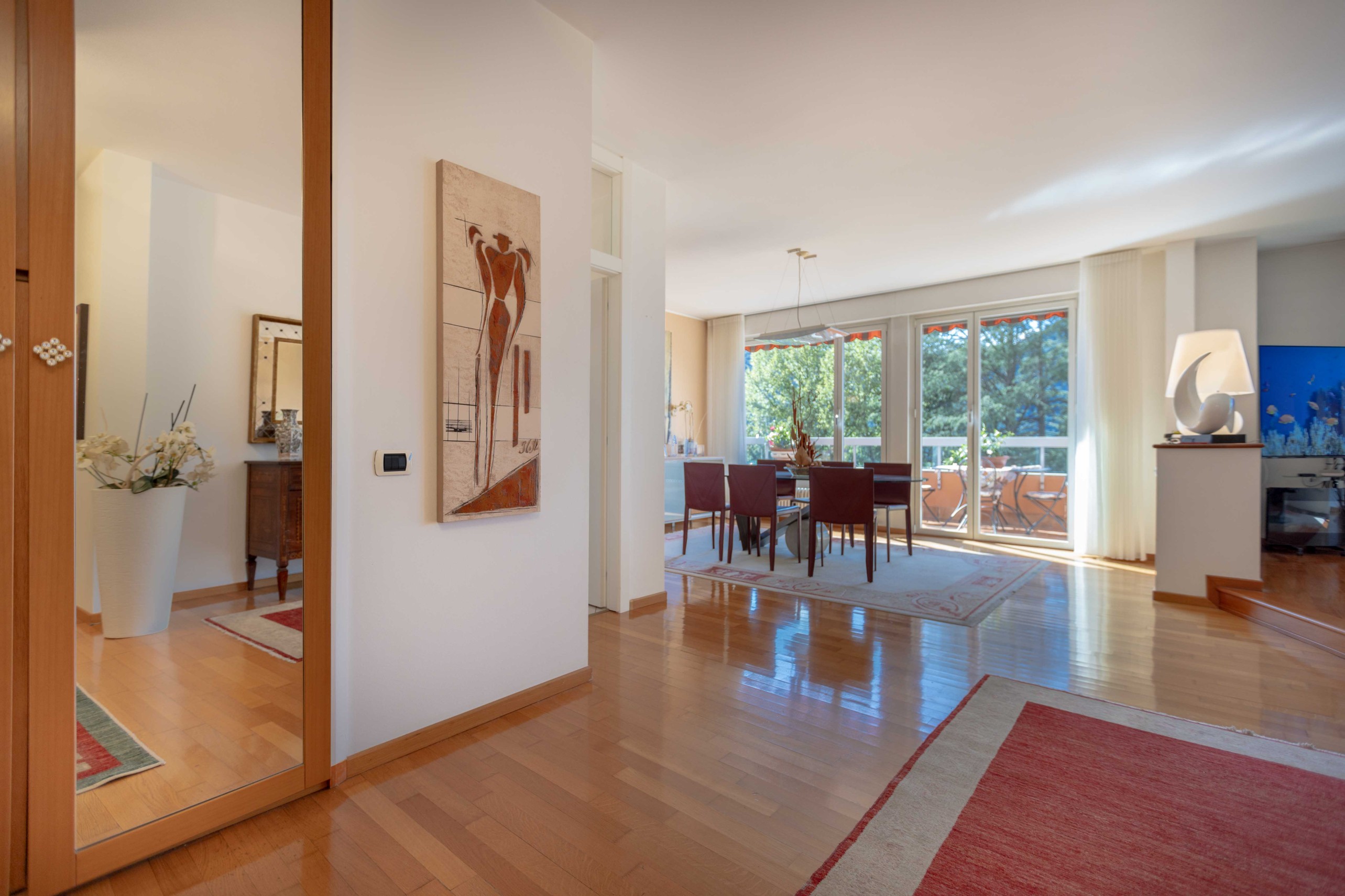 L'ingresso, ampio e funzionale, è dotato di armadio a muro ad uso guardaroba e conduce alla luminosa zona living. Qui grandi finestre valorizzano la vista sul lago e regalano una straordinaria luminosità naturale agli ambienti. Il soggiorno, accogliente e ben distribuito, ospita comodamente sia l'area relax sia una piacevole zona pranzo.