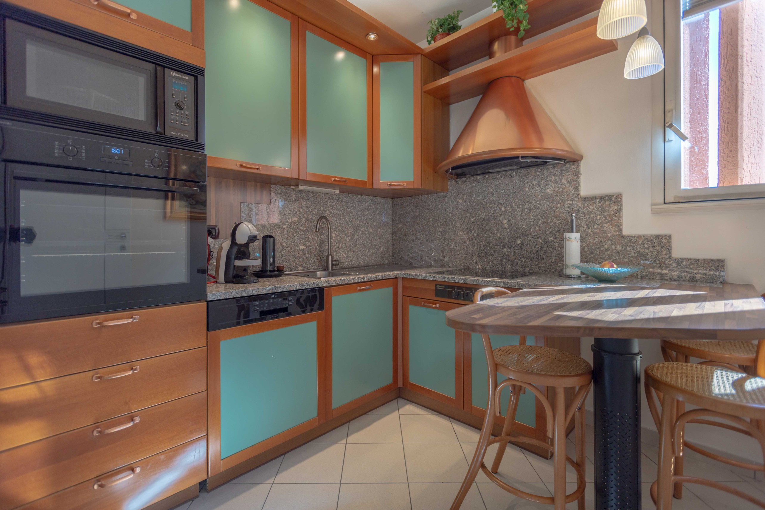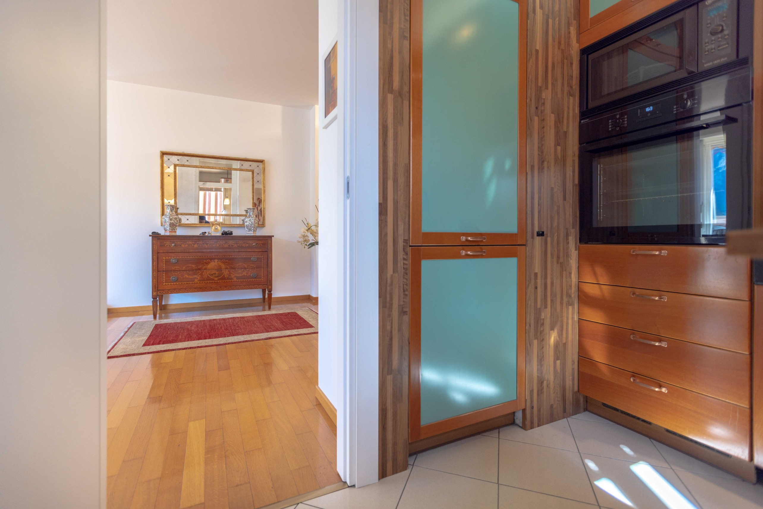 La cucina separata, funzionale e ben attrezzata con elettrodomestici moderni, offre la possibilità di essere facilmente aperta sulla zona giorno, creando un ambiente open space contemporaneo con interventi contenuti.
