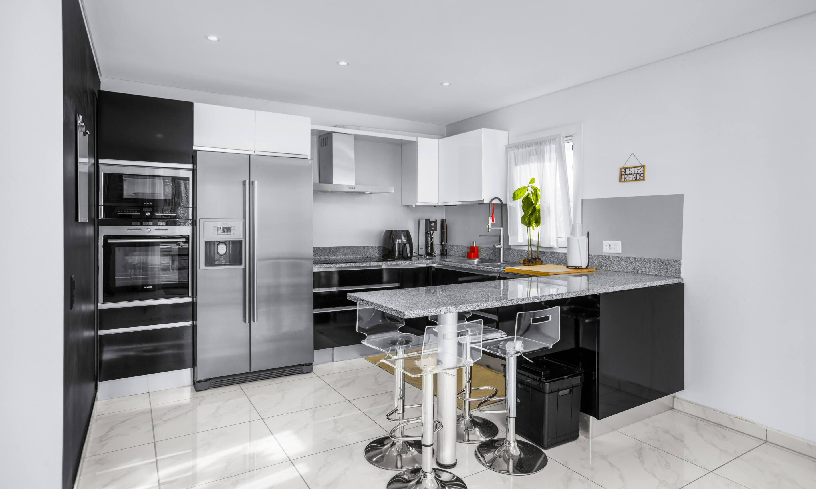 L'ingresso al piano terra si apre su un atrio comune che collega i due piani. Da qui si accede alla zona living di circa 58 mq, un ambiente accogliente con ampia cucina moderna completamente accessoriata: forno, frigo americano, microonde, lavastoviglie, piano a induzione e grandi portefinestre che si aprono sul giardino.