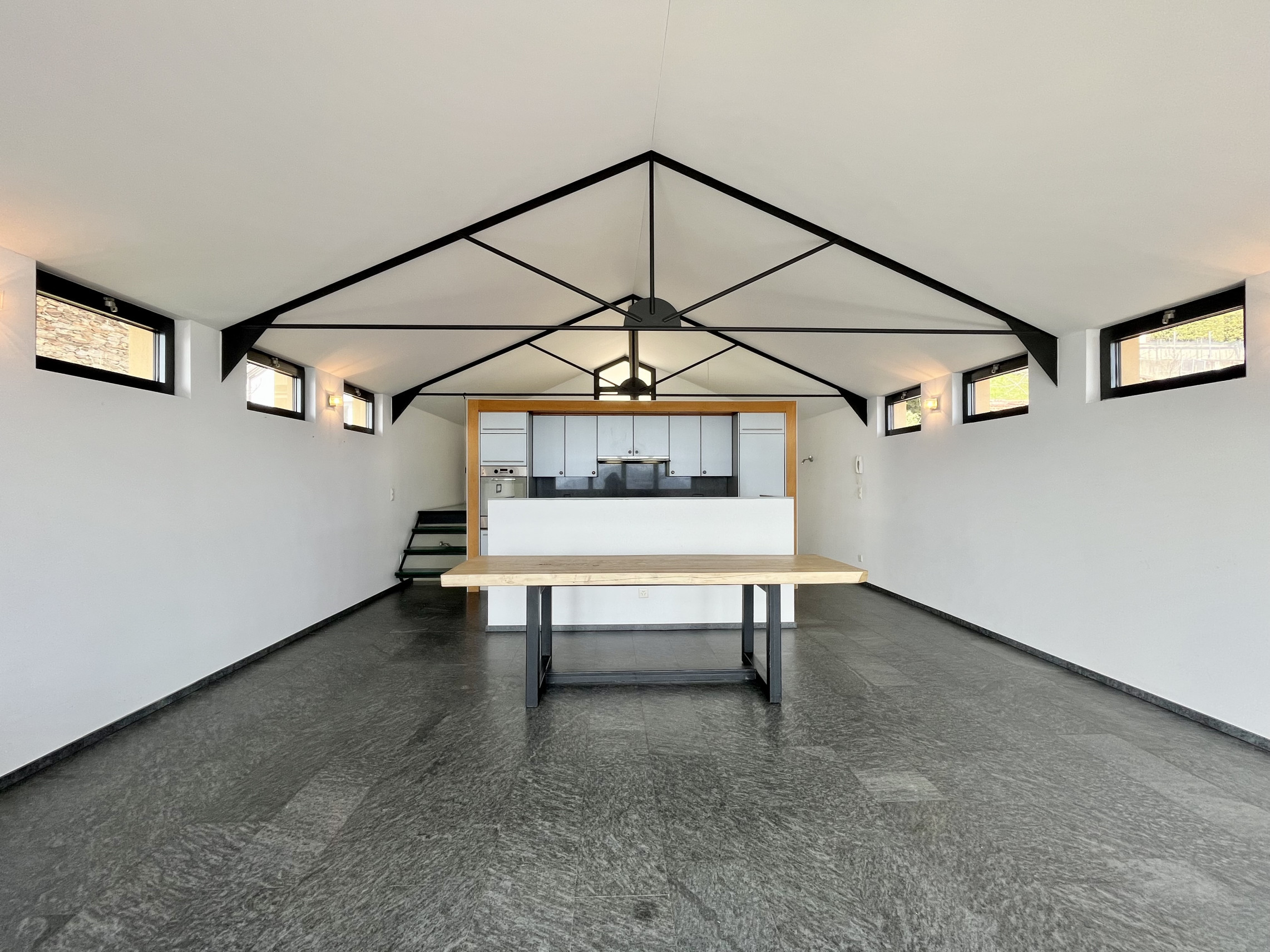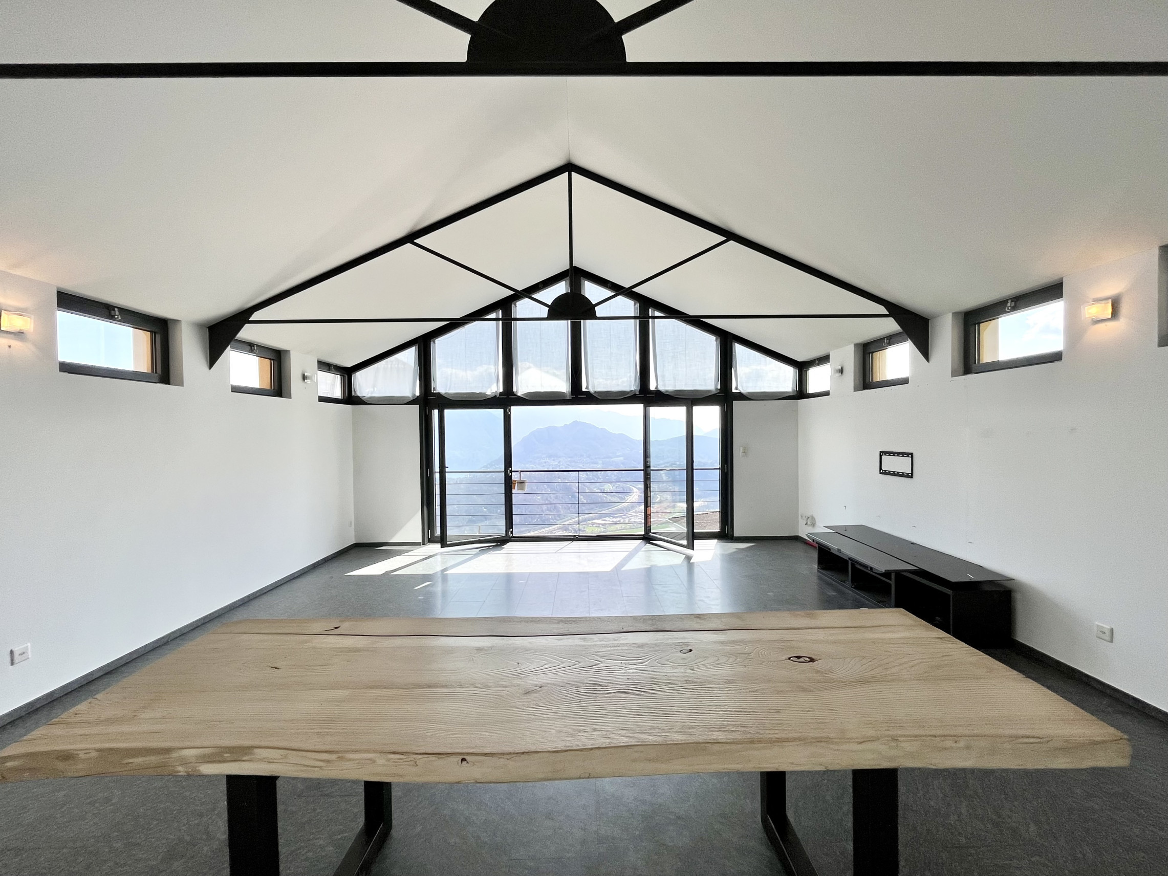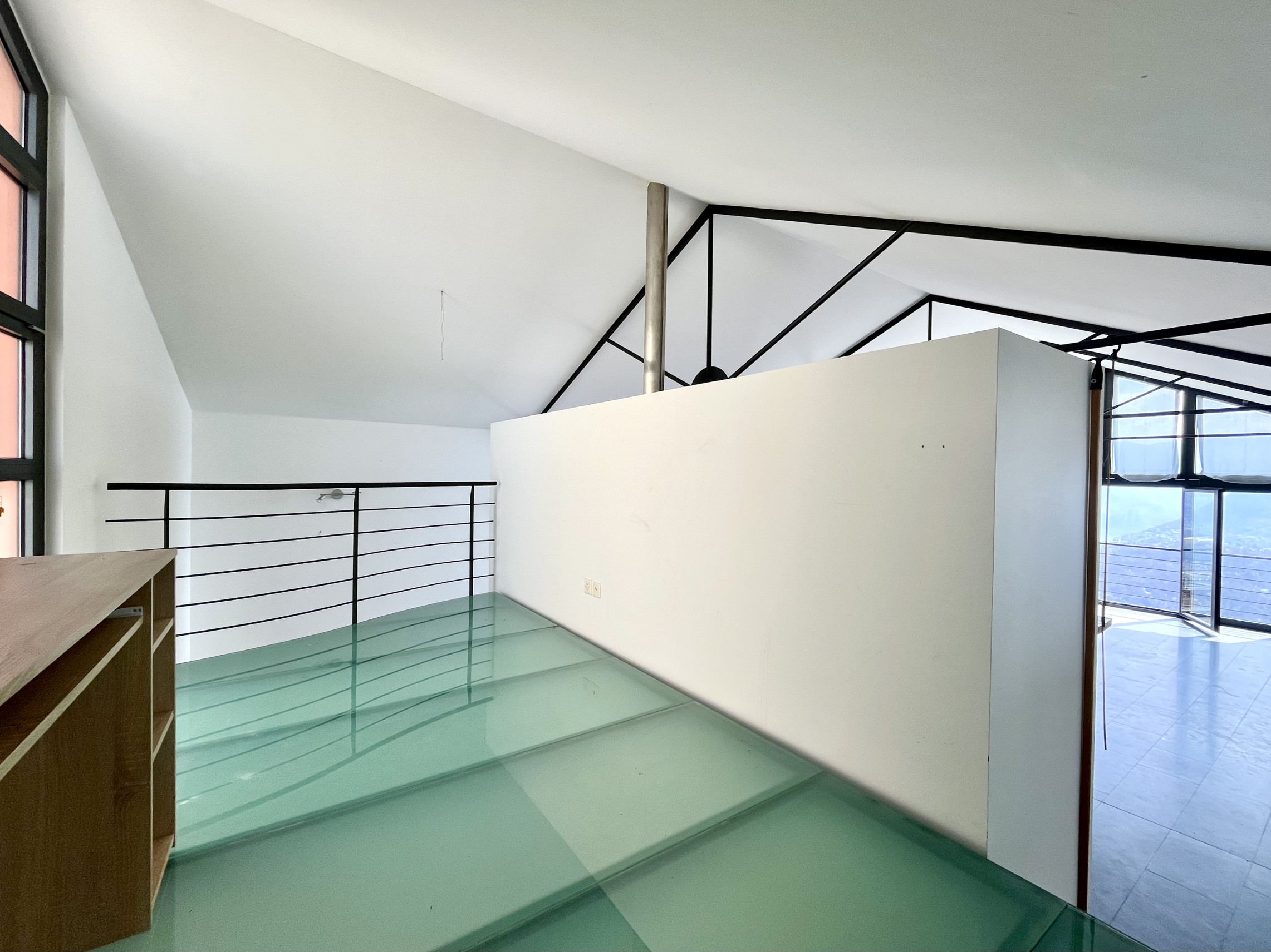 Salendo la scala arriviamo nella zona giorno con soffitti cattedrali con travi a vista moderne e vista panoramica sulla vallata. Circa 50 mq divisi tra salone, pranzo e cucina aperta con isola attrezzato di piano di cottura al induzione, frigo, lavastoviglie e forno, completa la zona giorno uno studio sul soppalco con pavimento in vetro calpestabile.