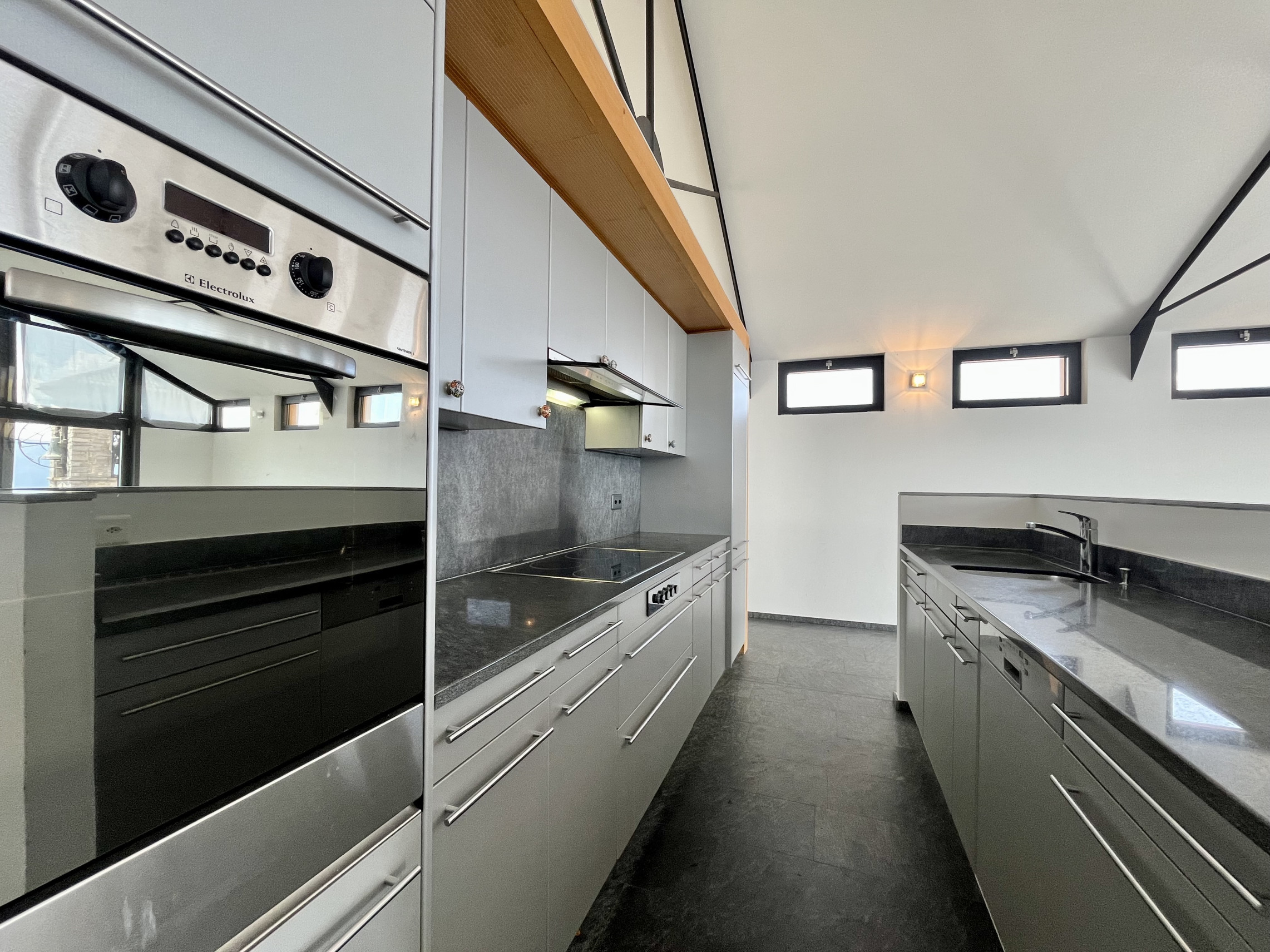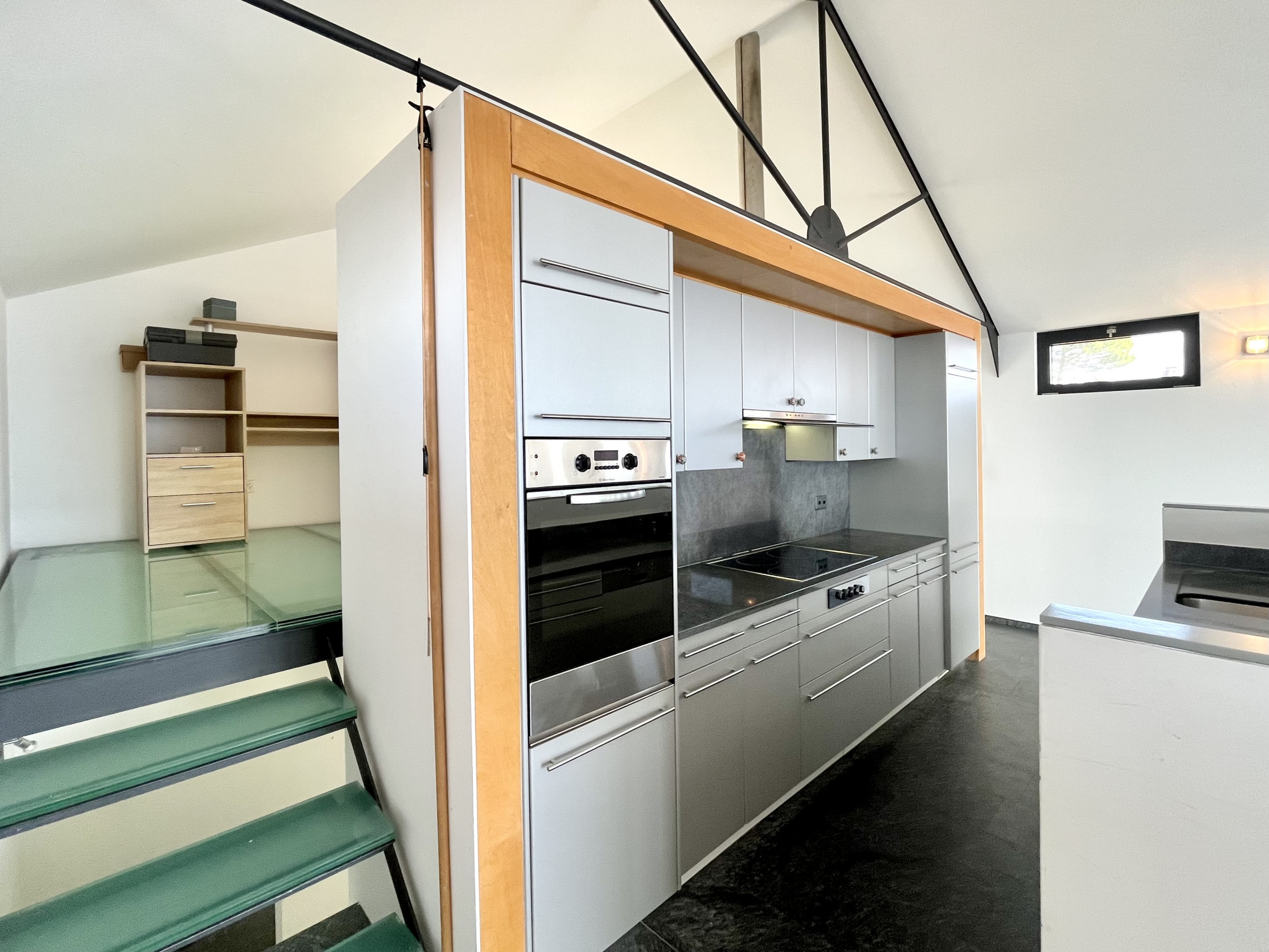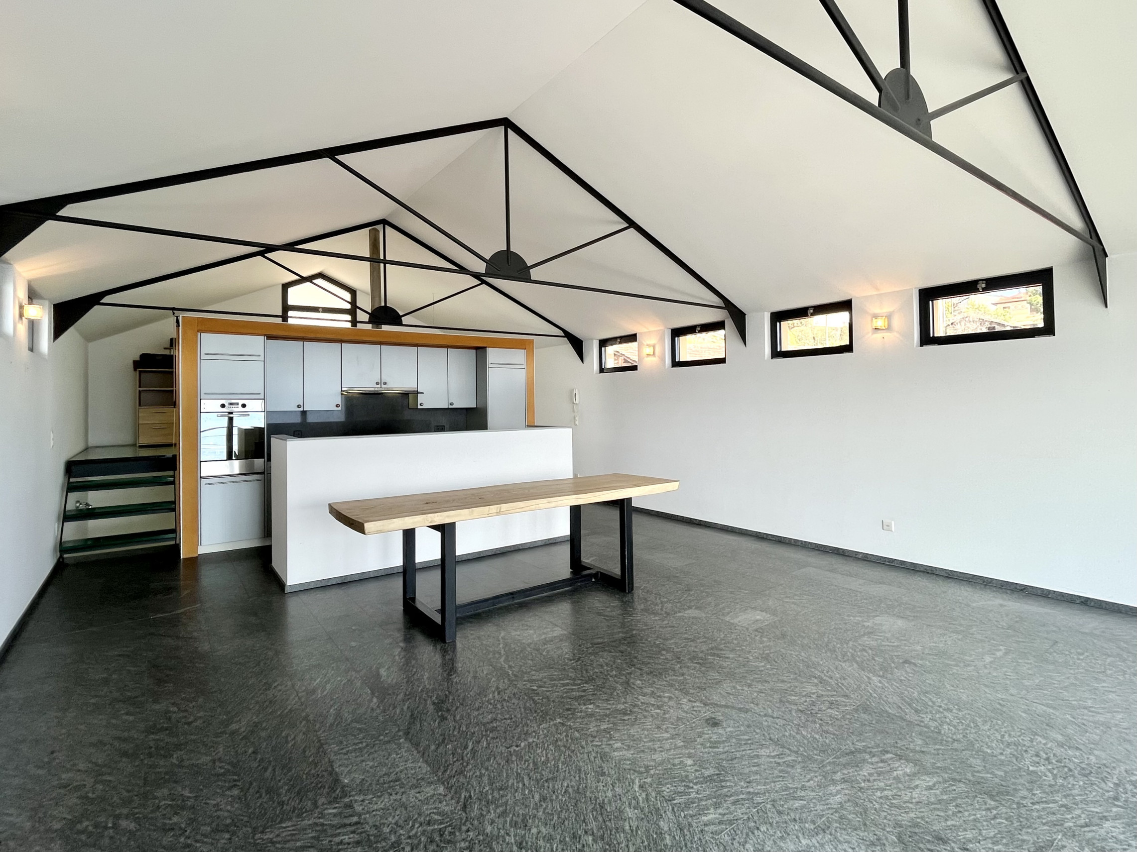 Salendo la scala arriviamo nella zona giorno con soffitti cattedrali con travi a vista moderne e vista panoramica sulla vallata. Circa 50 mq divisi tra salone, pranzo e cucina aperta con isola attrezzato di piano di cottura al induzione, frigo, lavastoviglie e forno, completa la zona giorno uno studio sul soppalco con pavimento in vetro calpestabile.