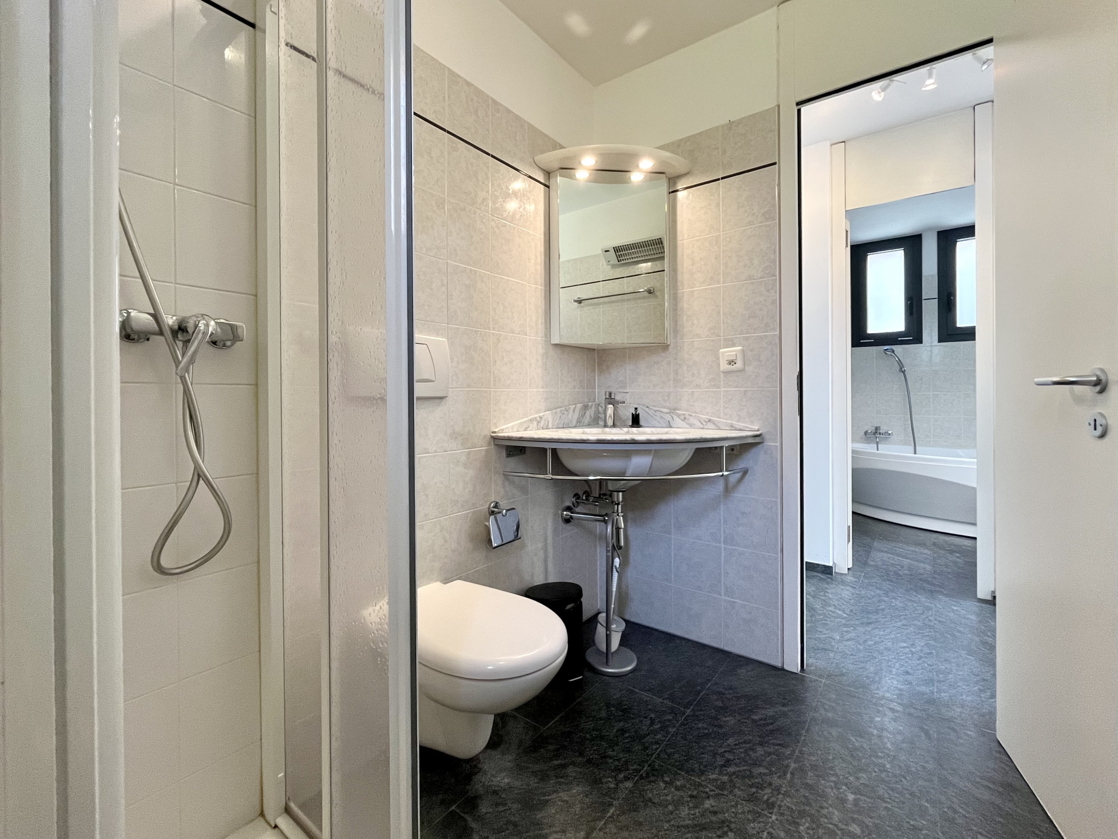 Scendendo nella zona notte, troviamo degli armadi sotto scala nell'atrio, seguito da due bagni finestrati: uno con vasca, l'altro con doccia e locale lavanderia privata.