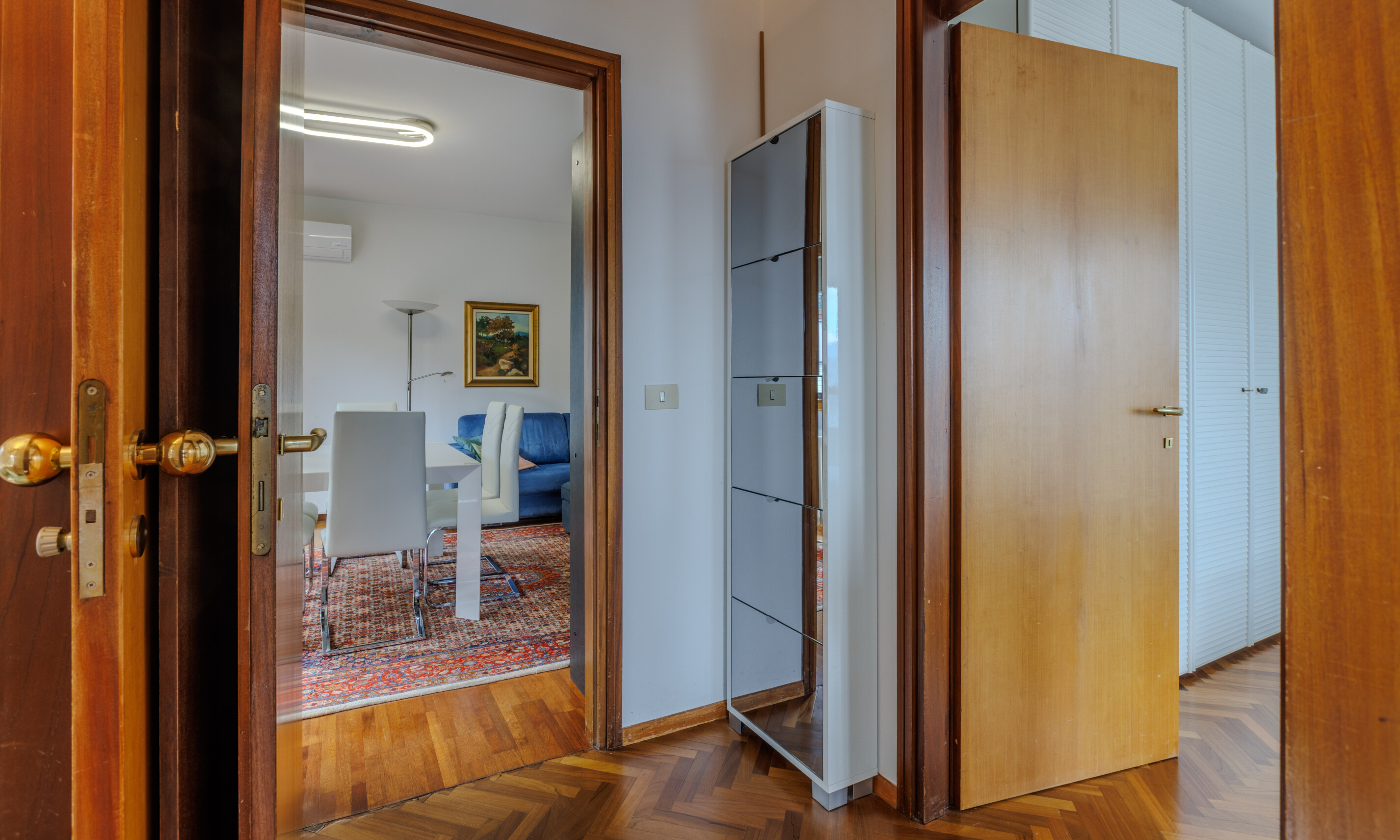 Ingresso, vano con possibilità di inserire un armadio a muro, ampio salone con pavimento rivestito con pregiato parquet di rovere ed accesso diretto al terrazzo, cucina separata con ampie finestre, 2 camere da letto matrimoniali con eccezzionale vista lago ed un bagno finestrato dotato di vasca ed allacciamenti per una lavatrice privata.
