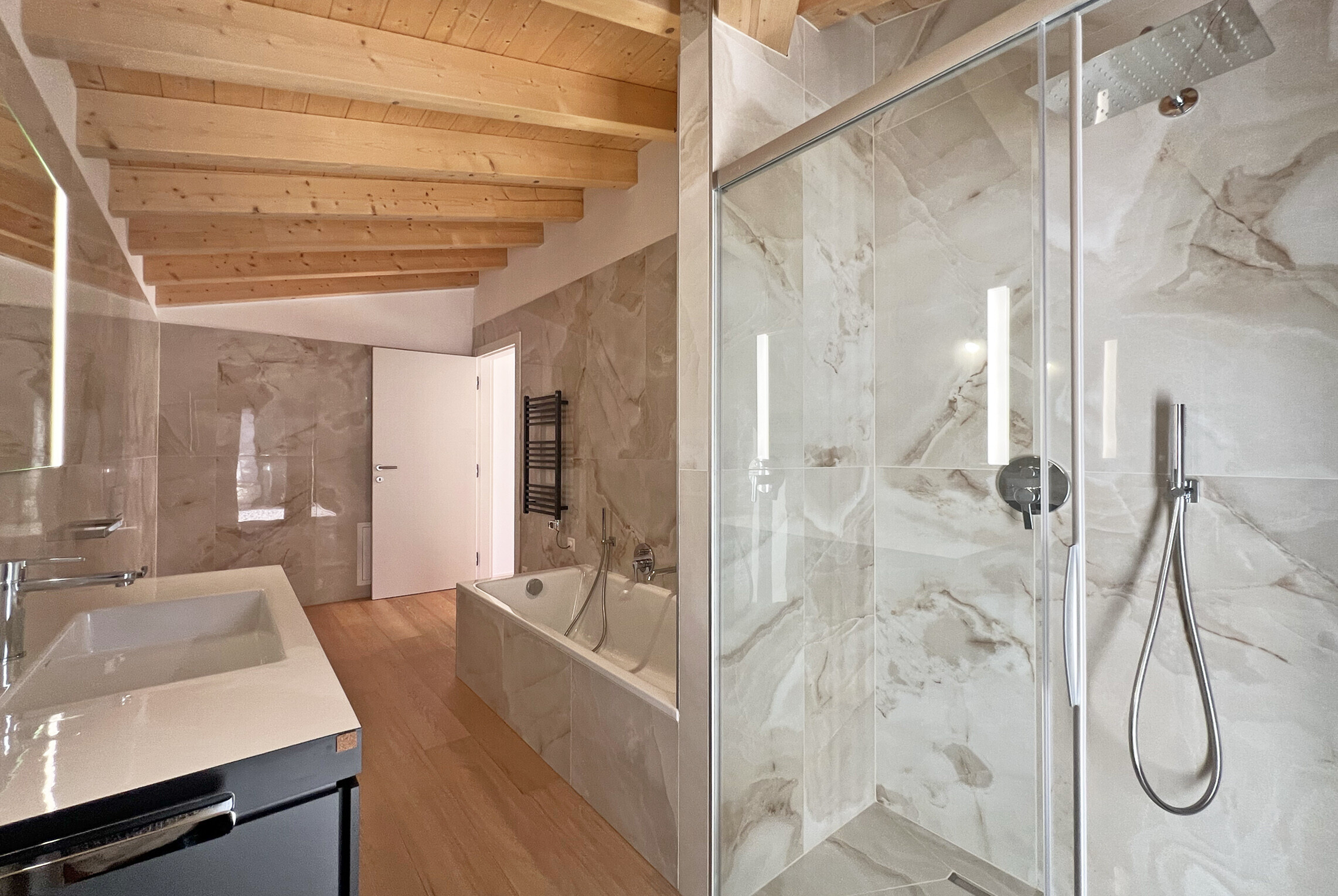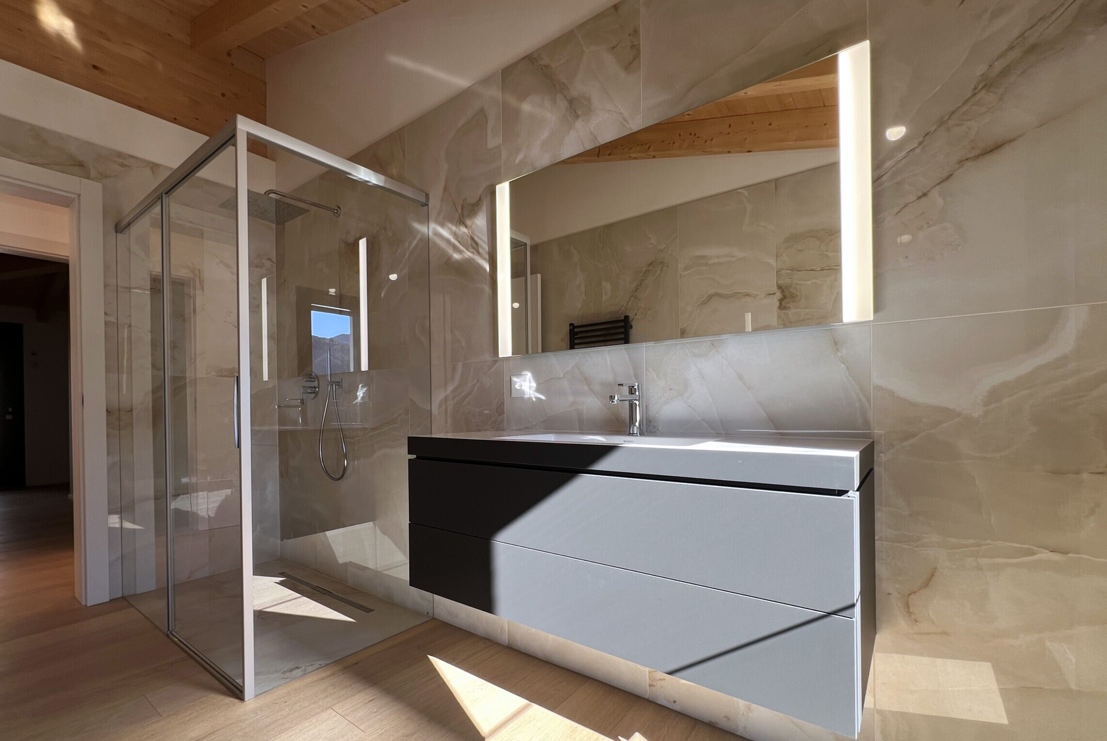 Al piano inferiore si trova una seconda zona notte, perfetta per figli, ospiti o personale: due ulteriori camere da letto di ottima metratura servite da un bagno con doccia, in un ambiente tranquillo e riservato.