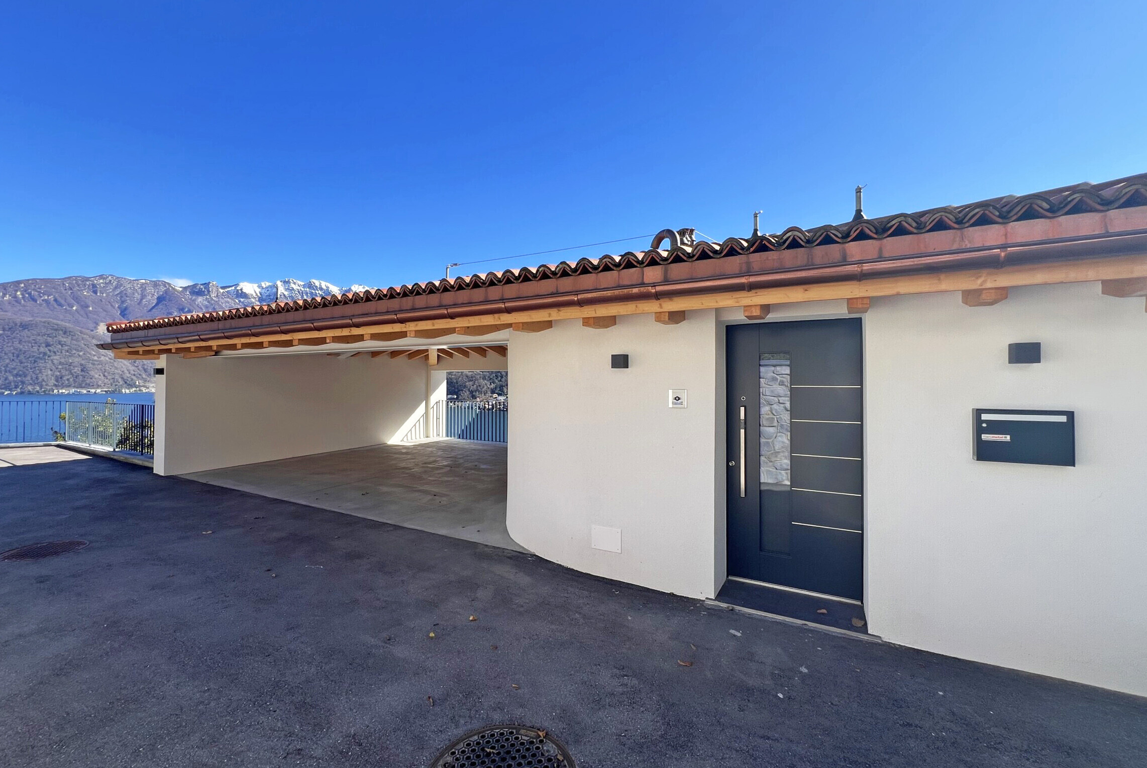 L'accesso avviene tramite un ampio piazzale con numerosi posti auto esterni e una grande tettoia coperta per due auto, adiacente all'ingresso principale, che garantisce massima comodità in ogni stagione.