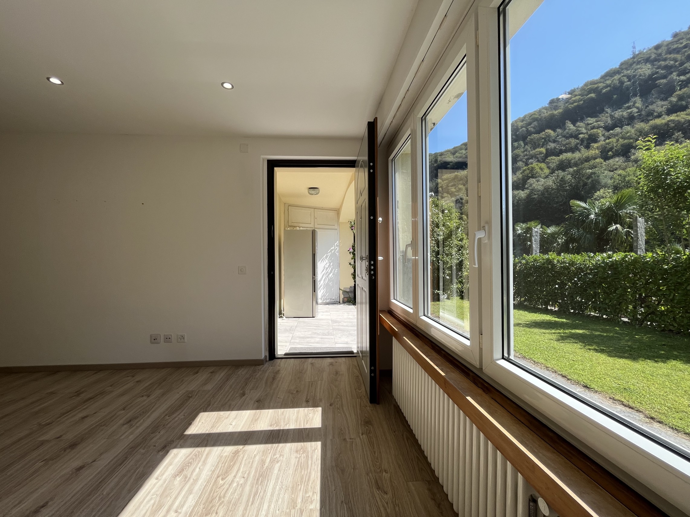 Ingresso dal giardino privato tramite porta blindata sul luminoso soggiorno/sala da pranzo, con cucina a vista nuova ed accessoriata con forno e fornelli ad induzione, lavastoviglie, frigorifero e congelatore.