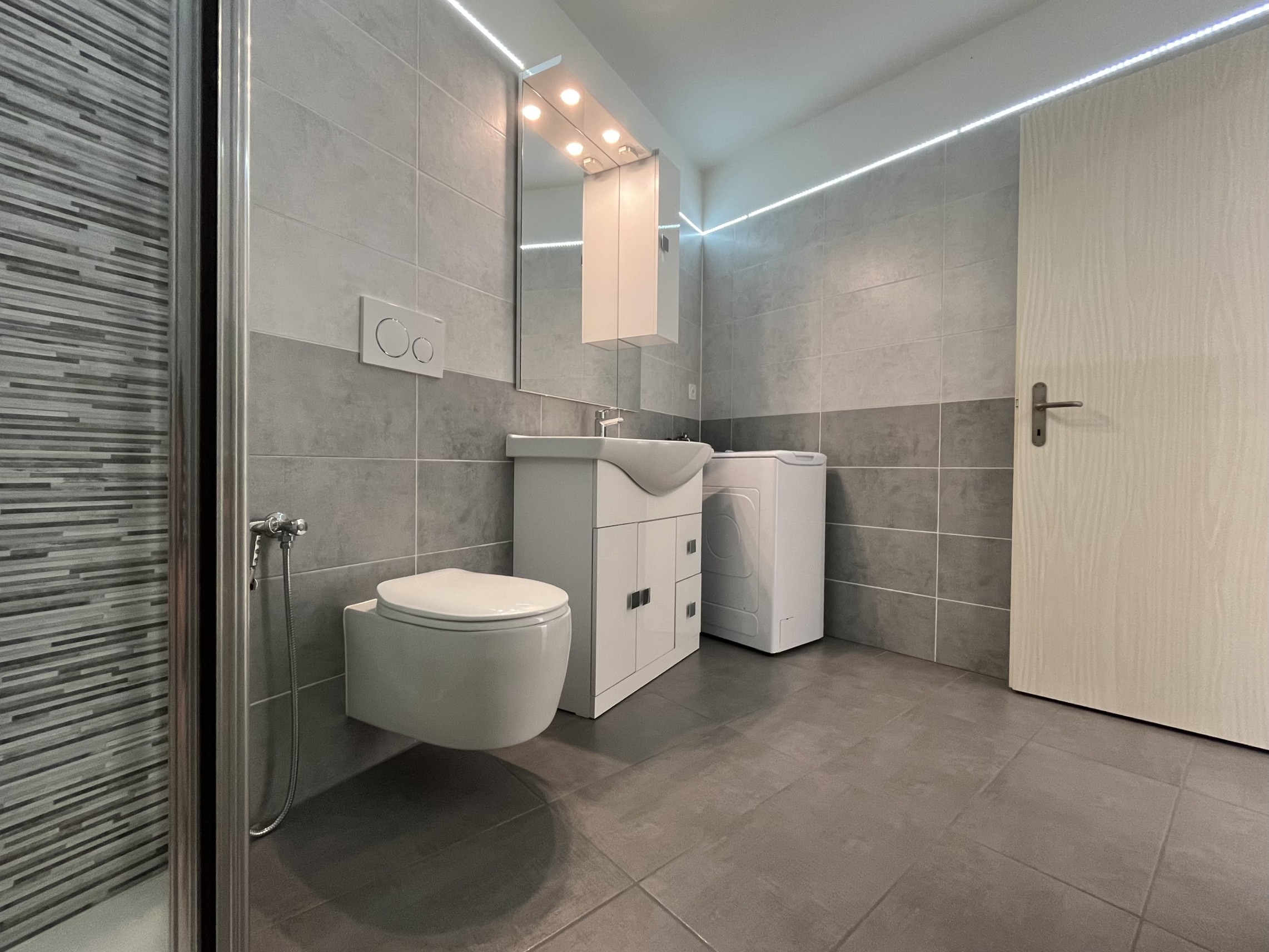 Completa l'unità abitativa un bagno adiacente con box doccia, e lavatrice privata, seguito da una camera matrimoniale con accesso diretto al giardino.