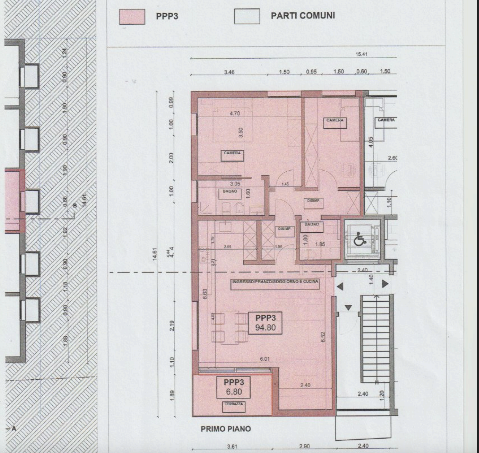 L'appartamento (PPP 3) é situato al primo piano ed è composto da ingresso, disimpegno, cucina aperta su zona pranzo, soggiorno con accesso a balcone di circa 7 Mq, camera matrimoniale con bagno doccia padronale finestrato, 1 camera servita da bagno con doccia.