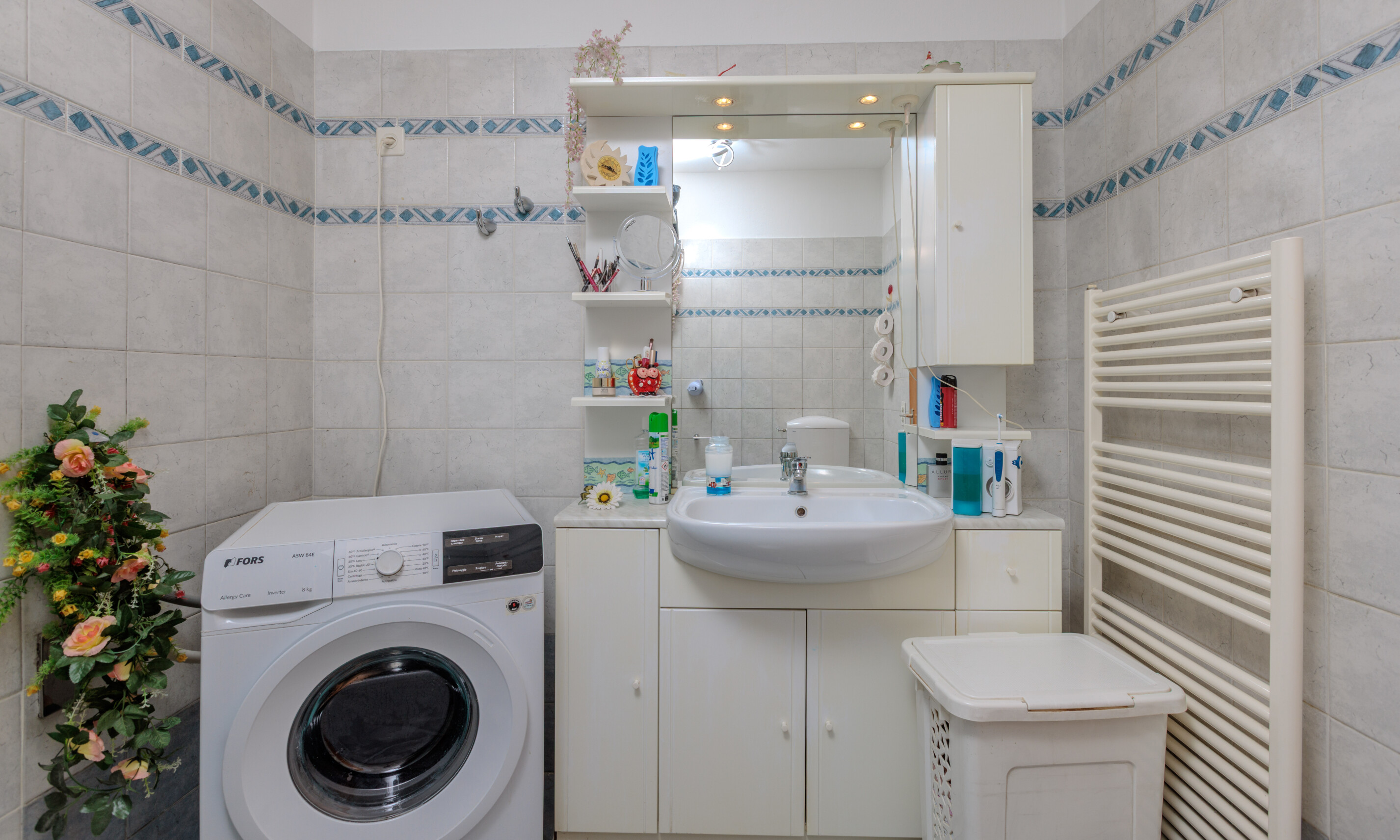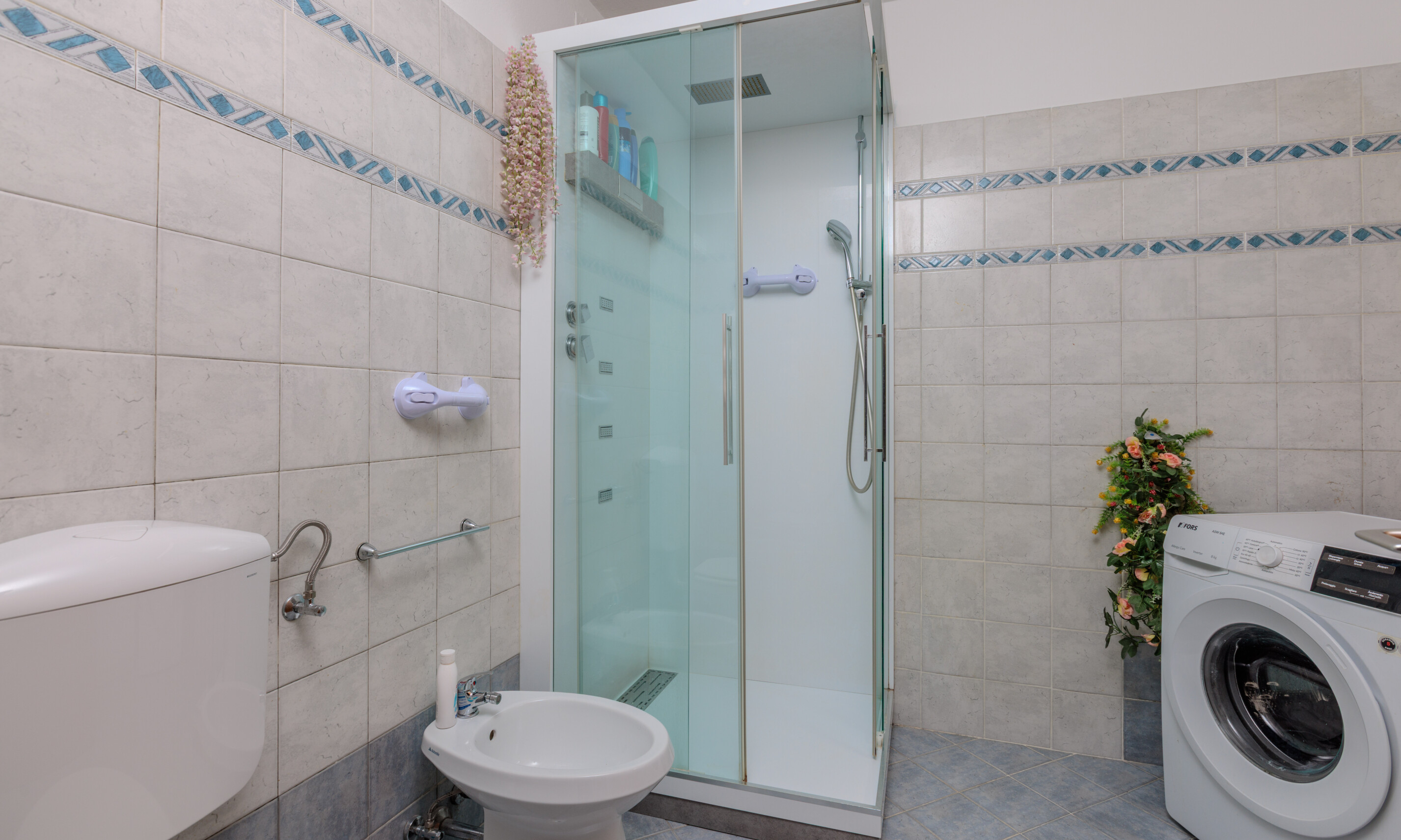 La zona notte, ben separata dalla zona giorno, comprende una camera matrimoniale e due camere singole, servite da un bagno completo di sanitari, doccia e predisposizione per la lavatrice.