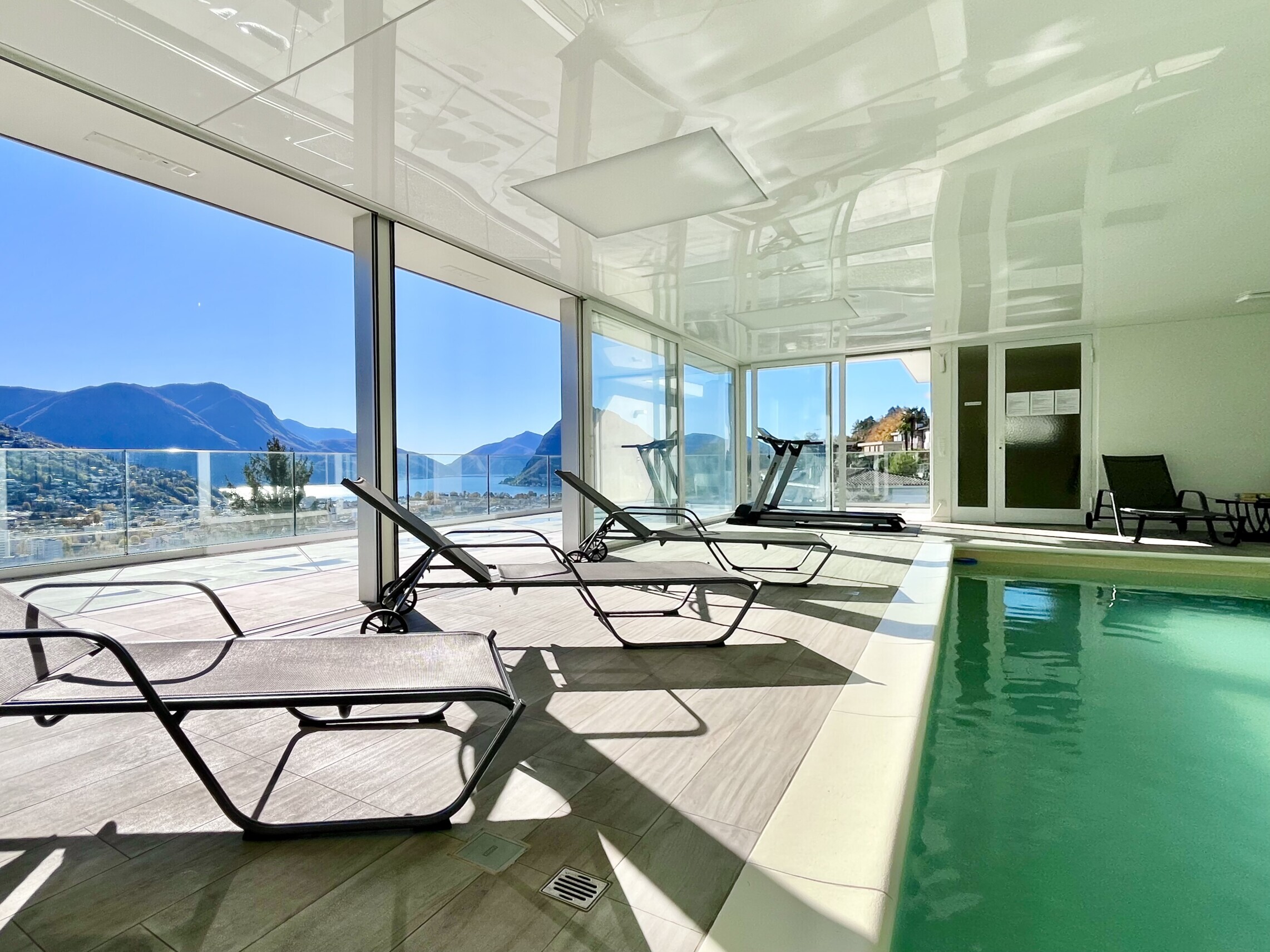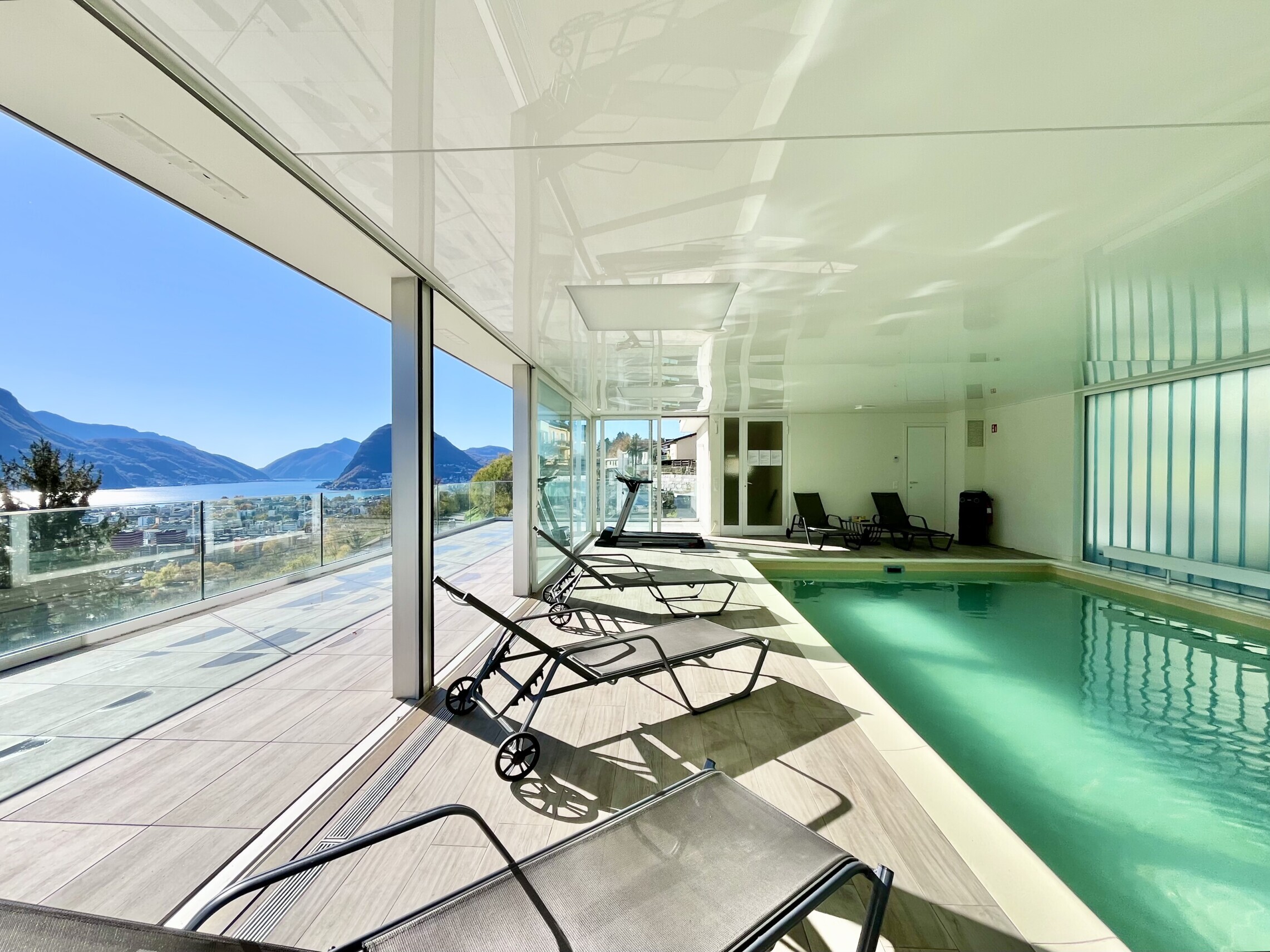L'edificio vanta un'esclusiva area benessere panoramica all'ultimo piano: una piscina condominiale riscaldata tutto l'anno, una palestra attrezzata e un bagno turco, il tutto immerso in un ampio solarium con vista a 180° sul lago - un'oasi privata di relax e bellezza.