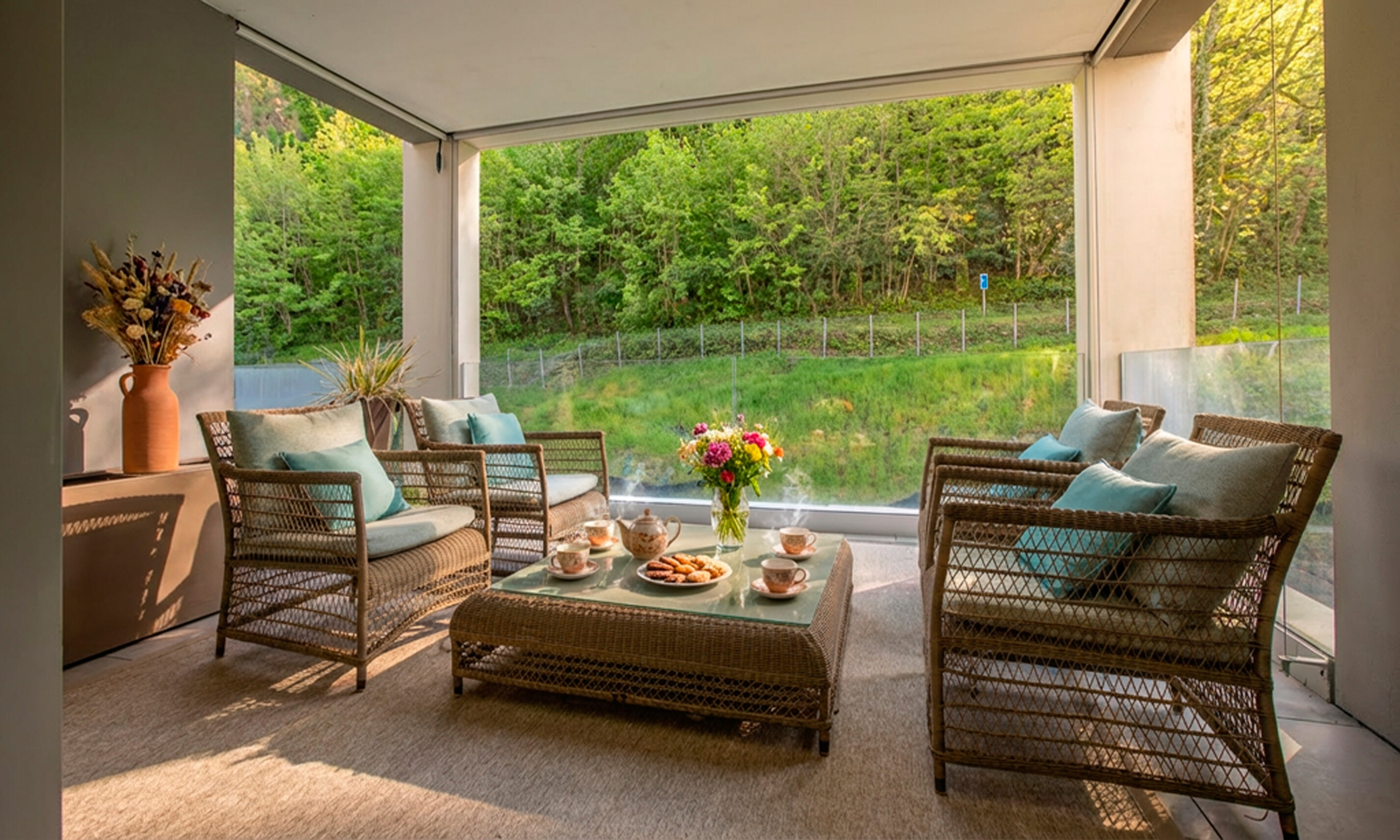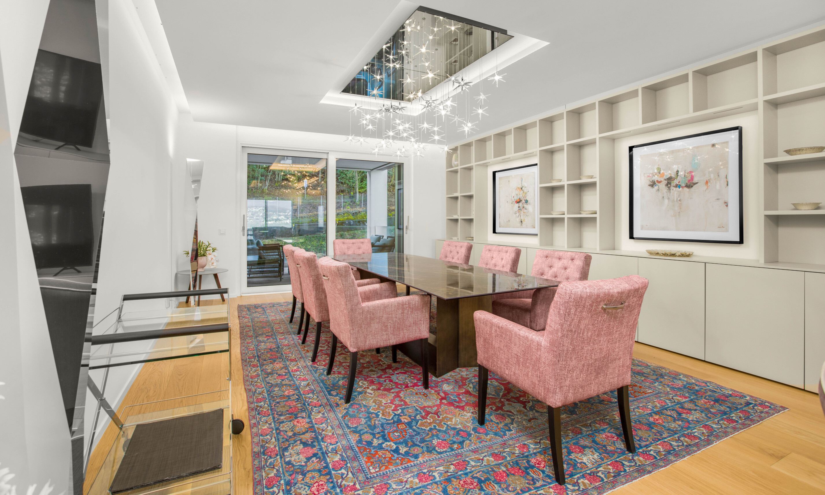 Il soggiorno si collega alla sala da pranzo, valorizzata da una grande vetrata panoramica che regala una vista straordinaria sul lago e consente l'accesso diretto al terrazzo coperto, perfettamente vivibile.