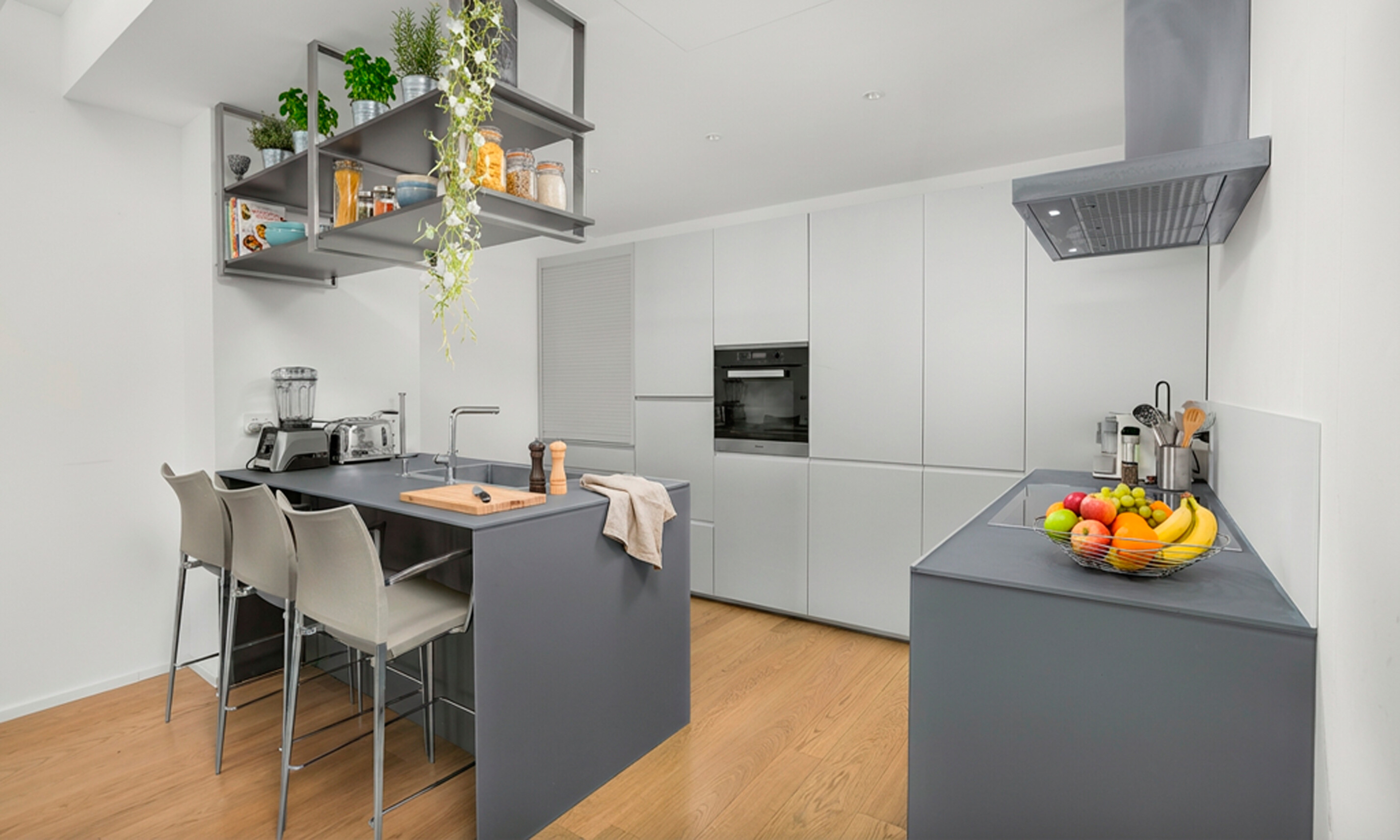 La zona living è completata da una raffinata cucina open space con penisola, perfettamente integrata negli arredi su misura e pensata per un utilizzo conviviale e funzionale.