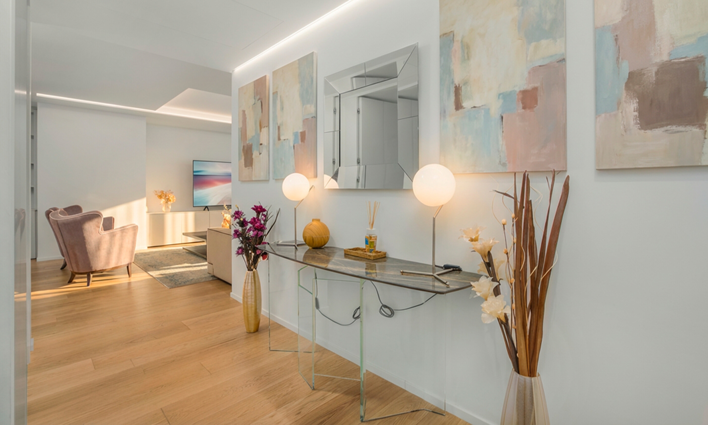 Da qui si accede alla splendida zona giorno di circa 59 mq, ampia, luminosa e armoniosamente distribuita.