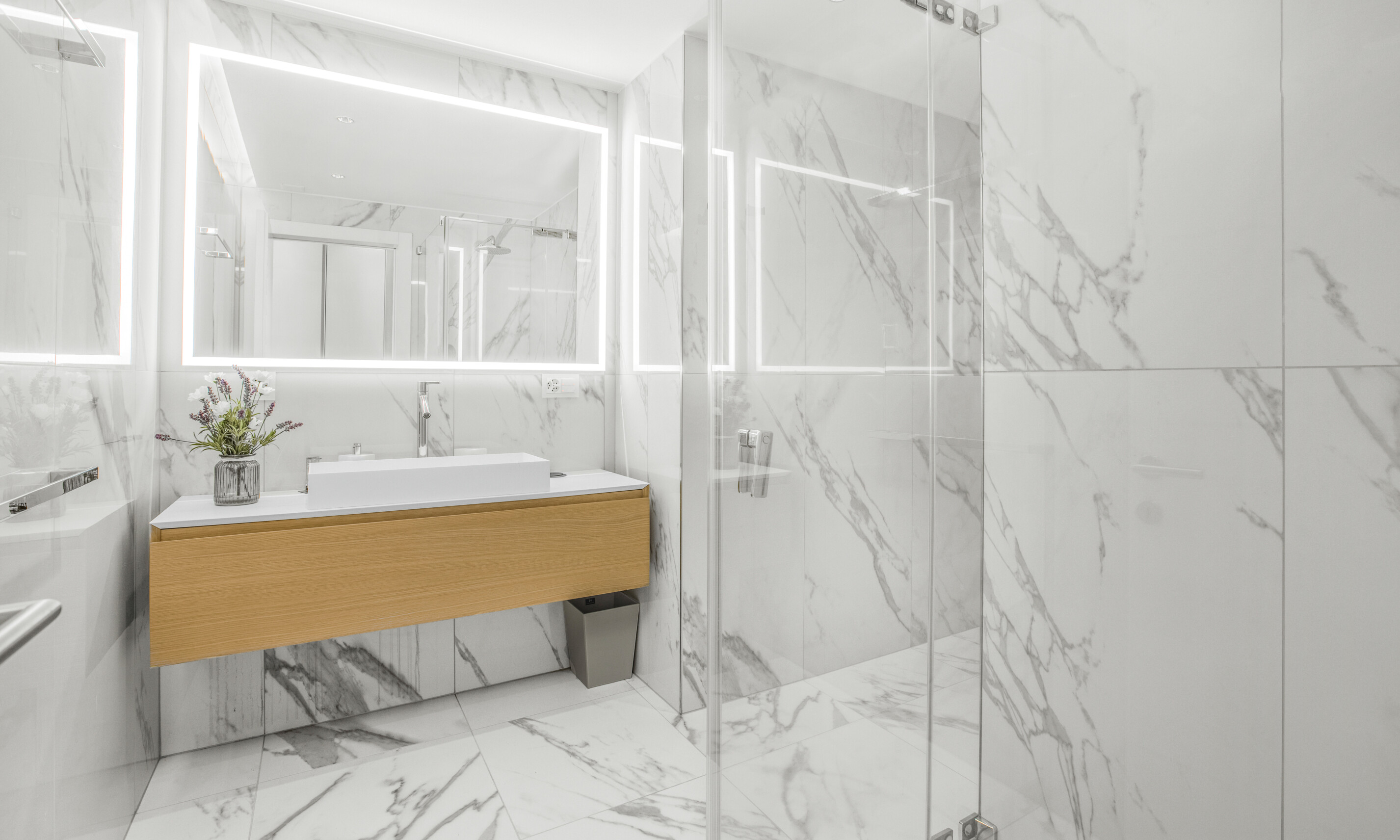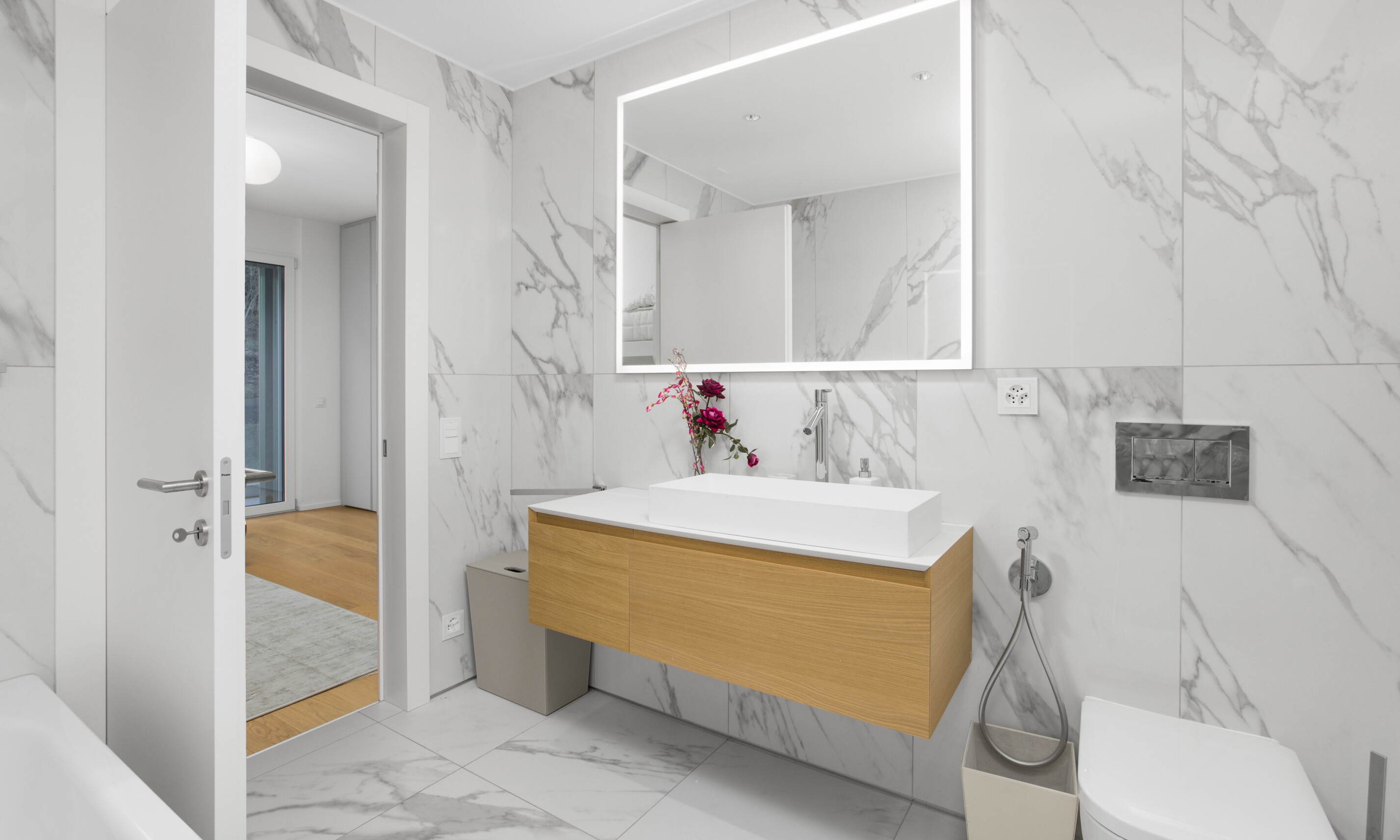 La zona giorno è servita da un moderno bagno ospiti, realizzato con materiali contemporanei e finiture di alto livello.