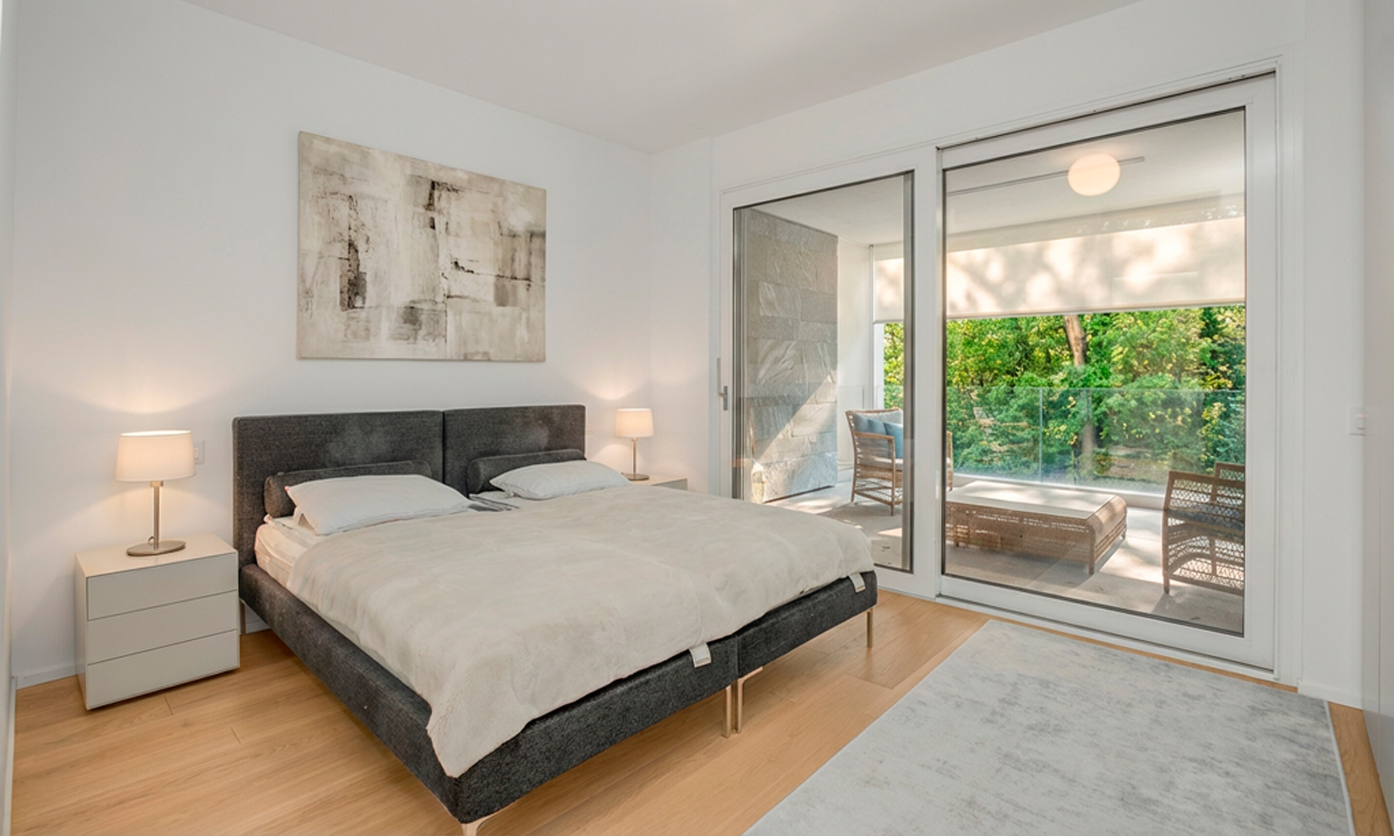 La zona notte, ben separata dalla zona giorno per garantire massima privacy, è impreziosita da pavimentazione in parquet e ospita ambienti ampi e confortevoli. La master bedroom si distingue per la sua eleganza e per la vetrata con vista lago, con accesso diretto al terrazzo coperto. La camera dispone di una spaziosa cabina armadio su misura e di un bagno en suite di circa 12 mq, finestrato, dotato di vasca, doccia e doppio lavabo.