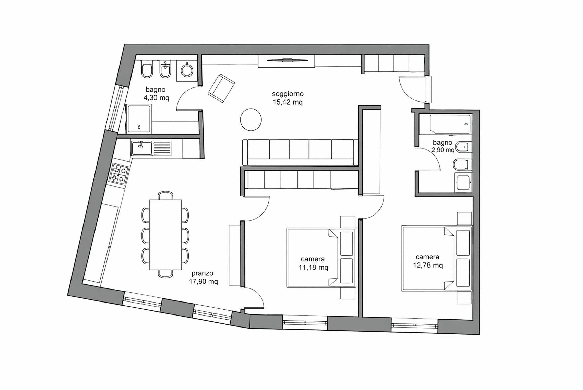 L'appartamento, con una superficie abitabile di 76 mq, è stato sapientemente ridisegnato per la massima funzionalità. E' composto da ingresso con disimpegno e armadio a muro, accesso alla zona giorno divisa tra salotto e sala da pranzo, con moderna cucina a vista e con lo spazio per un tavolo da pranzo fino a 6 posti comodi.