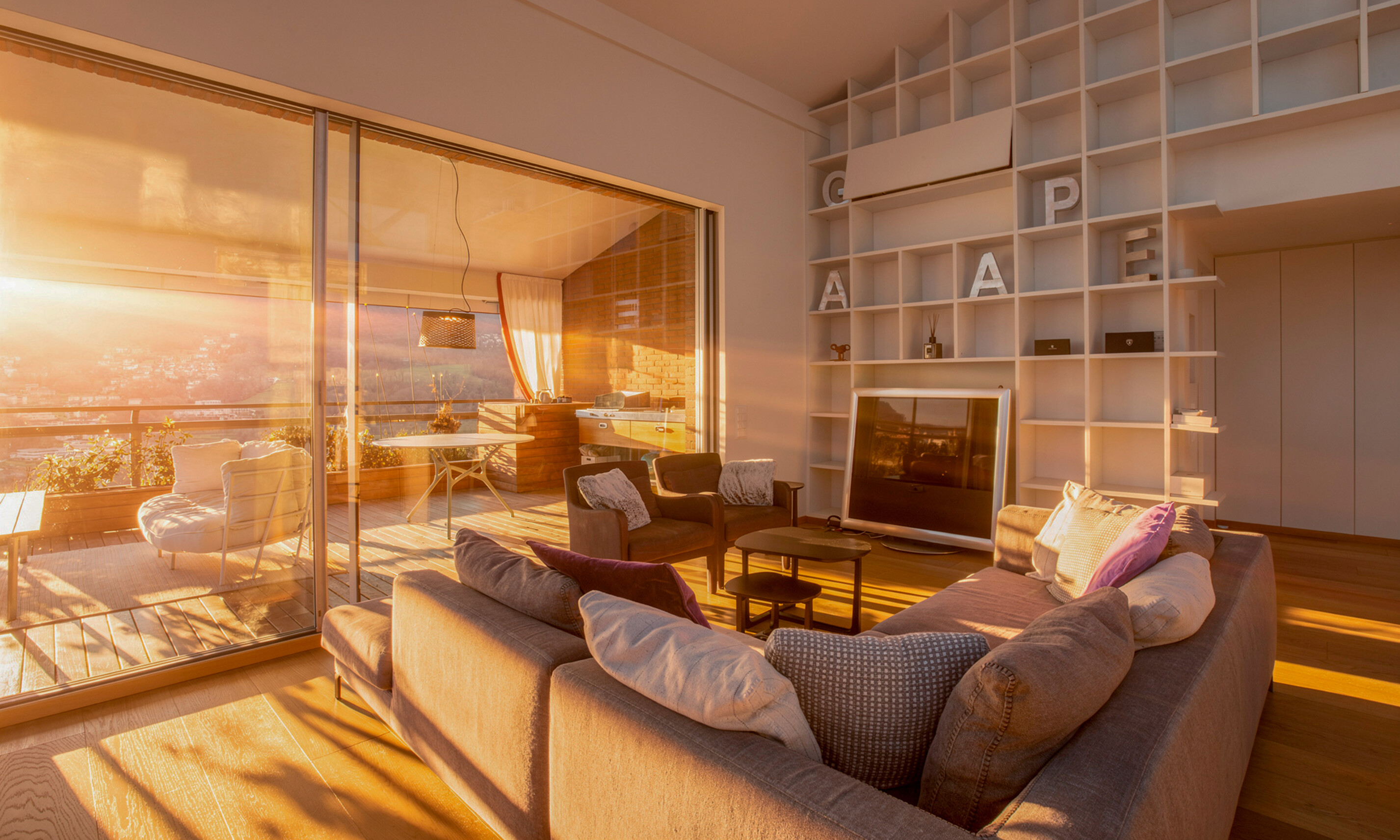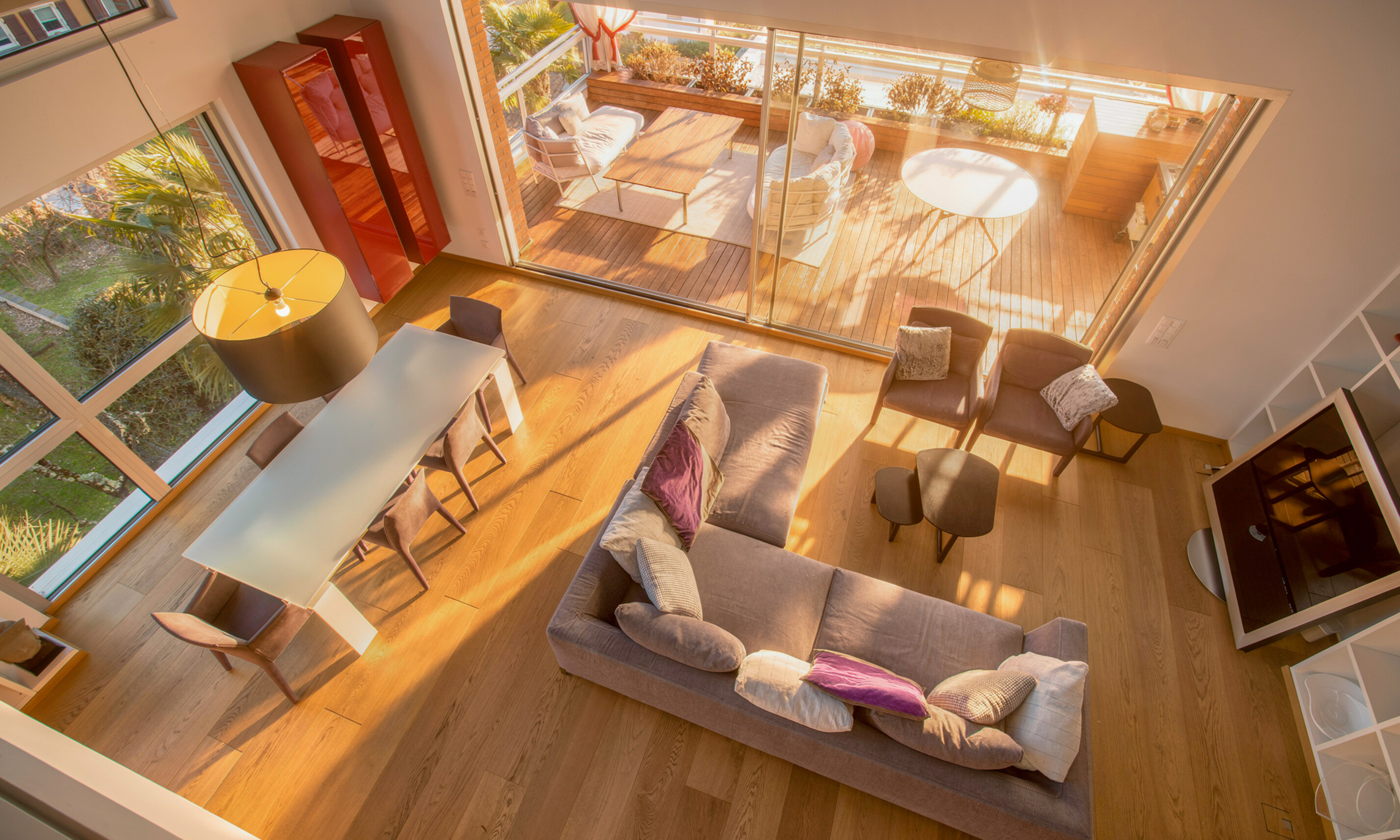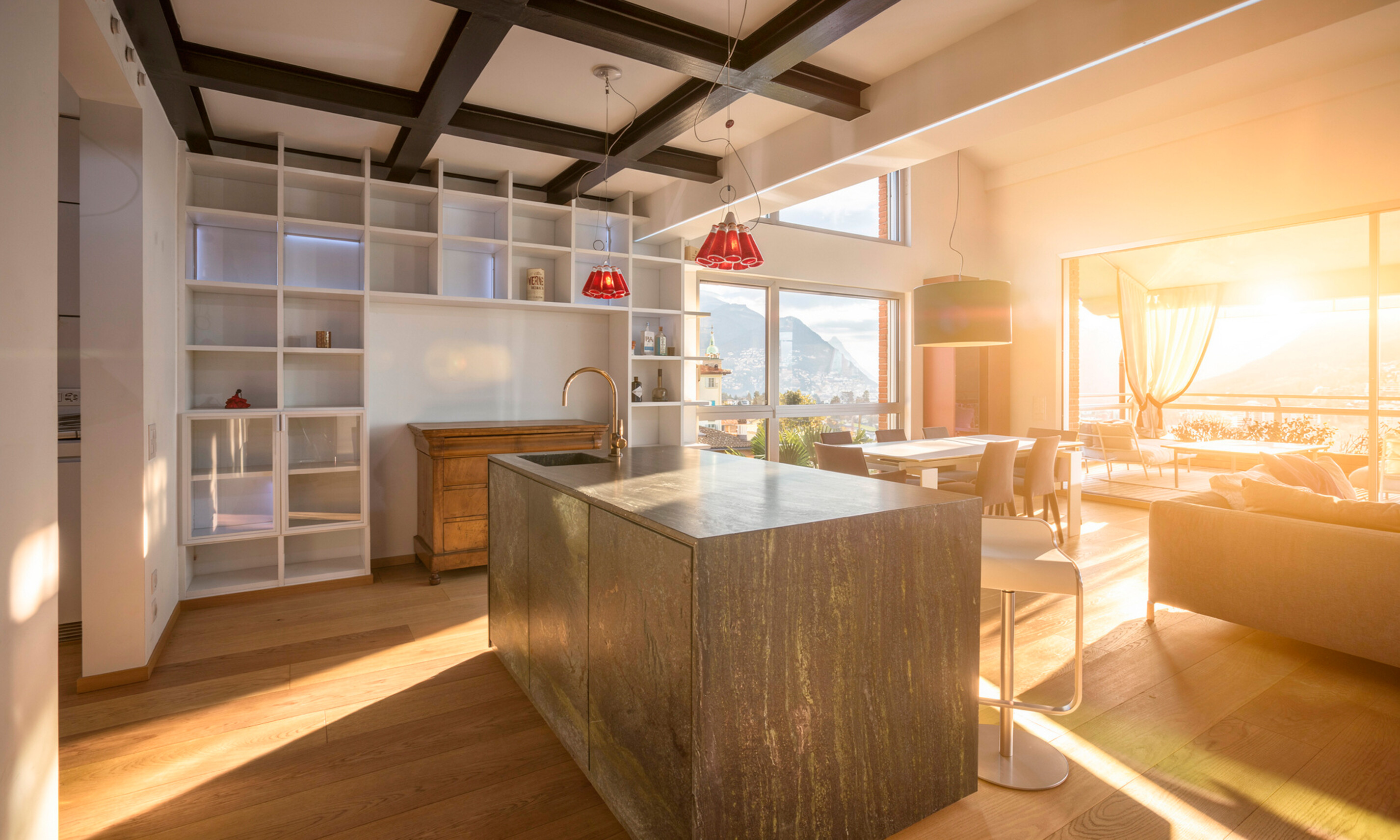 All'entrata troviamo un grande salone luminoso con soppalco e una grande terrazza coperta di 30 mq, con cucina esterna, ideale per rilassarsi e godere del bellissimo panorama sulla città e sul lago. La cucina ampia e spaziosa creata su misura da Bulthaup offre un ambiente piacevole e conviviale. Dotata di ogni comfort, dalla quale si può accedere al locale dispensa e stireria. Allo stesso piano un servizio ospiti e una grande camera con bagno suite e cabina armadio.