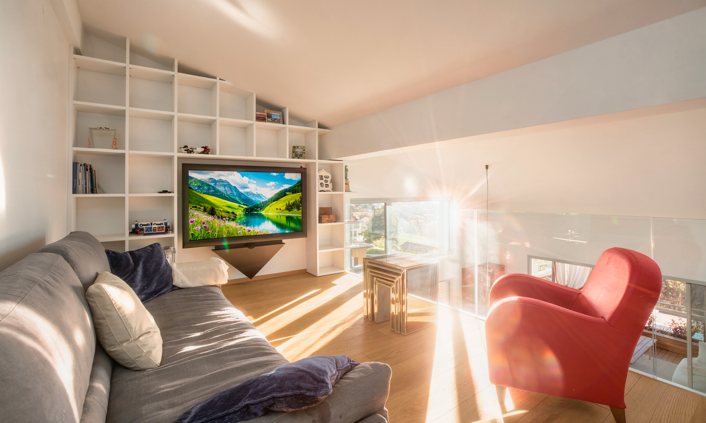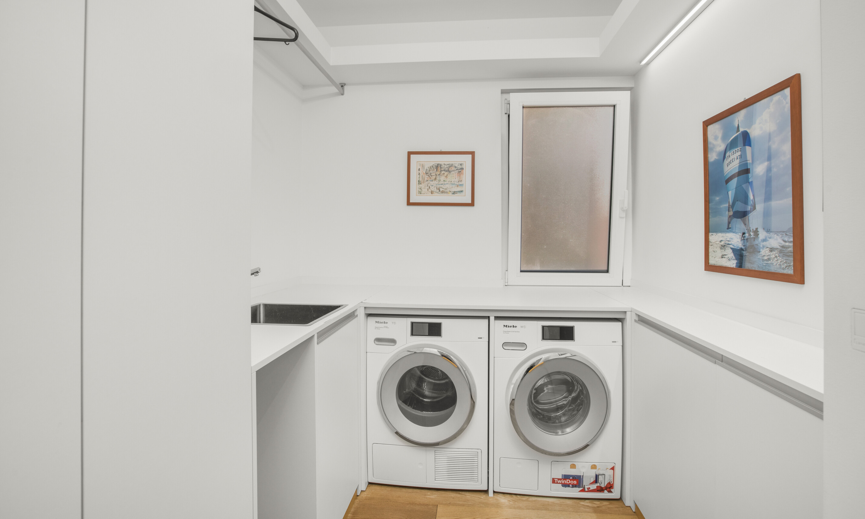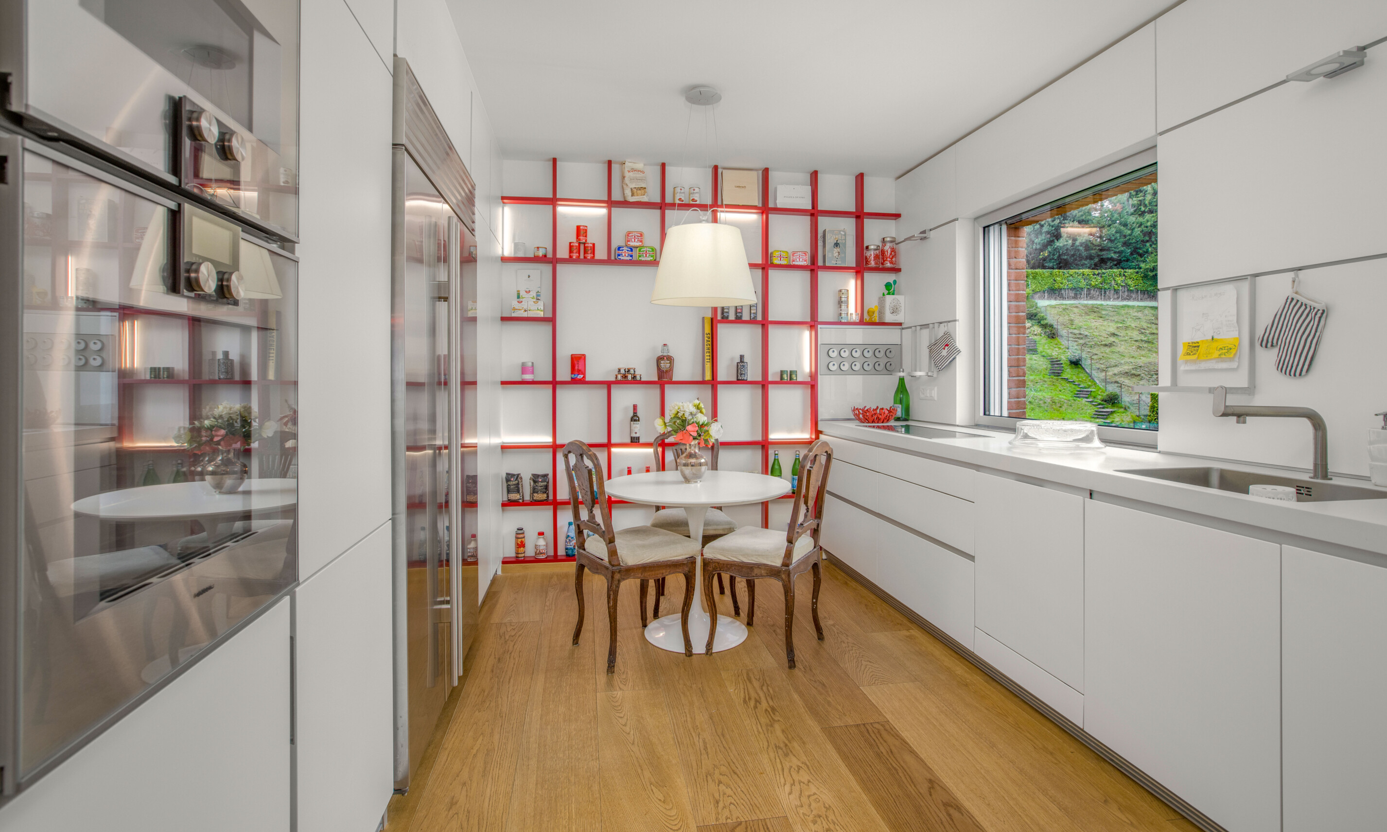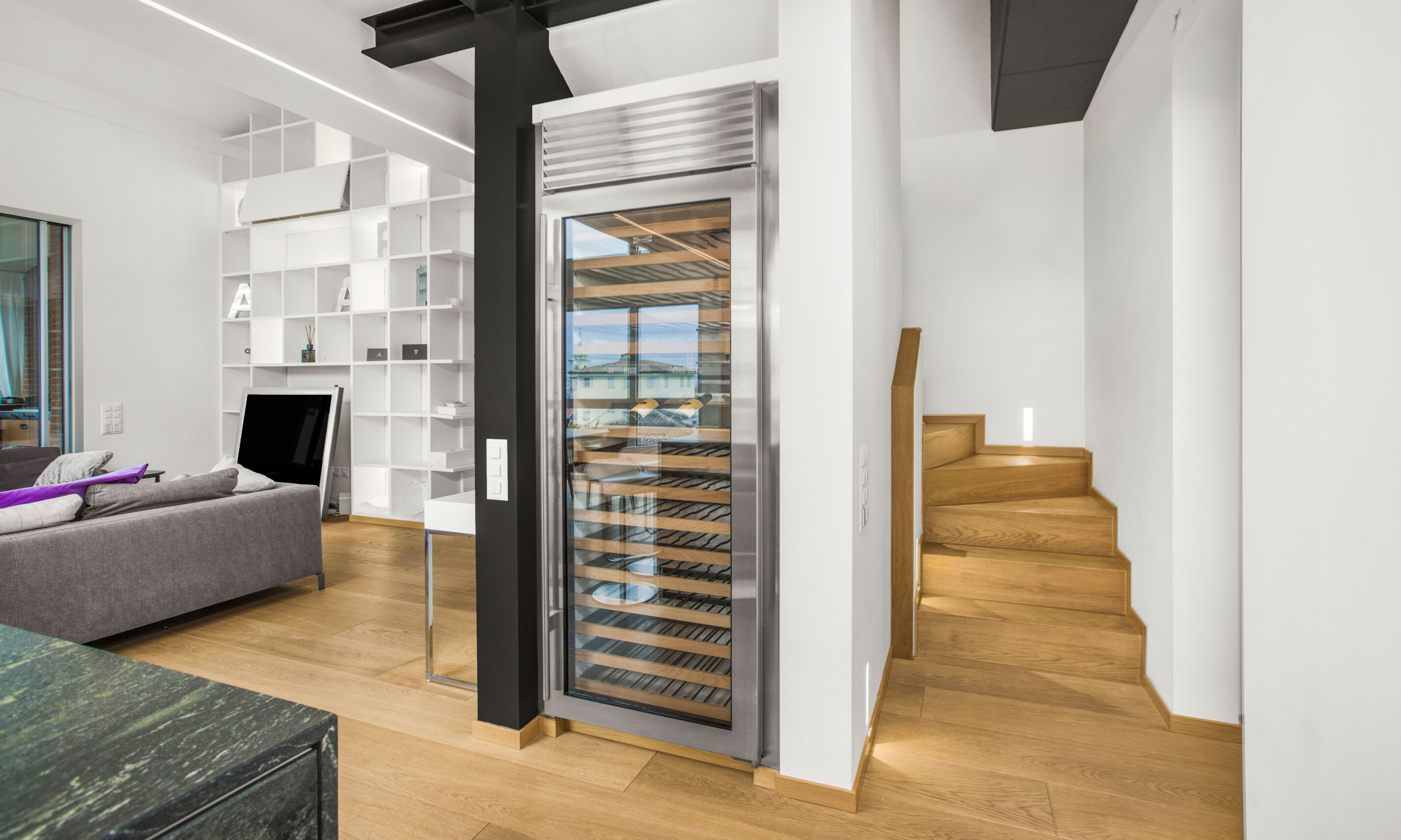 All'entrata troviamo un grande salone luminoso con soppalco e una grande terrazza coperta di 30 mq, con cucina esterna, ideale per rilassarsi e godere del bellissimo panorama sulla città e sul lago. La cucina ampia e spaziosa creata su misura da Bulthaup offre un ambiente piacevole e conviviale. Dotata di ogni comfort, dalla quale si può accedere al locale dispensa e stireria. Allo stesso piano un servizio ospiti e una grande camera con bagno suite e cabina armadio.