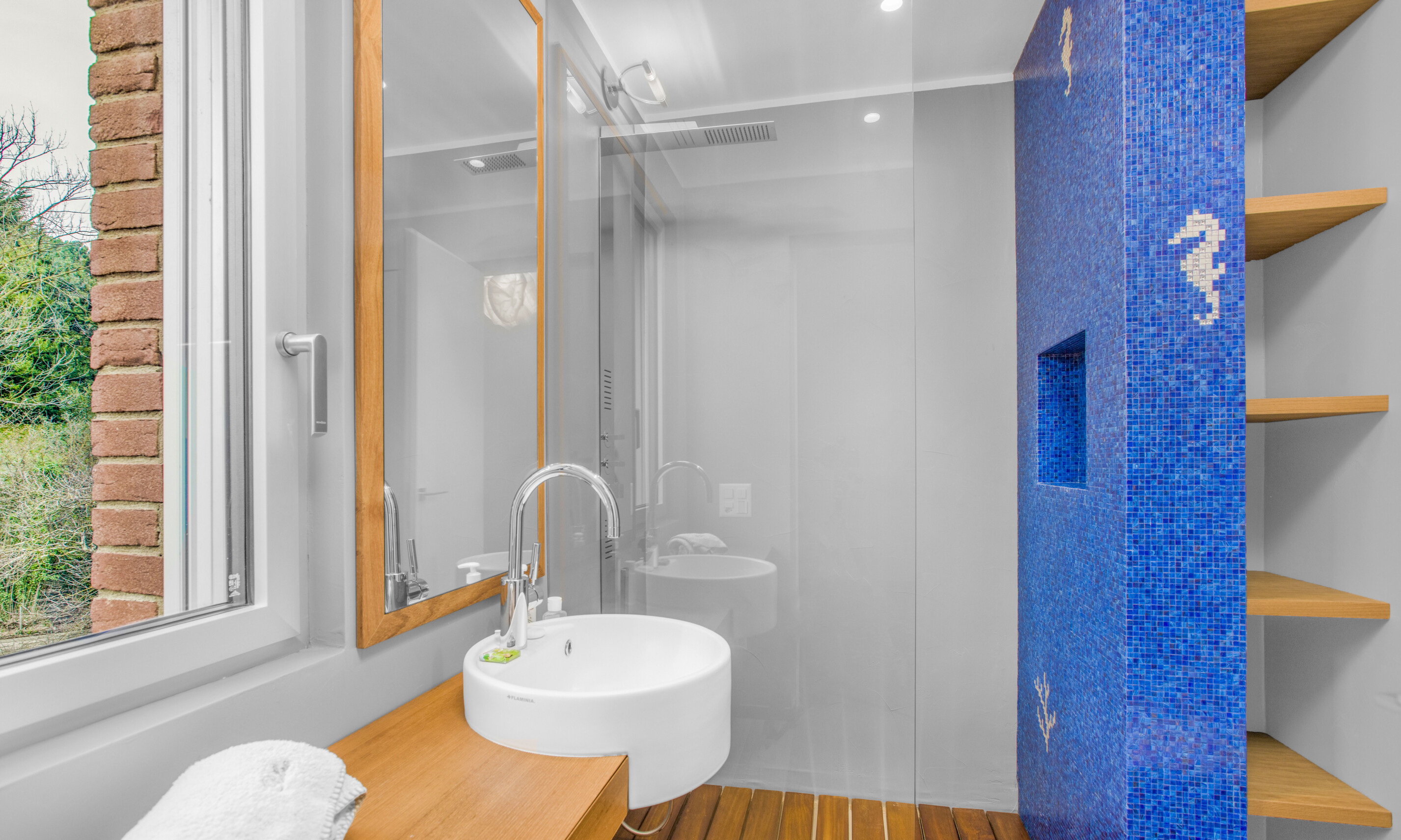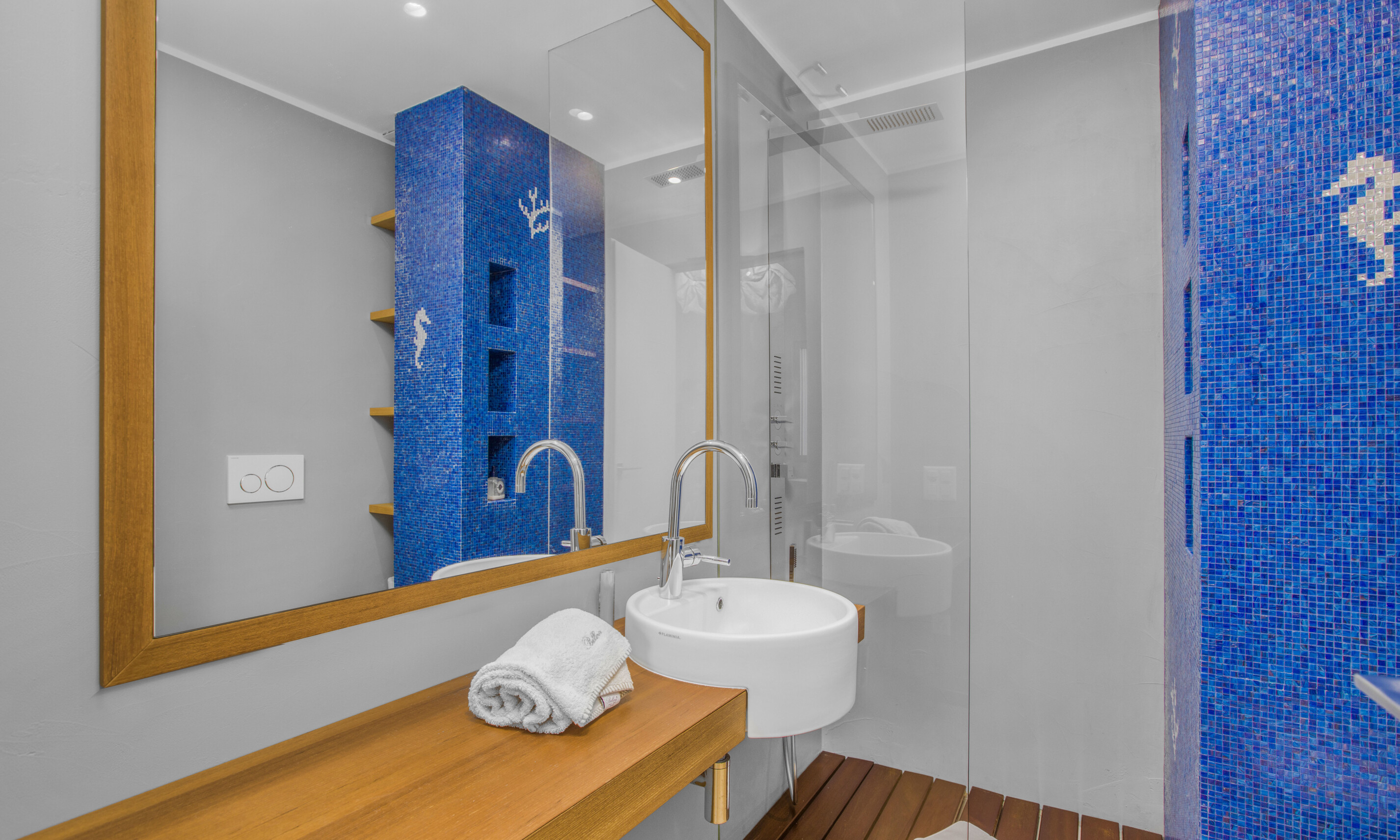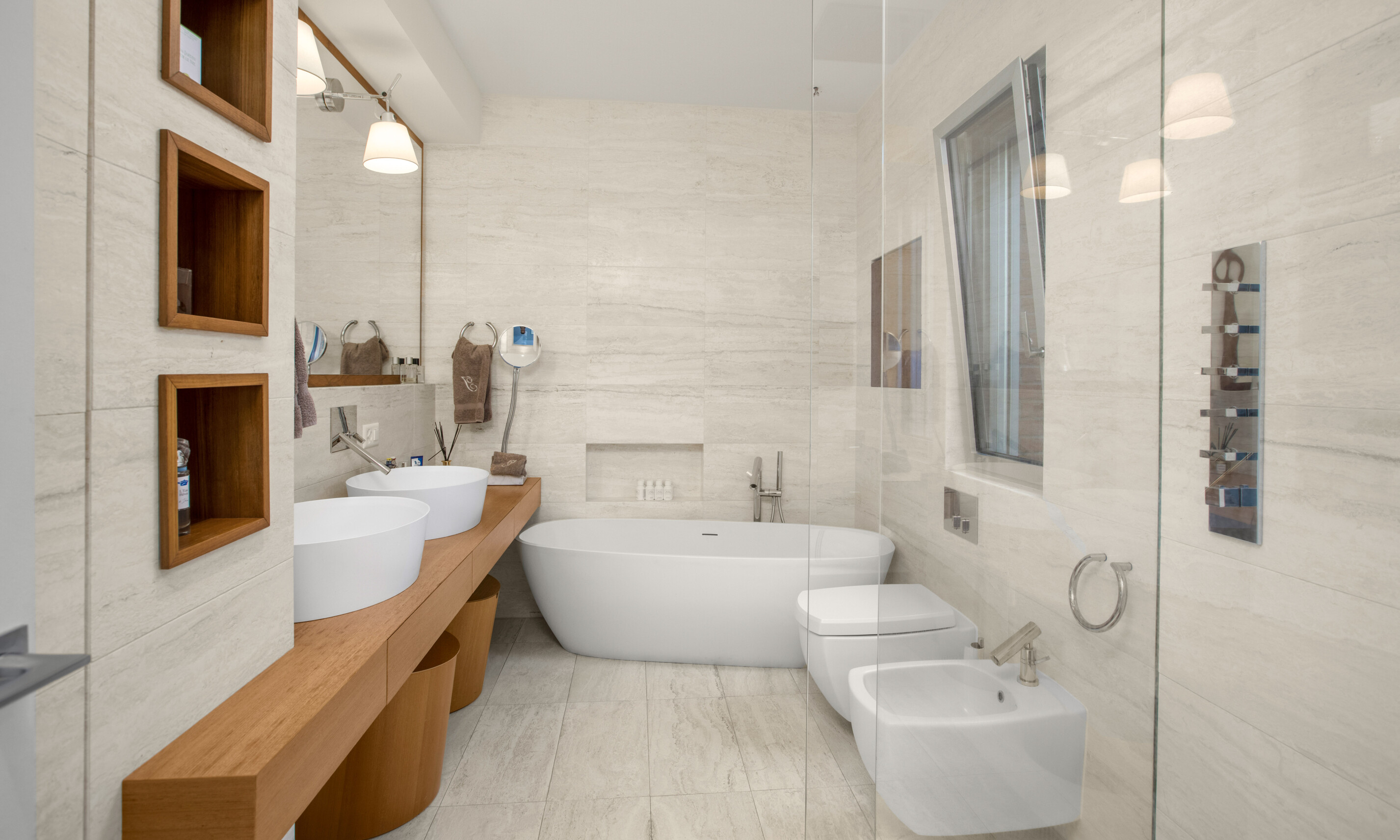 Tutti i materiali sono di pregio, i bagni Silverline hanno armadiature su misura, rivestiti di travertino, i pavimenti di rovere massiccio, alcuni ambienti hanno porte ricavate da case e conventi del 600/800 AC.