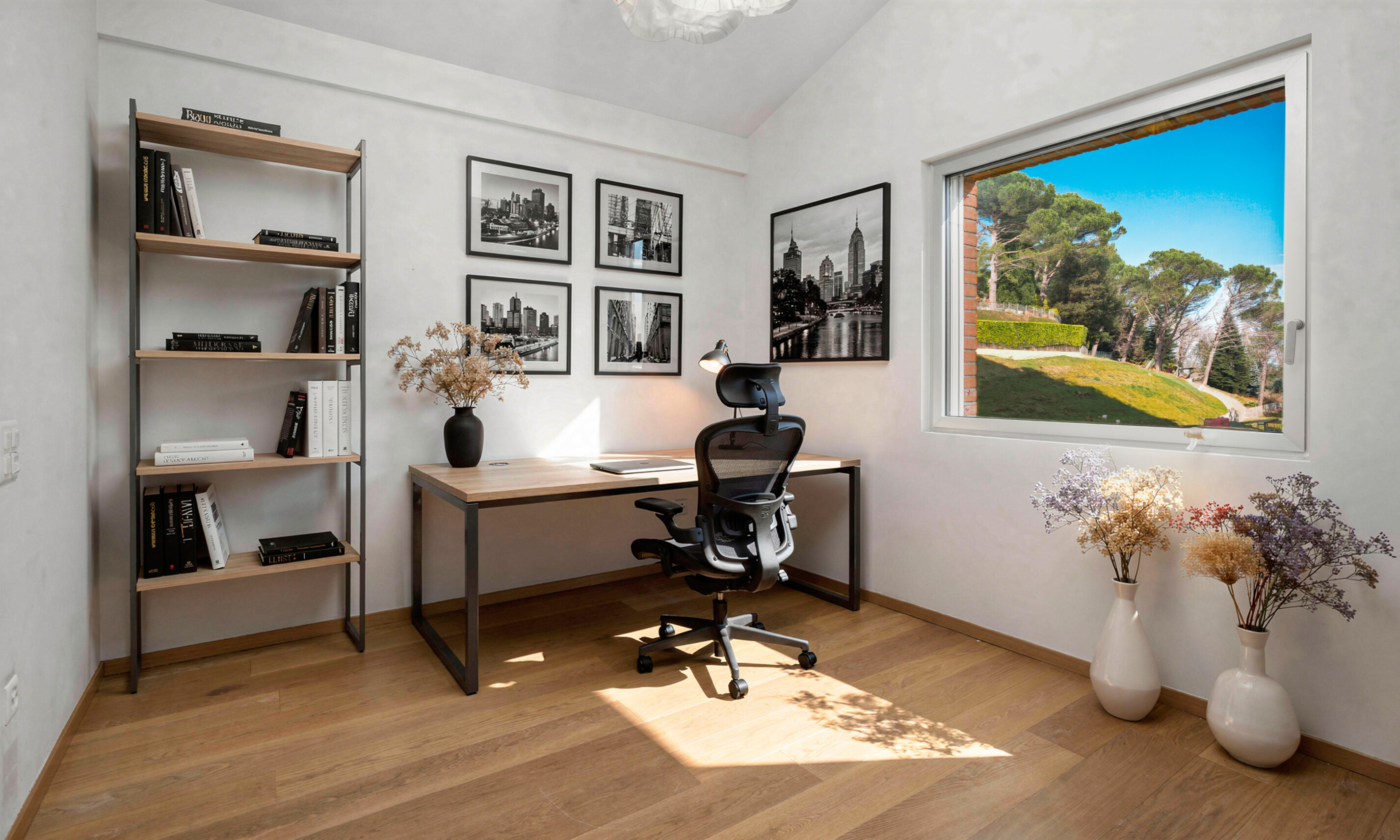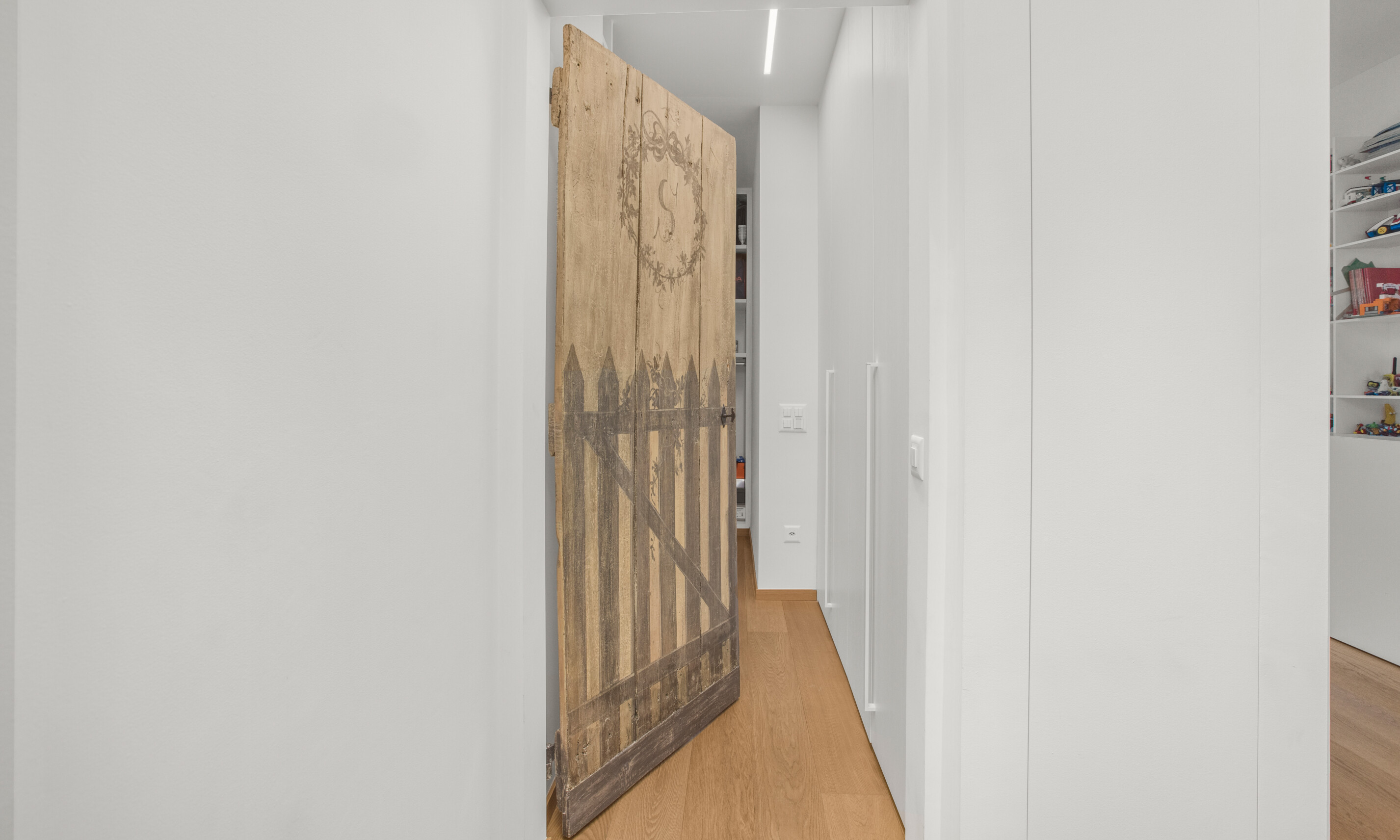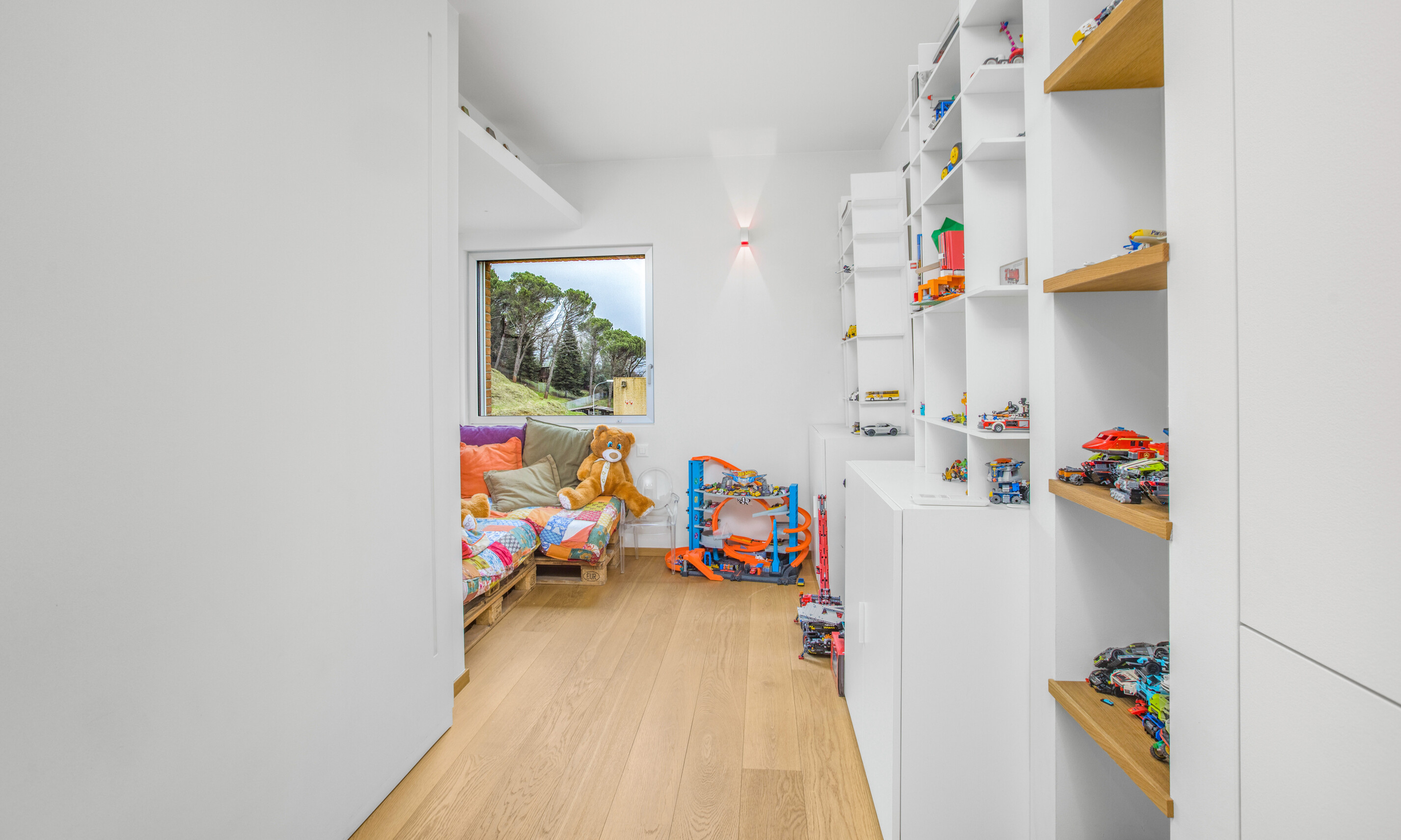 Al PIANO SUPERIORE un grande soppalco con camera studio e vista sul soggiorno e 4 camere, dotate di armadiatura su misura, con bagno annesso per ciascuna di esse.